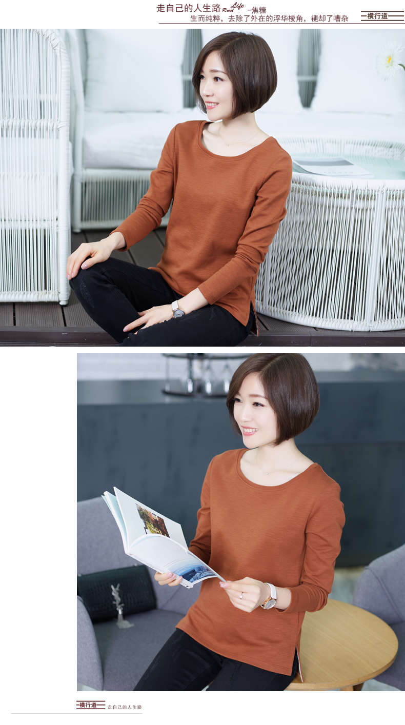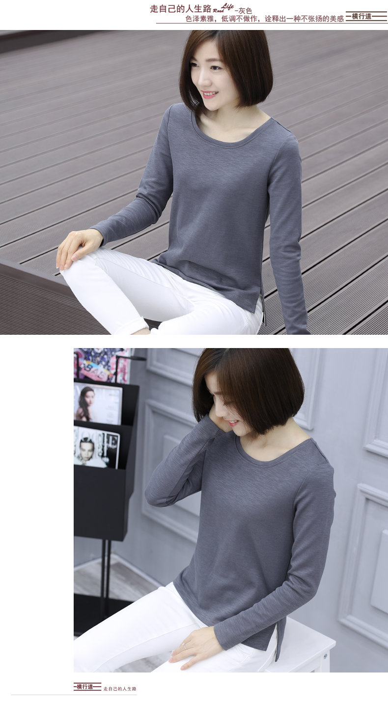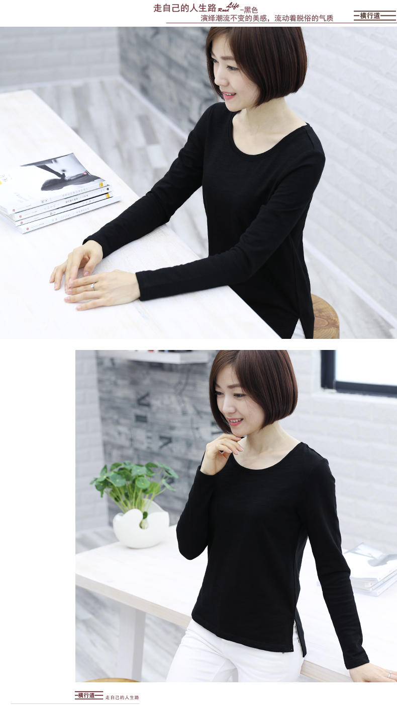 2019新款女裝秋裝韓版竹節棉寬松長袖圓領T恤打底衫開叉上衣大碼1入