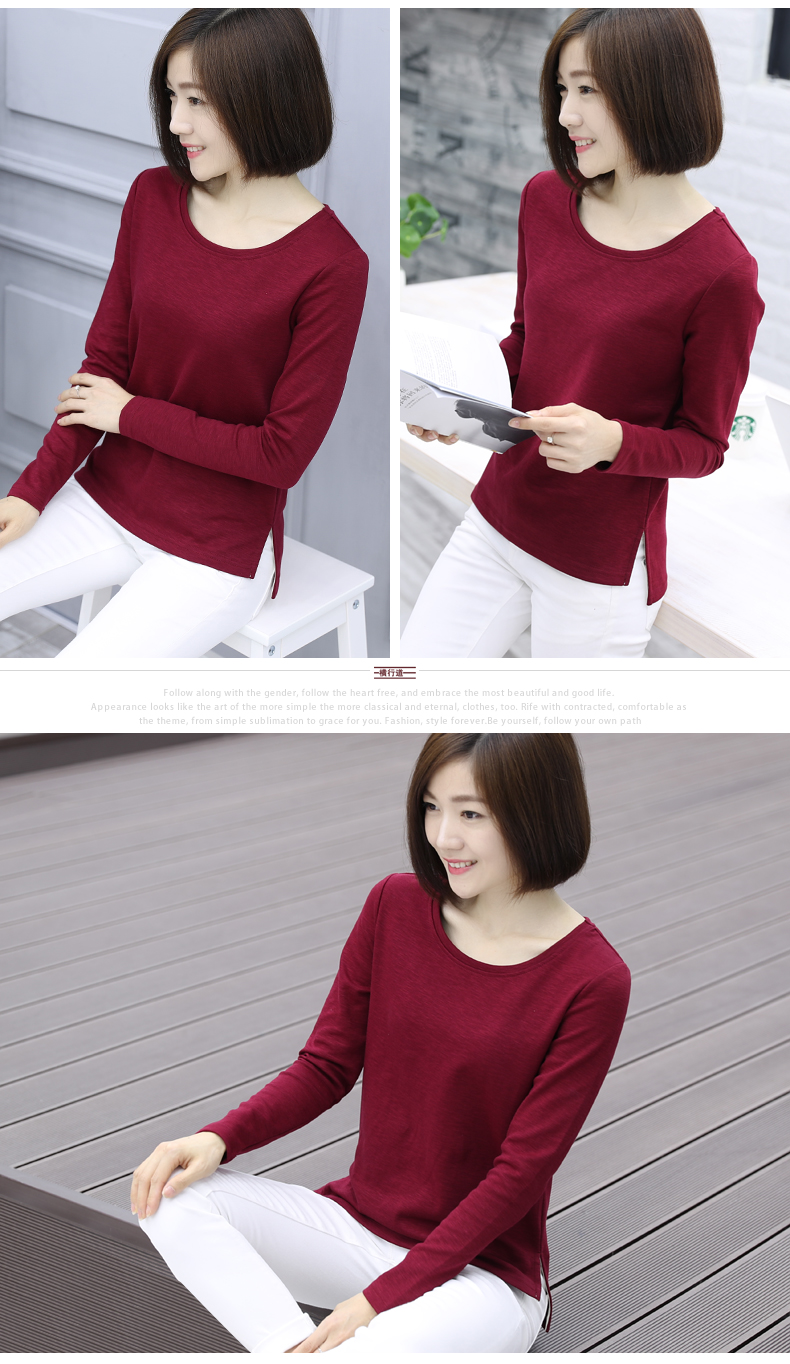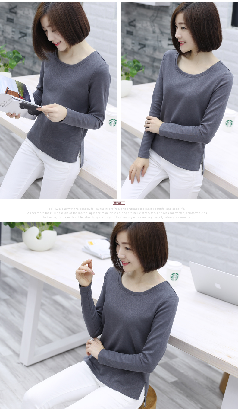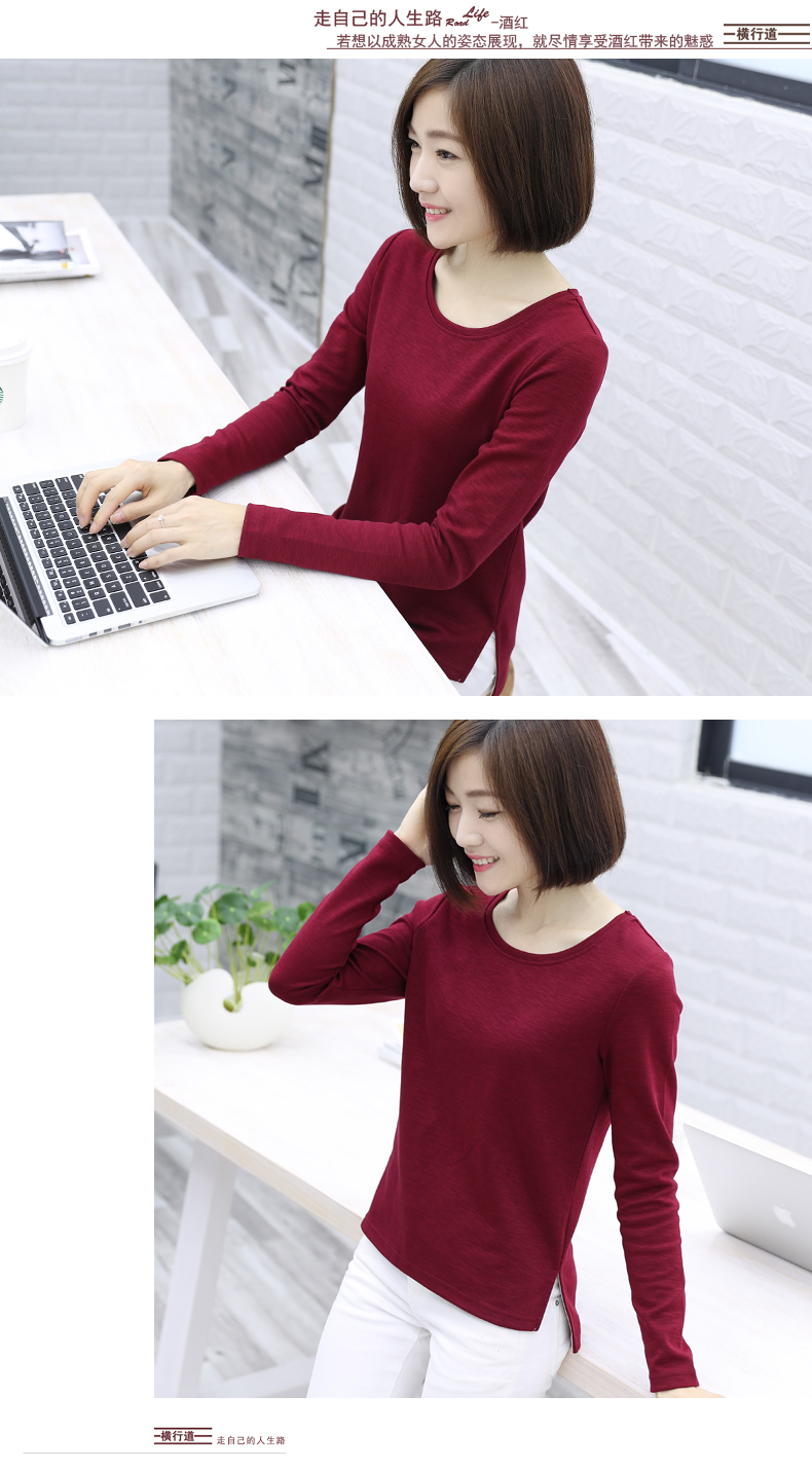 2019新款女裝秋裝韓版竹節棉寬松長袖圓領T恤打底衫開叉上衣大碼1入