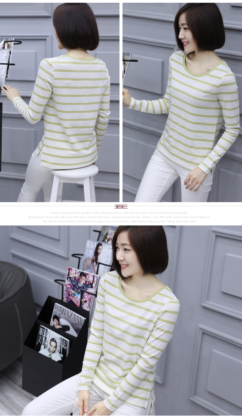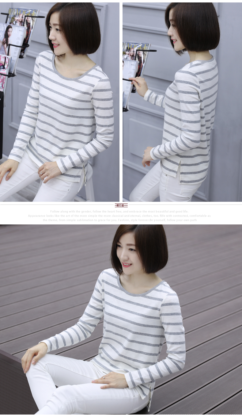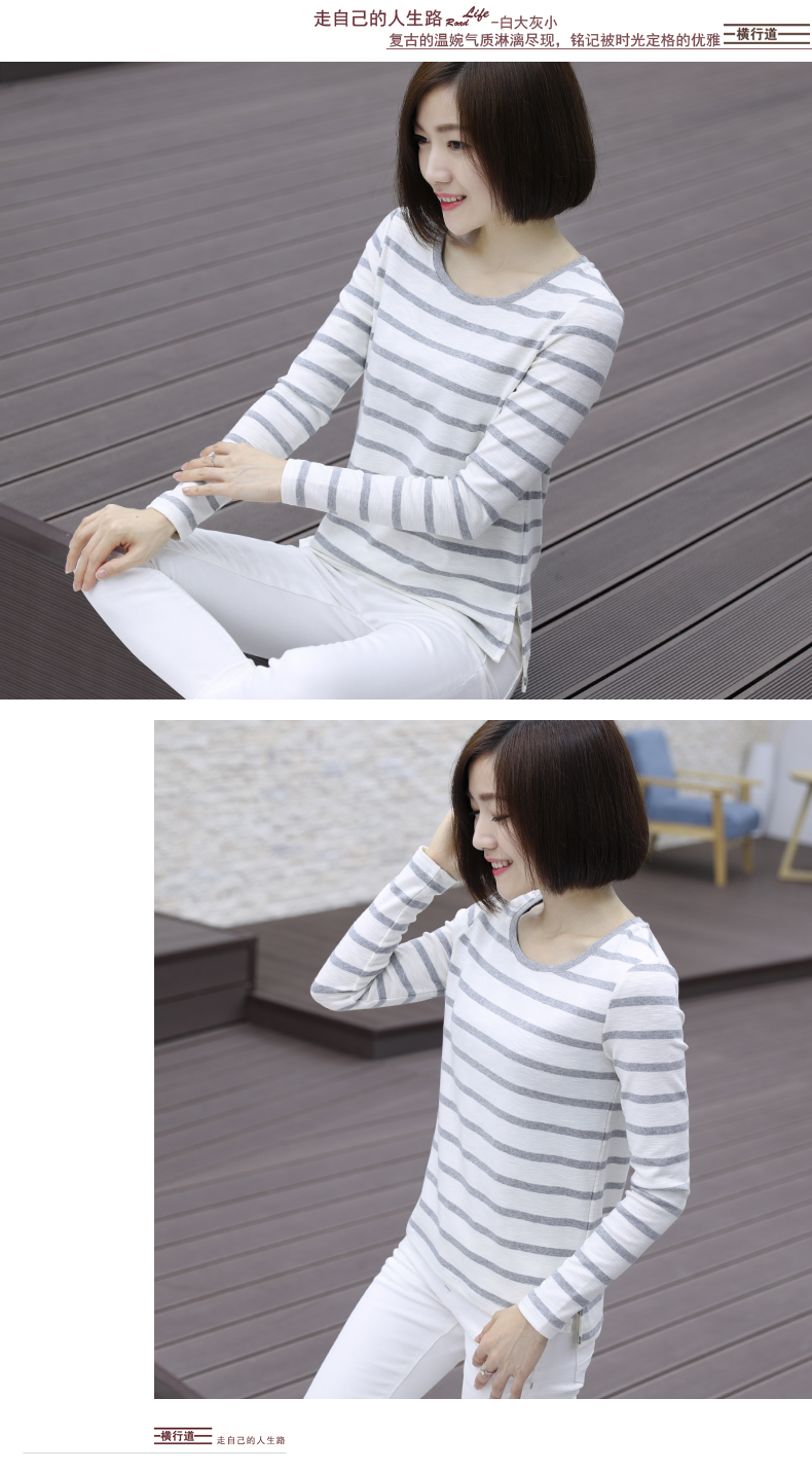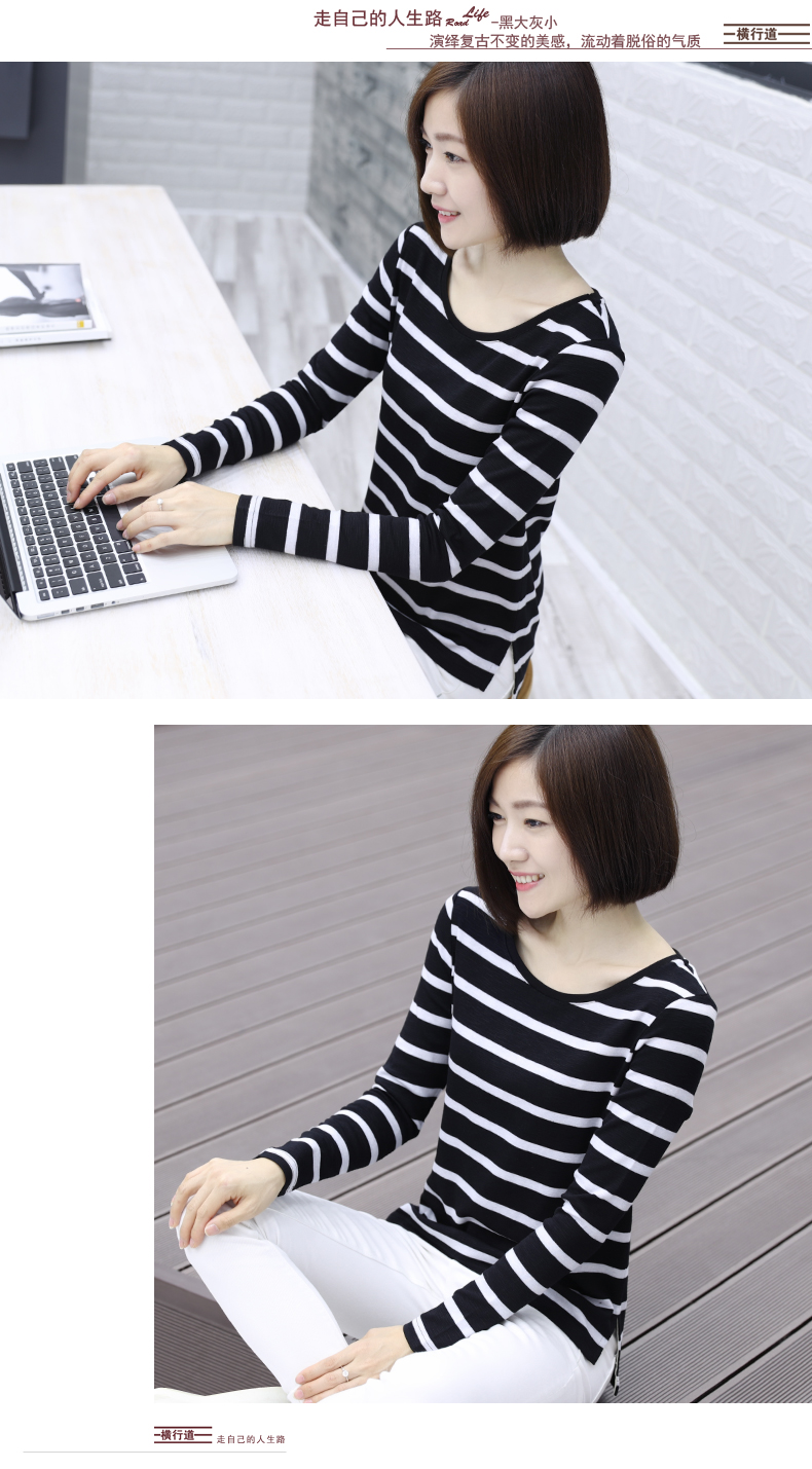 2019秋裝新款女裝大碼條紋長袖t恤寬松休閑開叉打底圓領上衣外穿1入