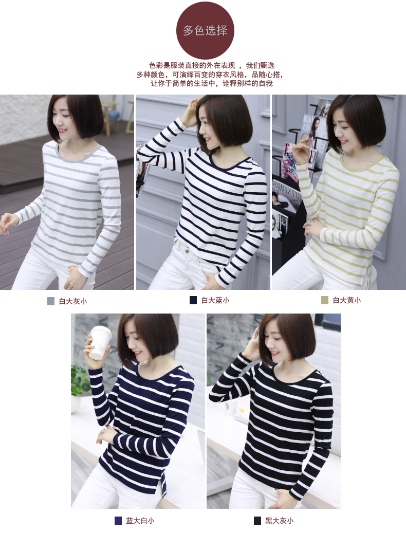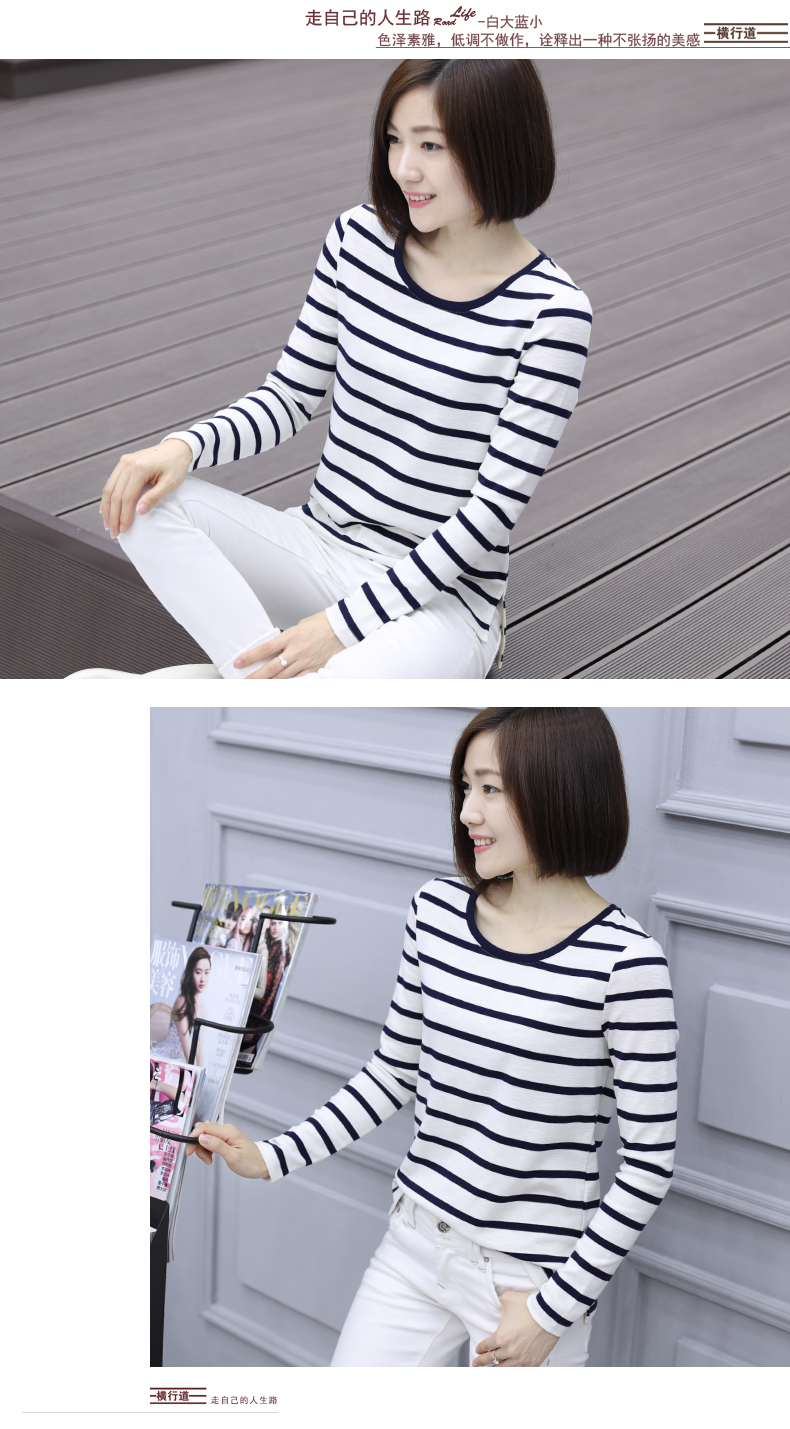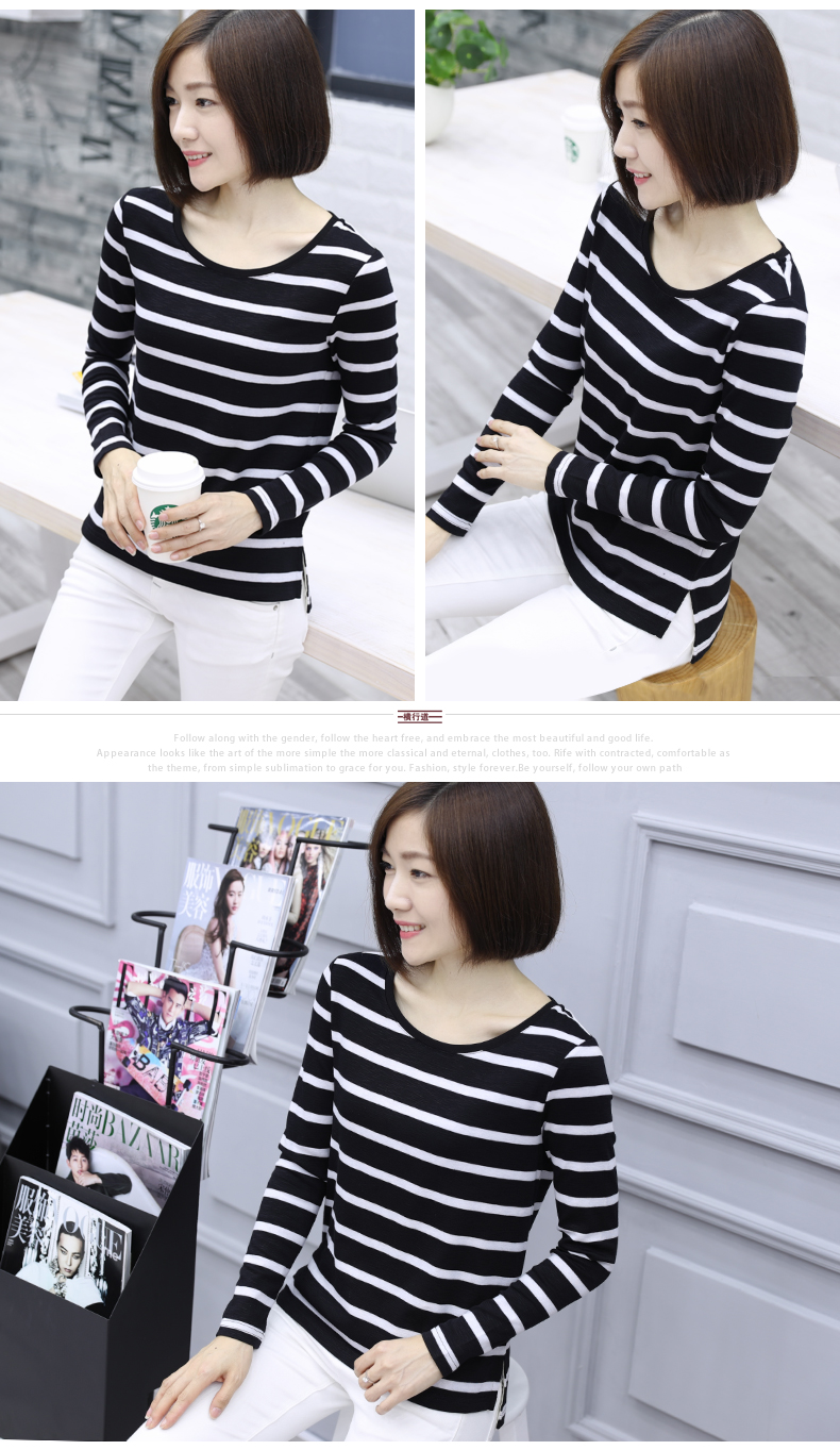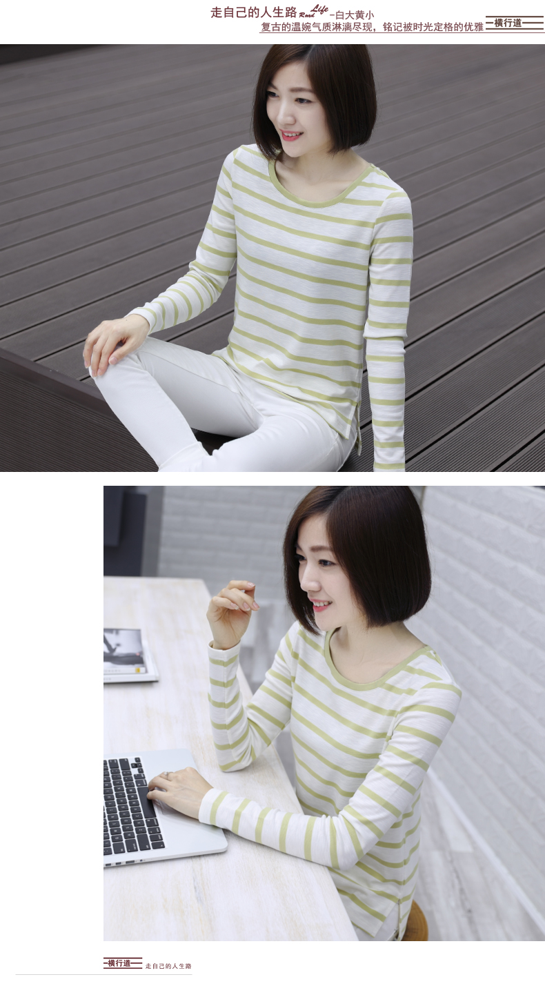 2019秋裝新款女裝大碼條紋長袖t恤寬松休閑開叉打底圓領上衣外穿1入