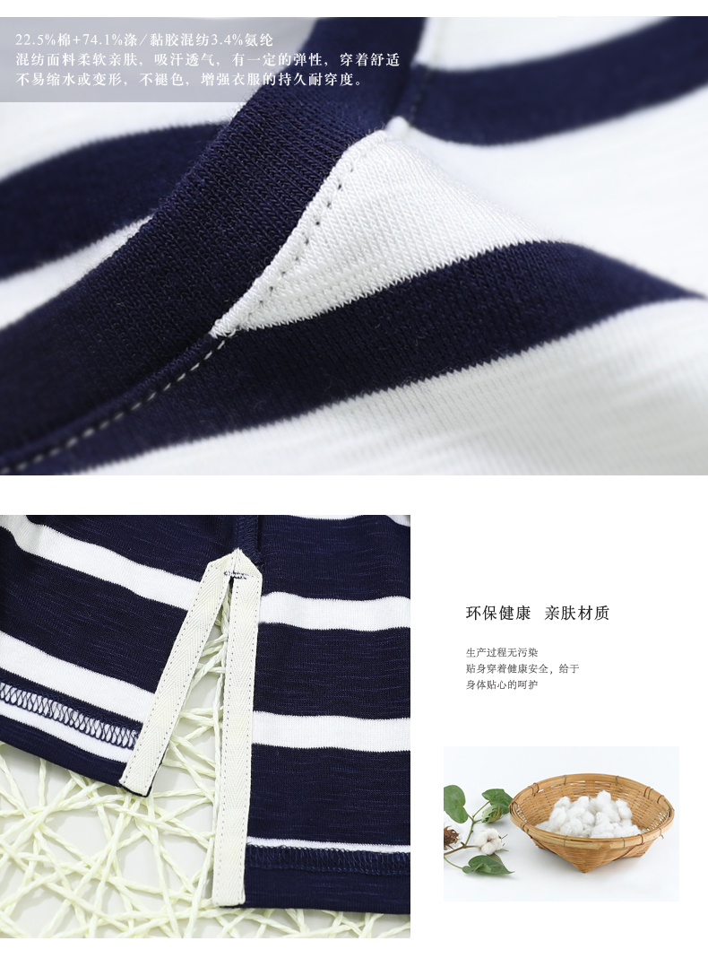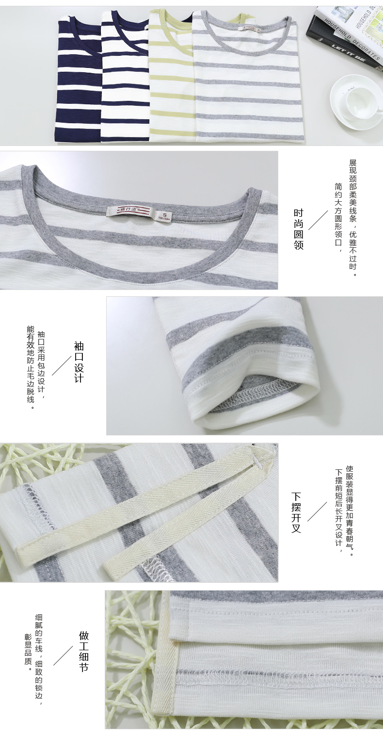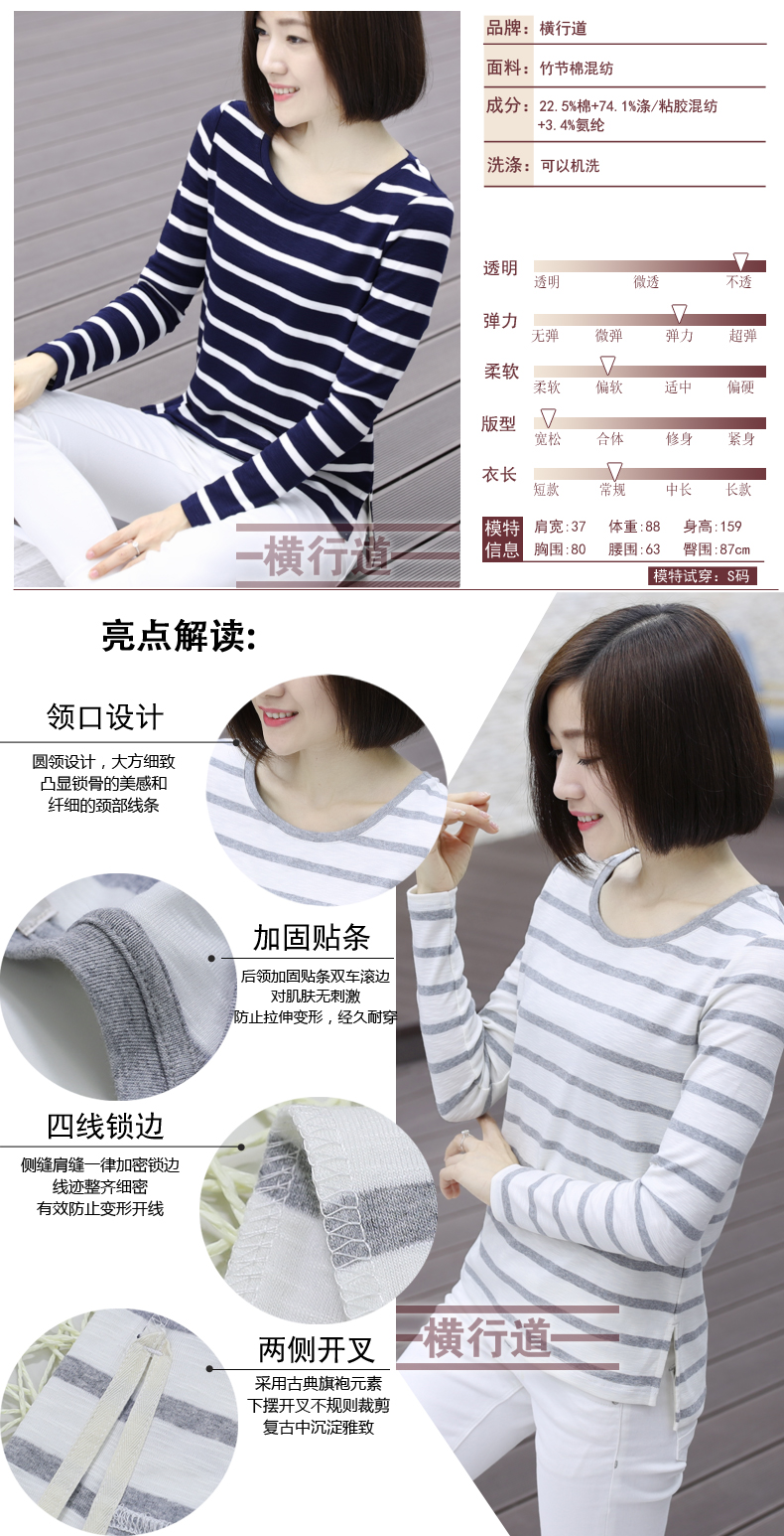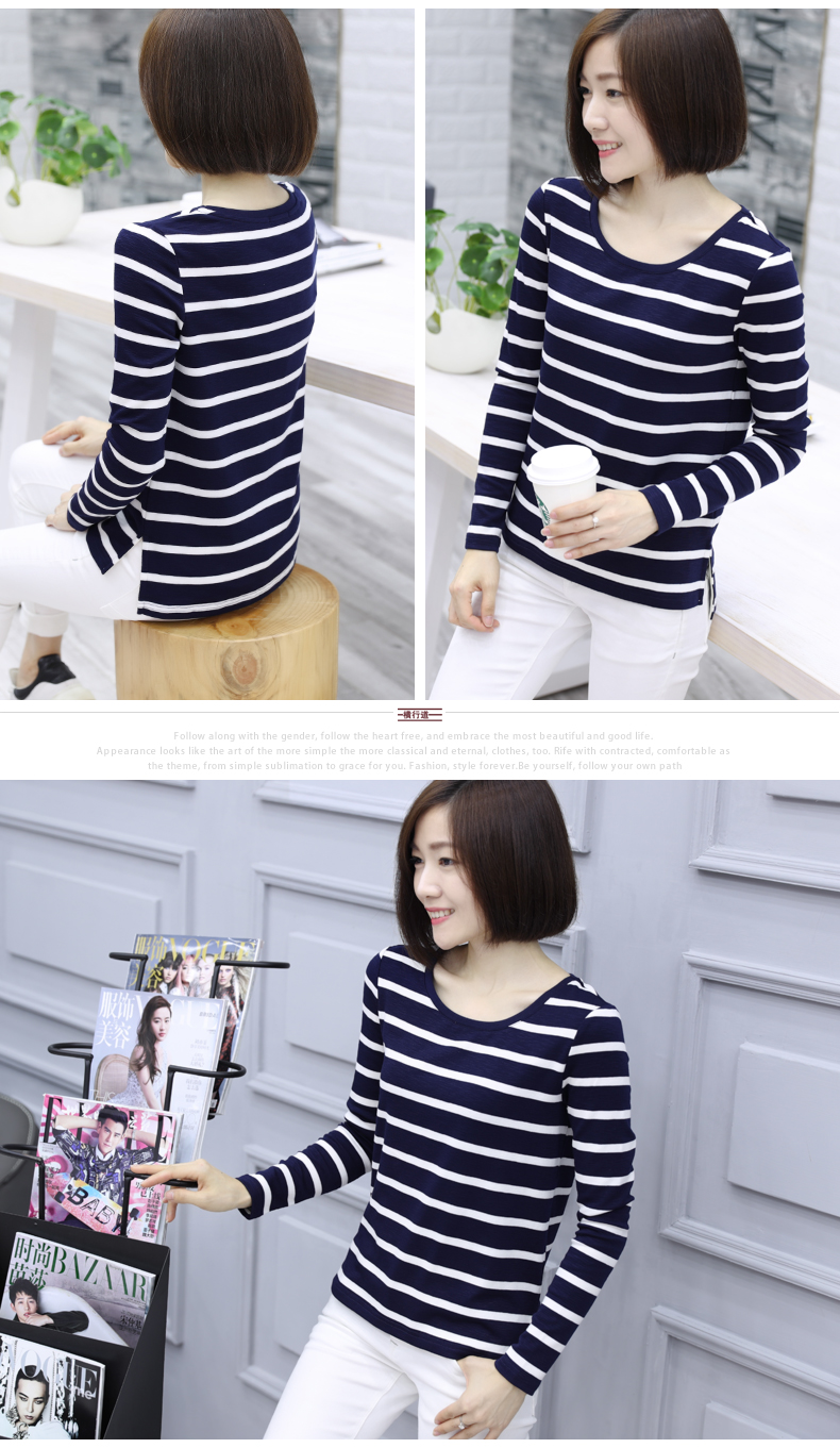 2019秋裝新款女裝大碼條紋長袖t恤寬松休閑開叉打底圓領上衣外穿1入