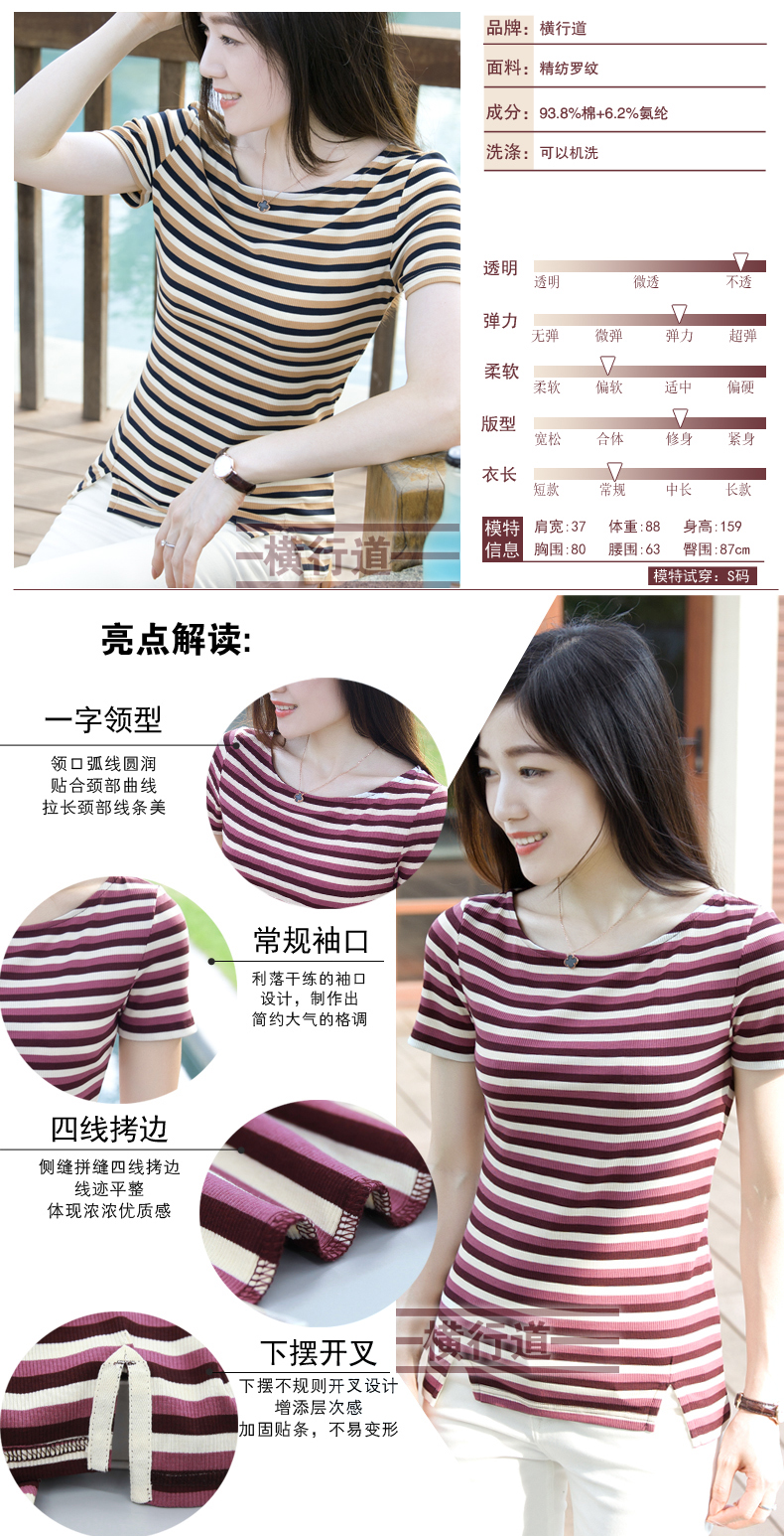 2019新款夏裝橫條紋t恤女短袖韓版棉質體恤半袖一字領上衣女裝潮1入