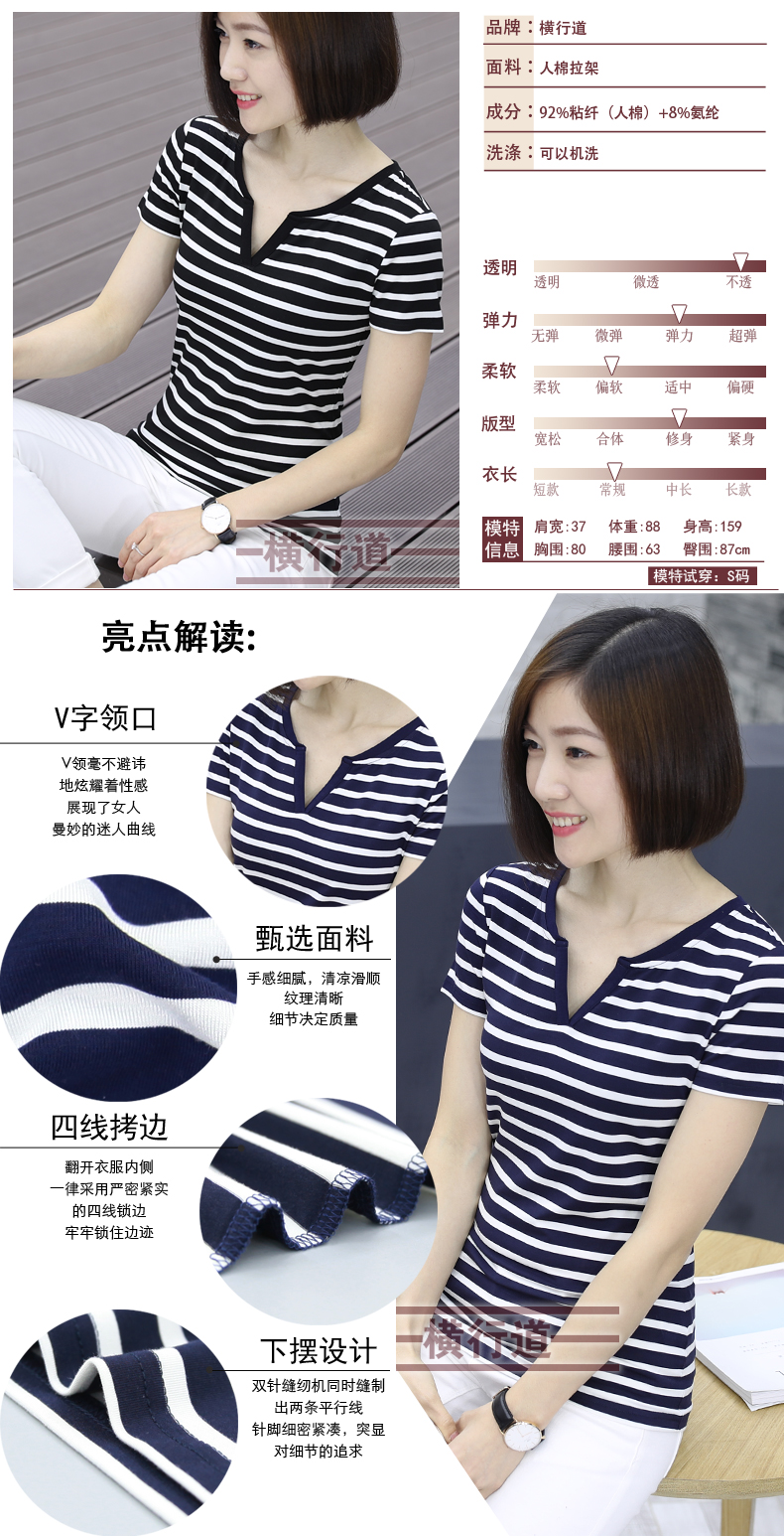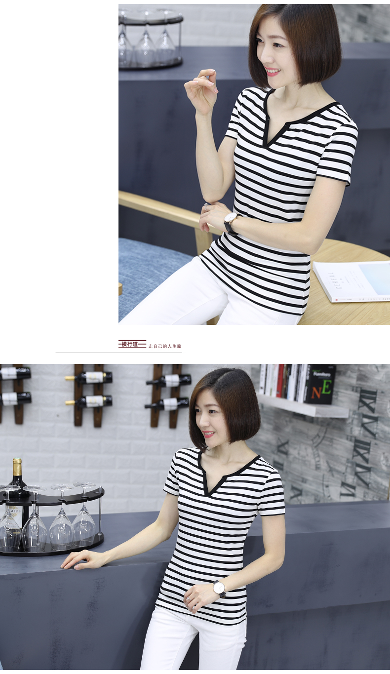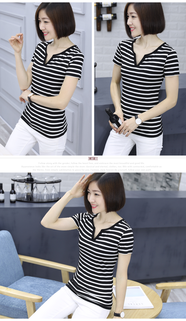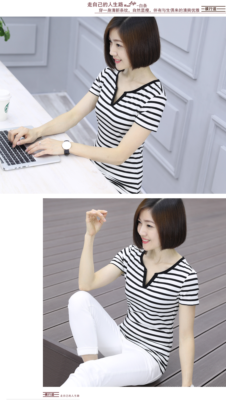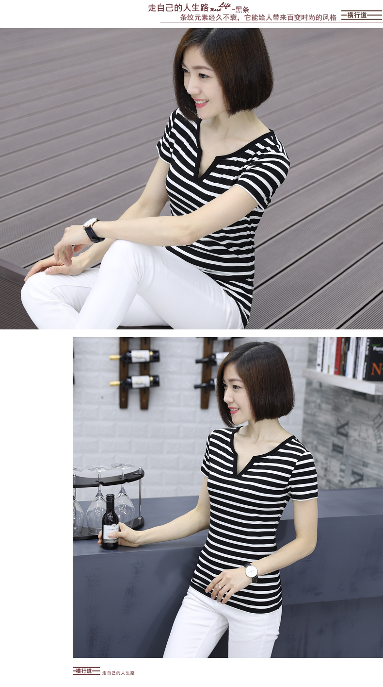 黑白條紋女T恤上衣中年顯瘦短袖大碼寬松夏裝莫代爾V領海魂衫女士1入