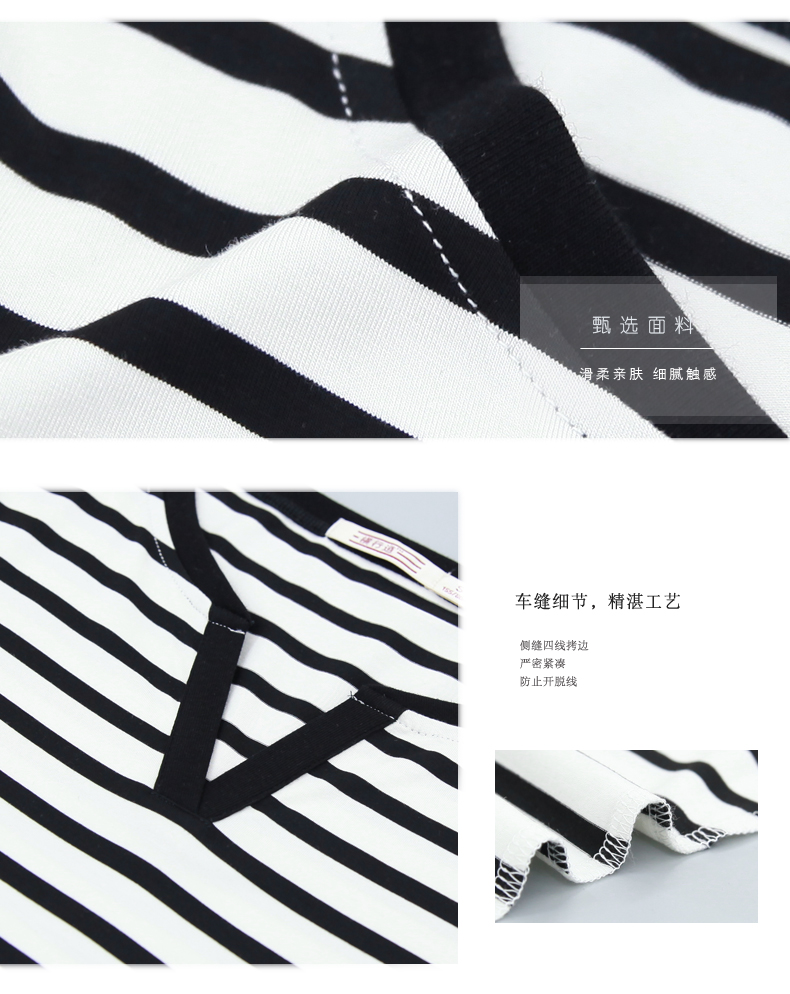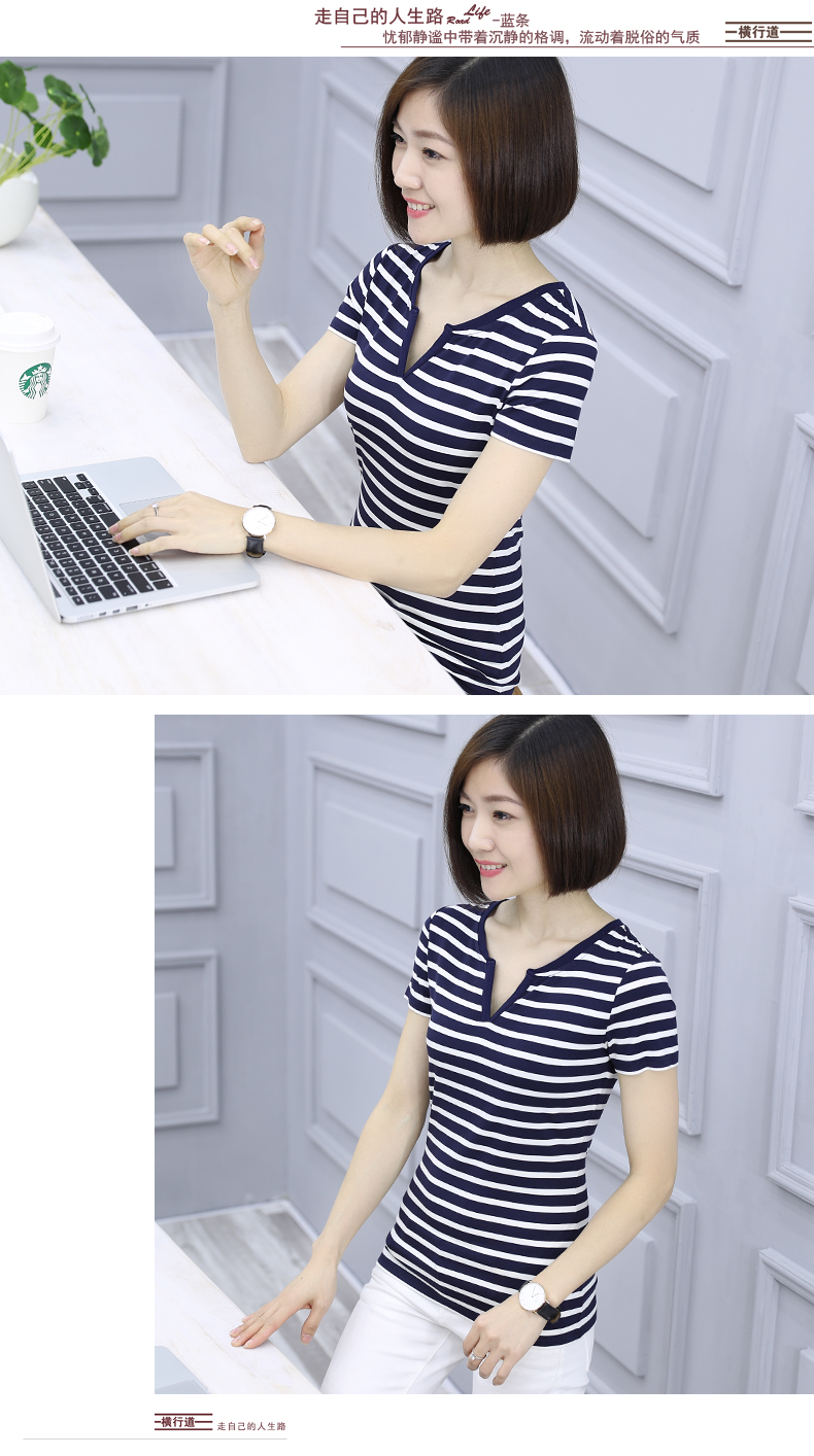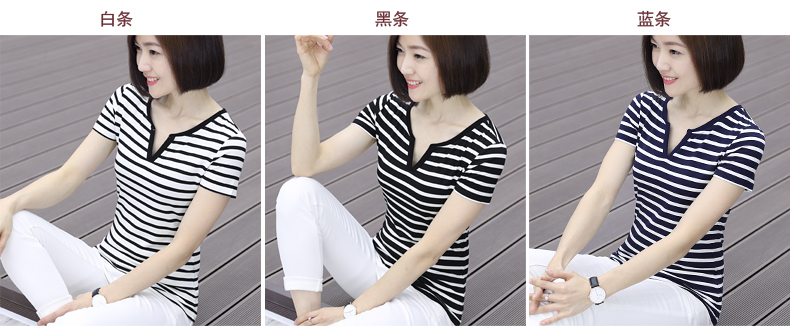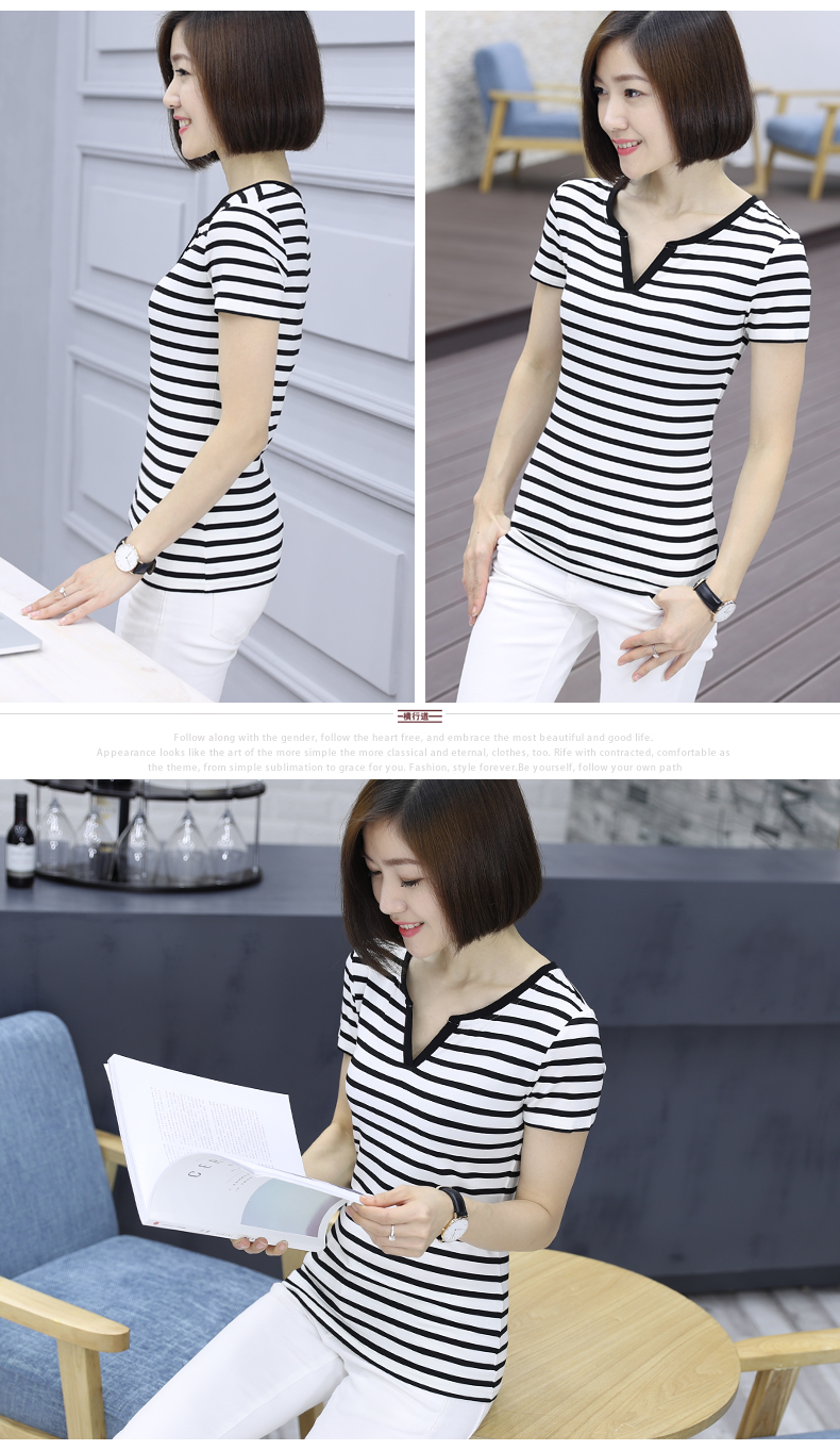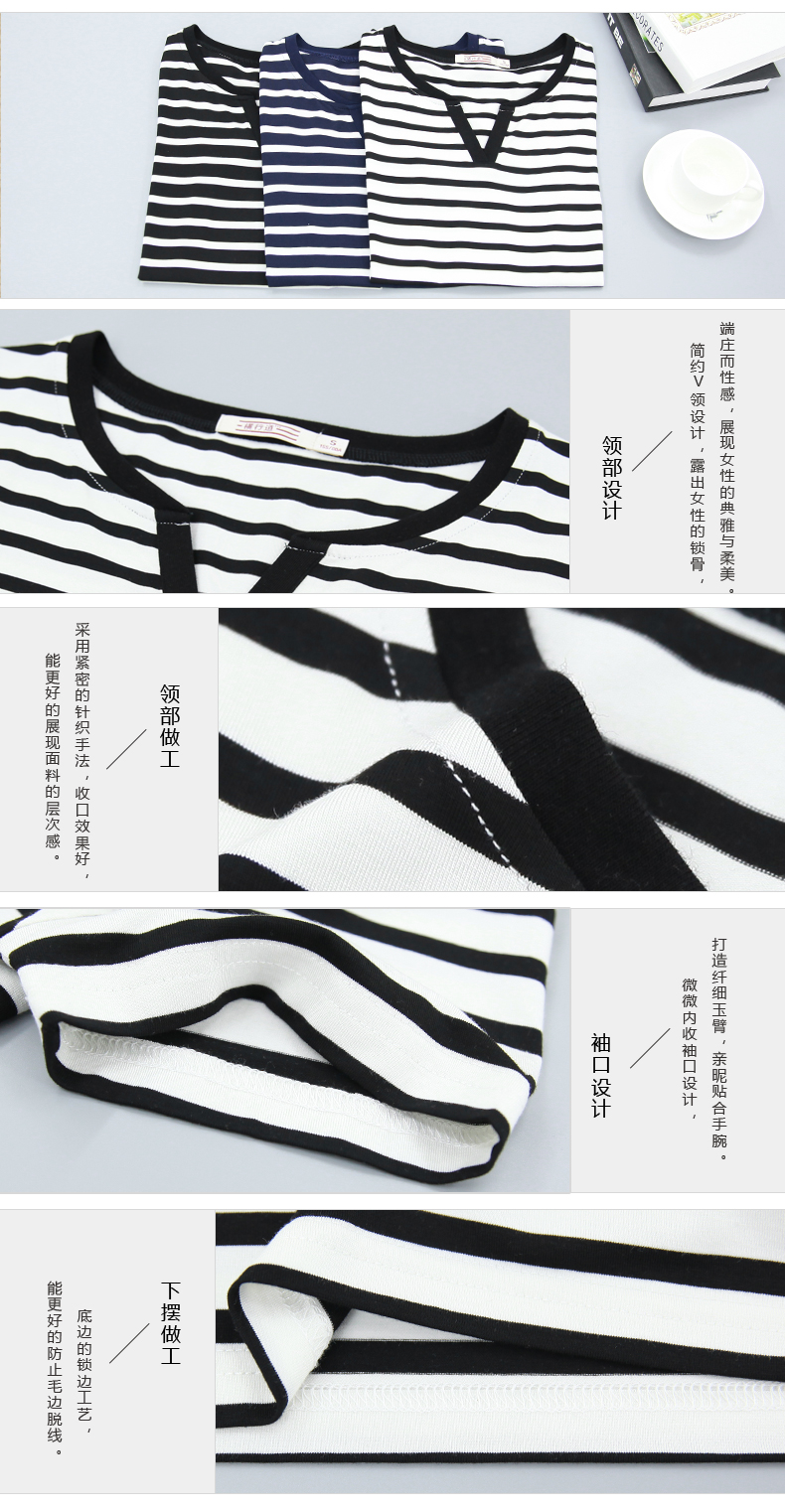 黑白條紋女T恤上衣中年顯瘦短袖大碼寬松夏裝莫代爾V領海魂衫女士1入