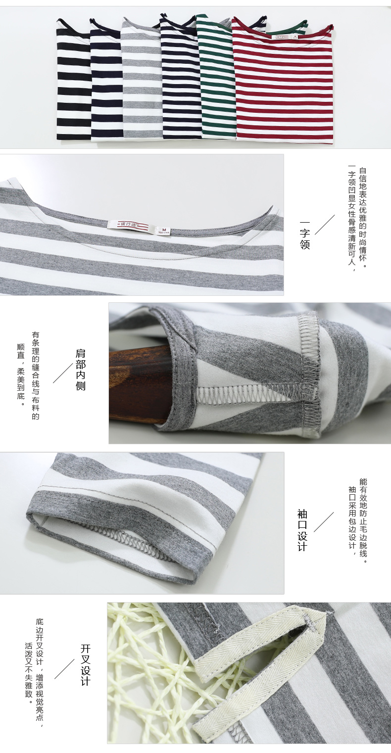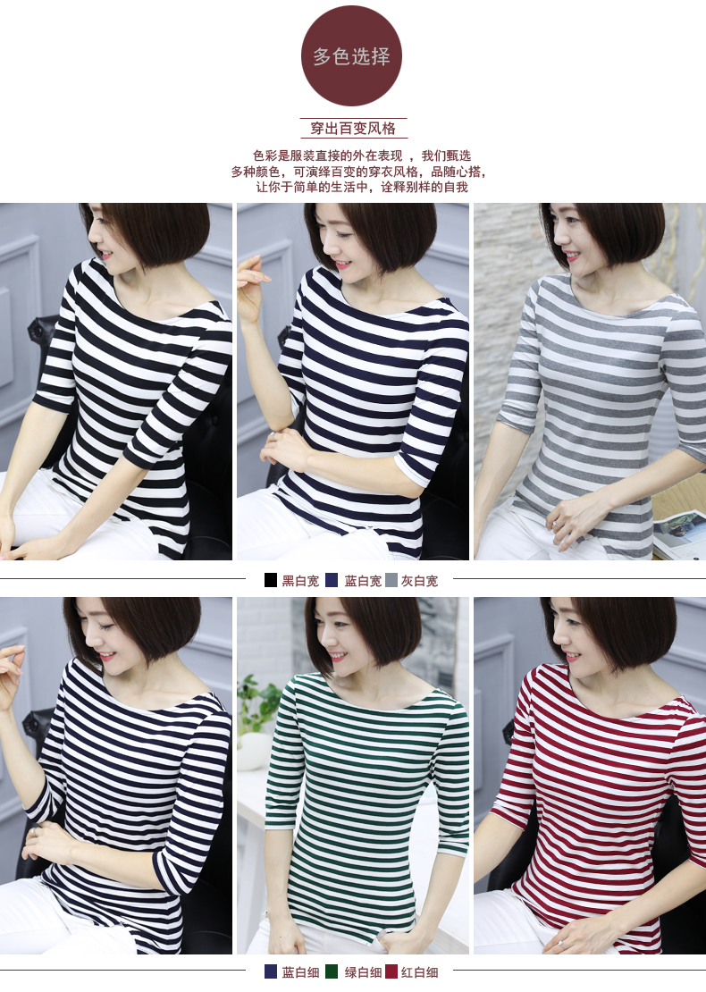 2019秋裝七分袖女裝一字領打底衫黑白條紋上衣服外穿中袖女士t恤1入