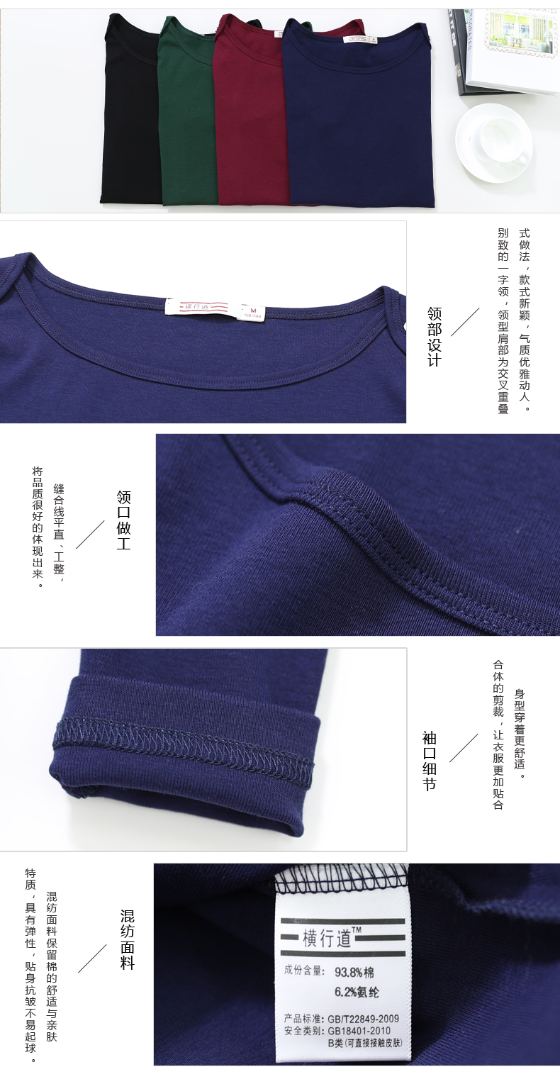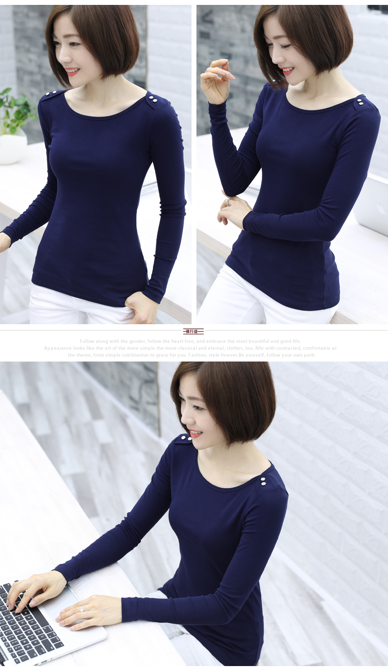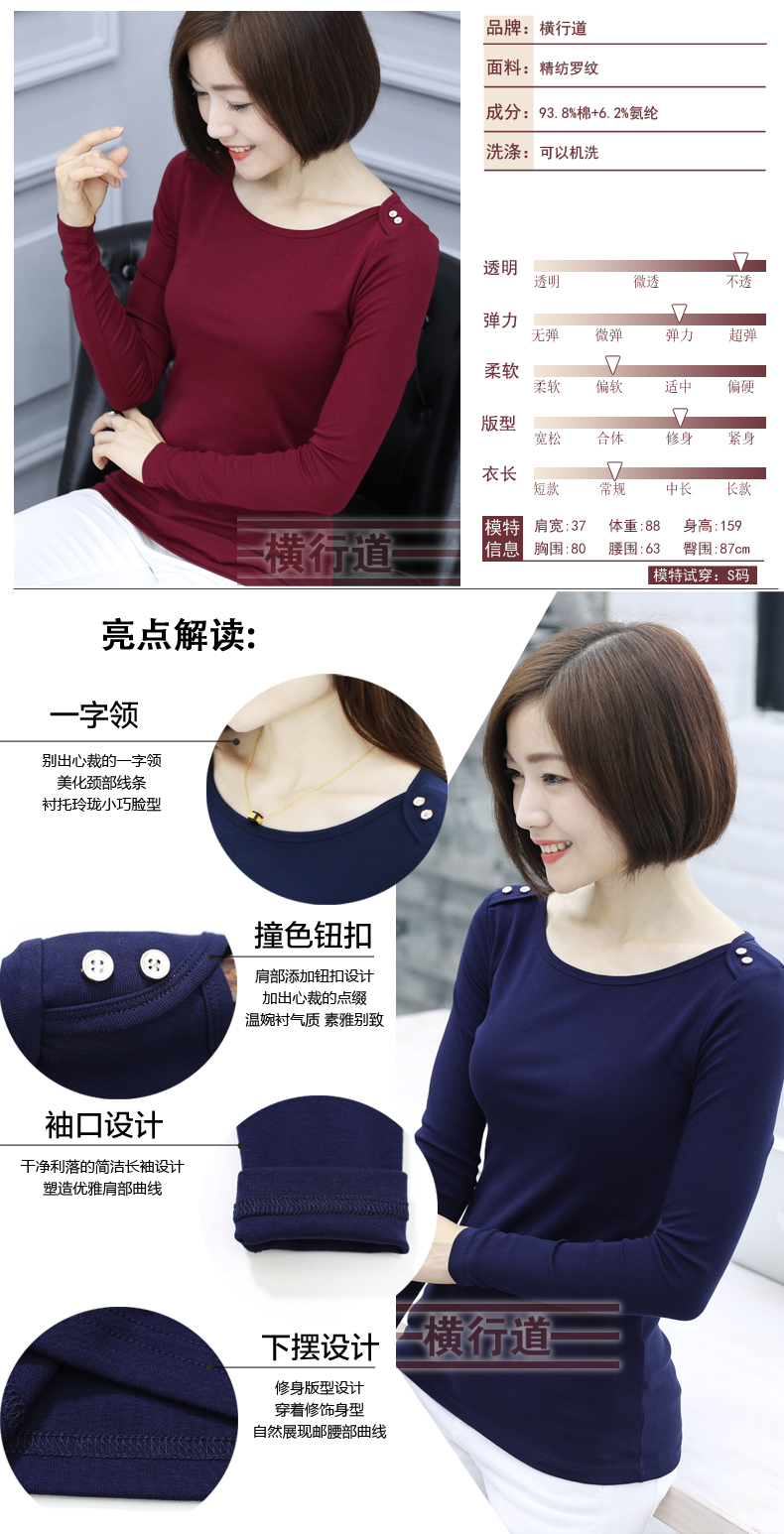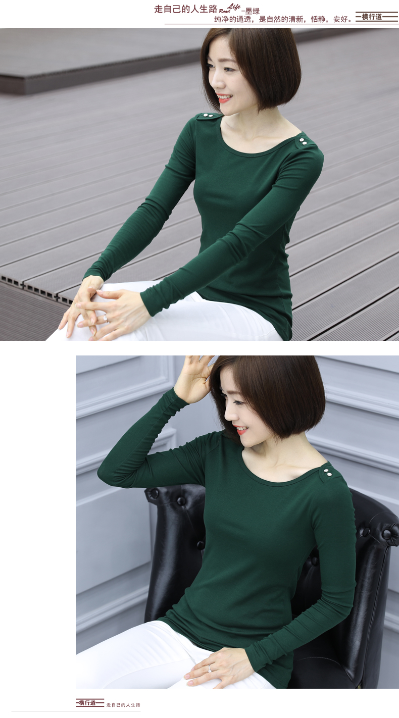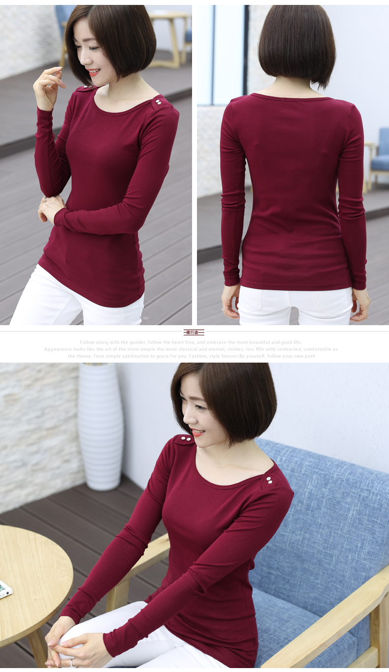 2019秋裝女士上衣一字領紐扣大碼女裝韓版簡約純色長袖t恤打底衫1入