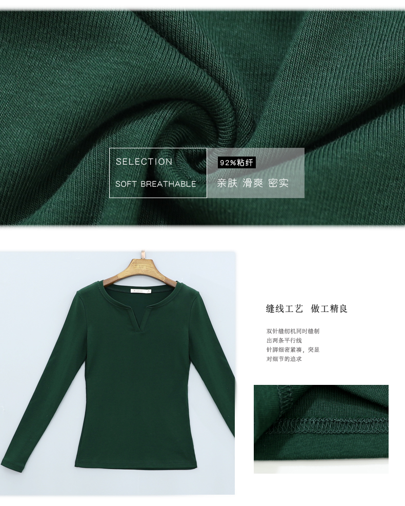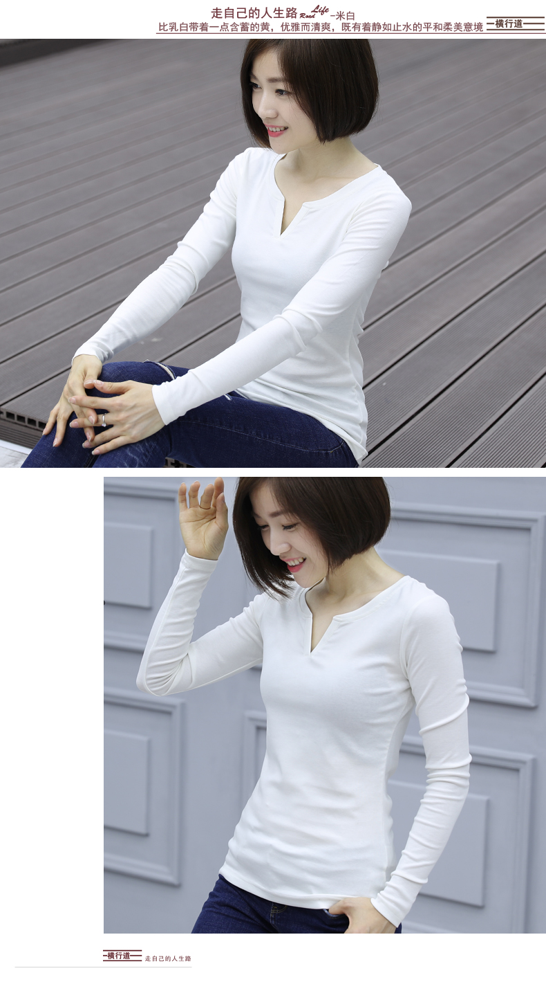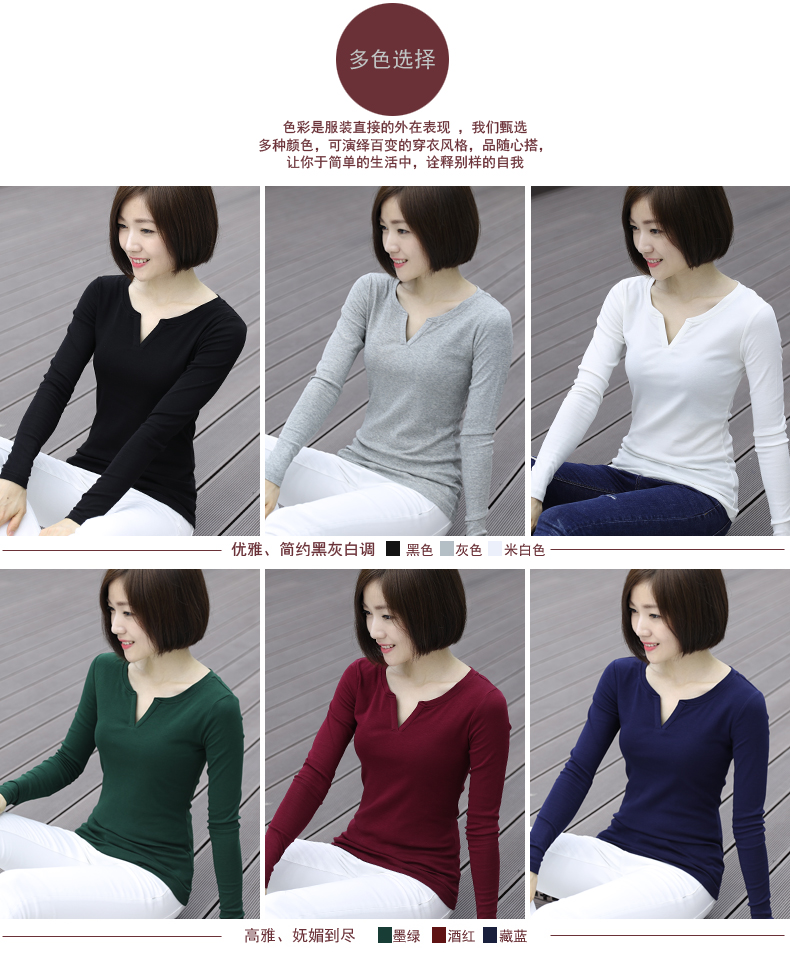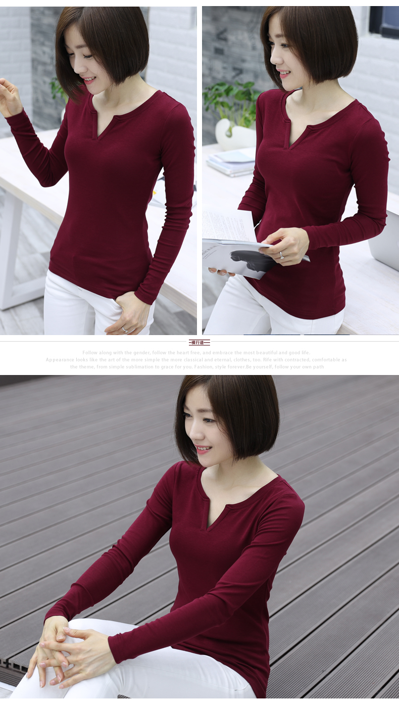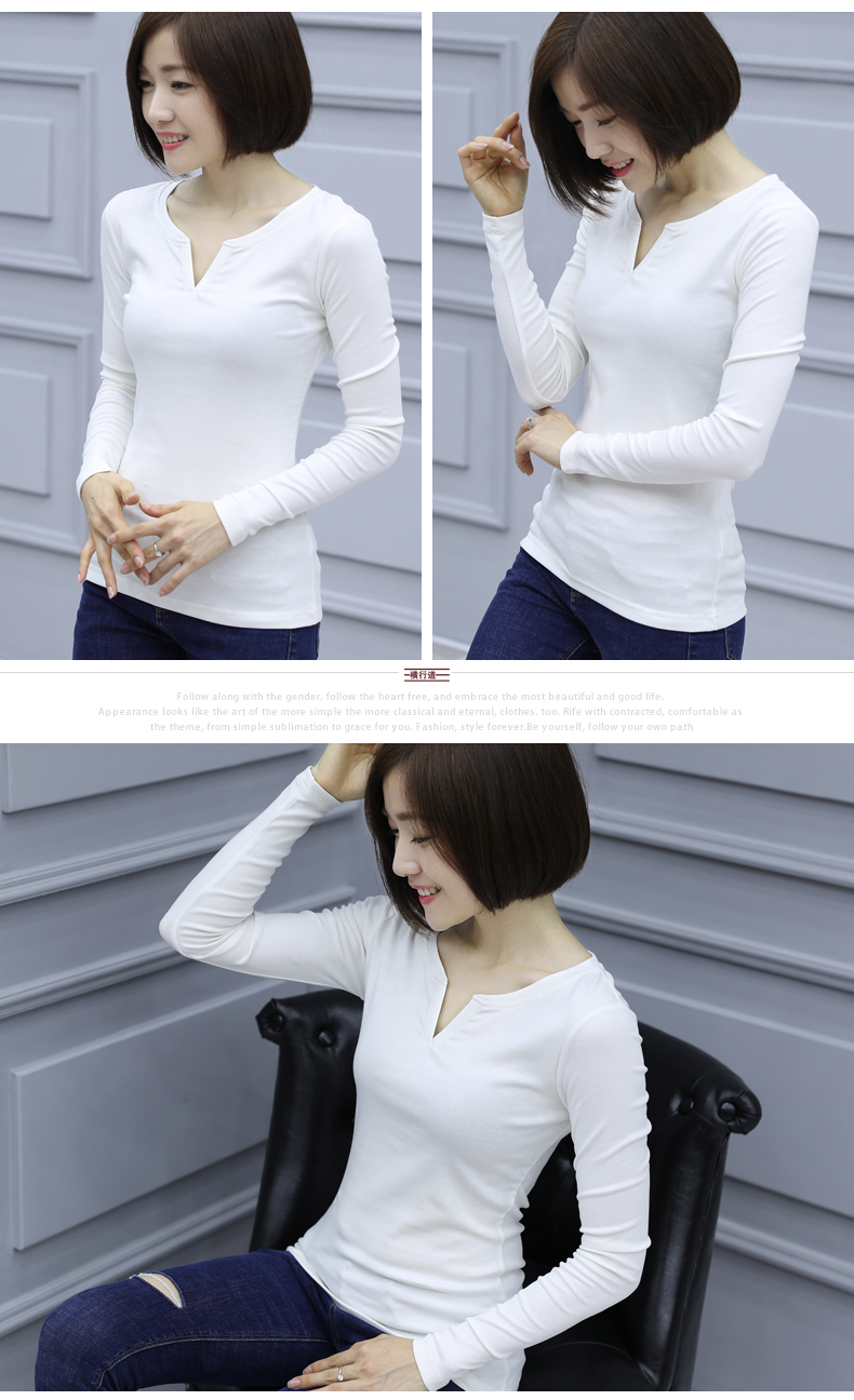 2019秋裝新款韓版大碼女士上衣服v領純色長袖t恤女裝棉打底衫修身1入