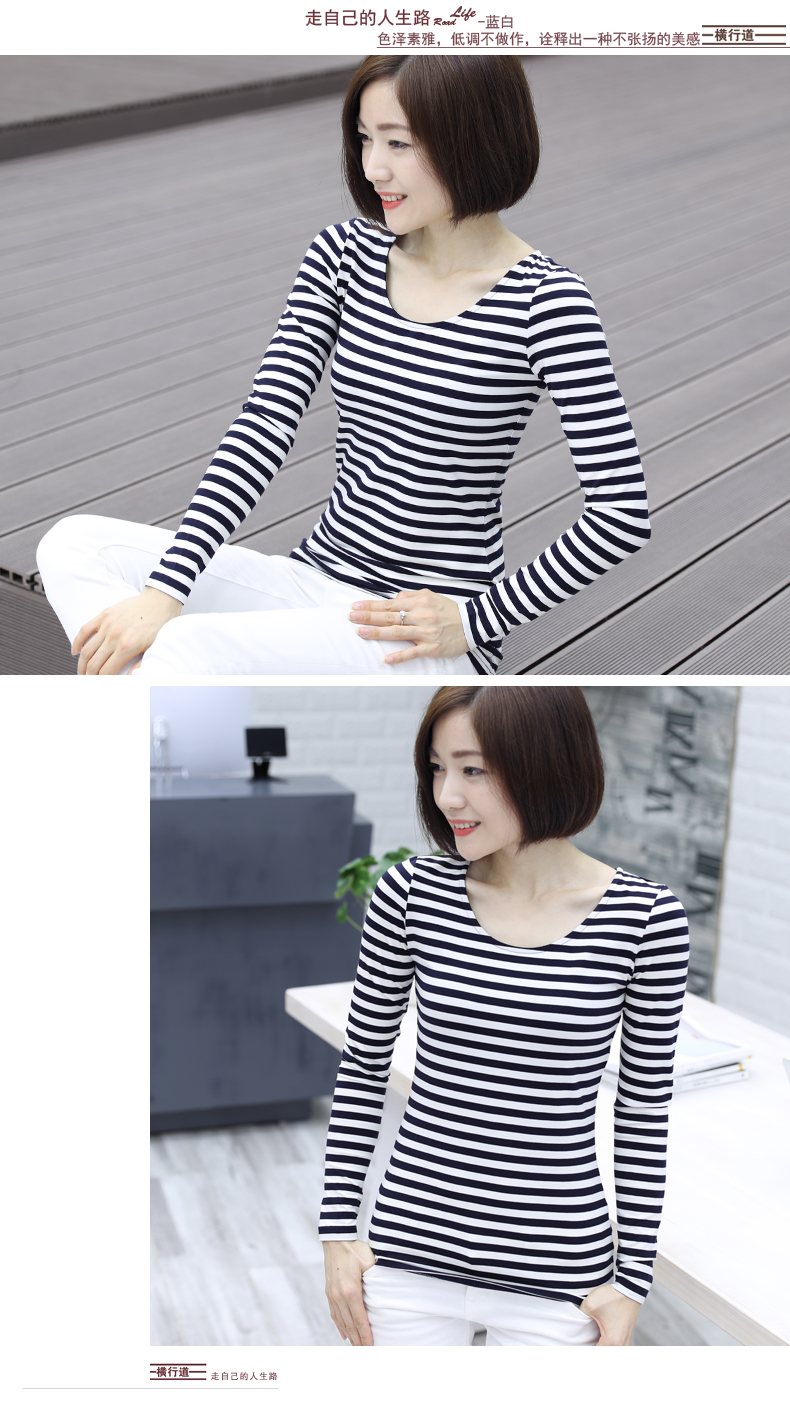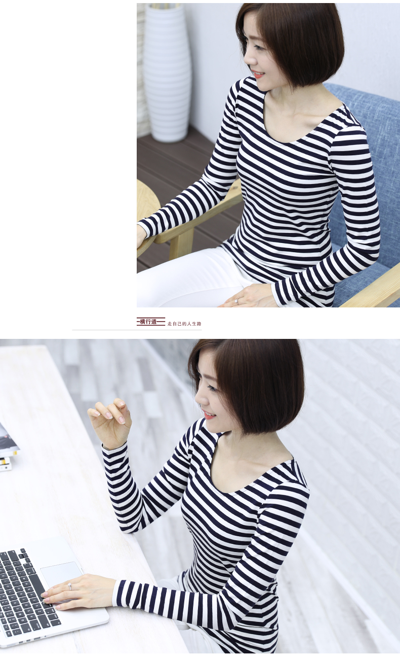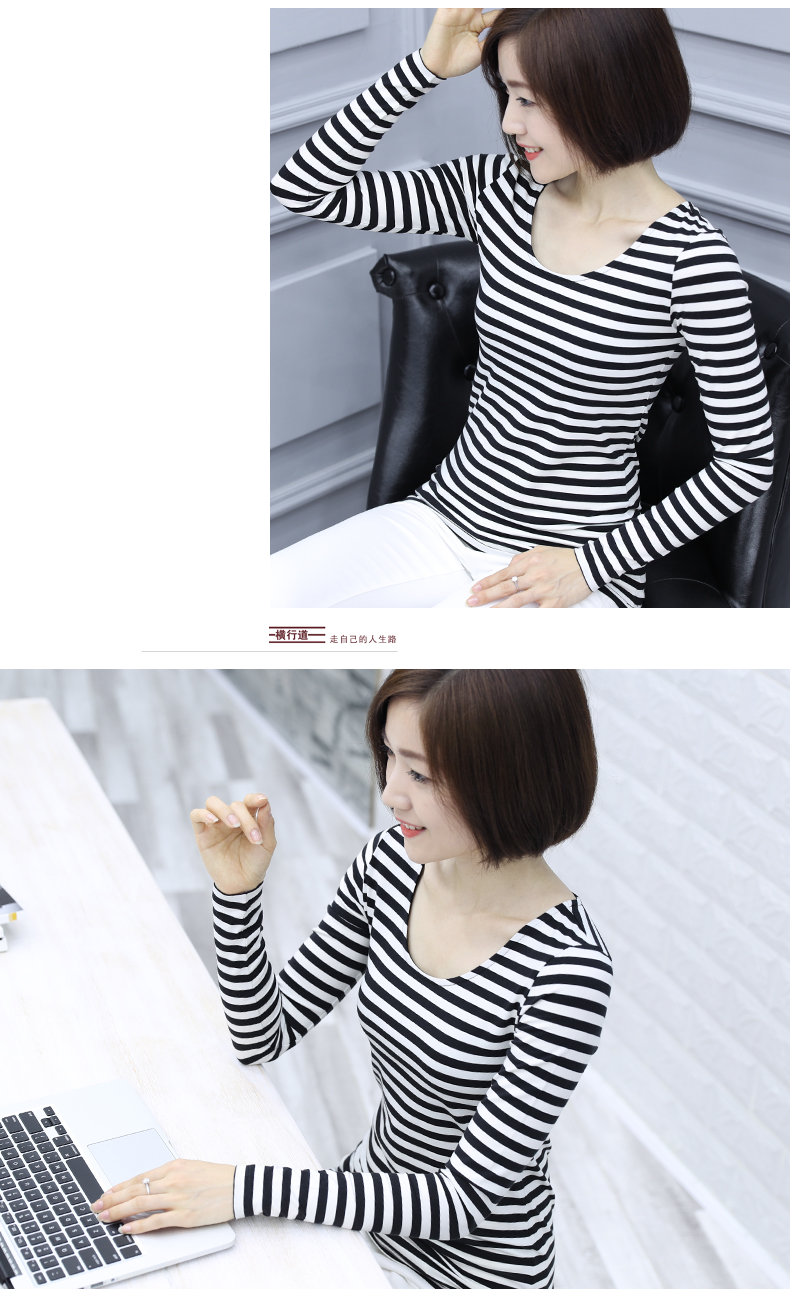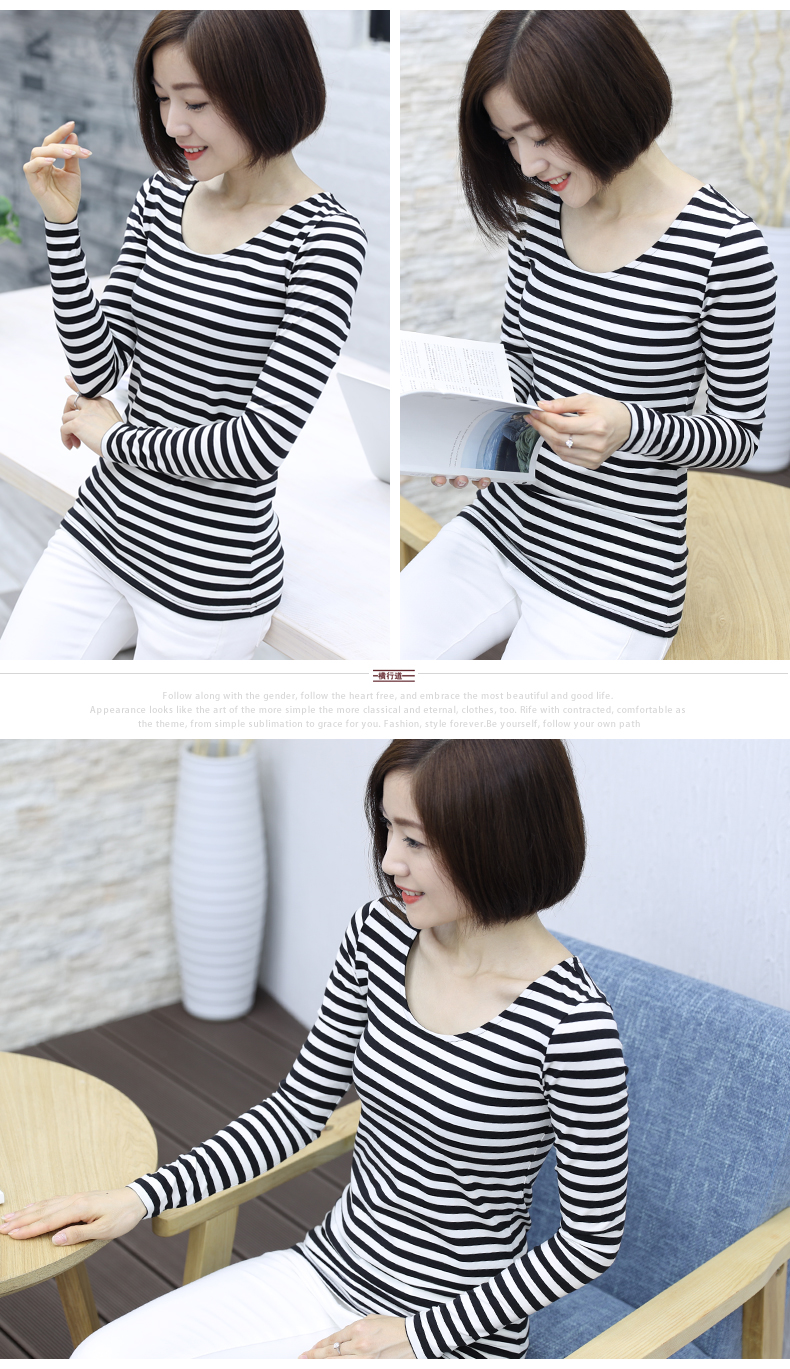 2019秋裝大碼女裝修身韓版圓領黑白條紋長袖女體恤圓領打底衫T恤1入