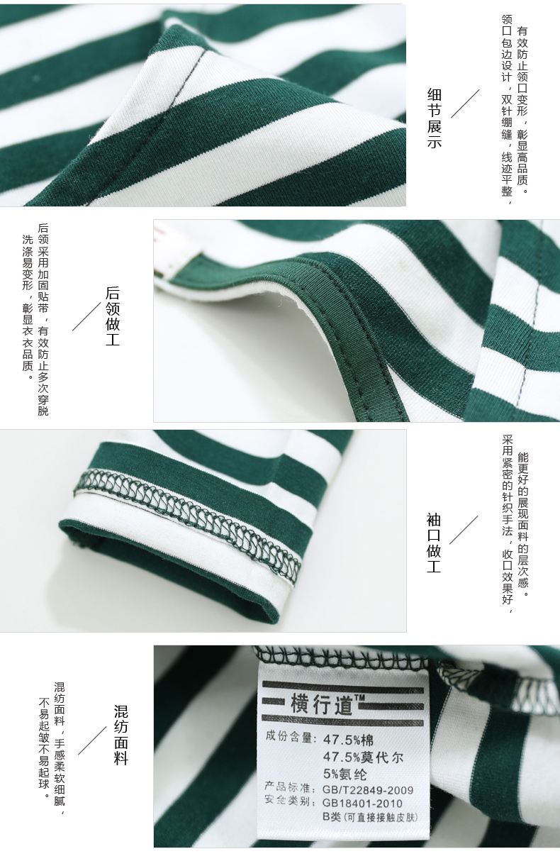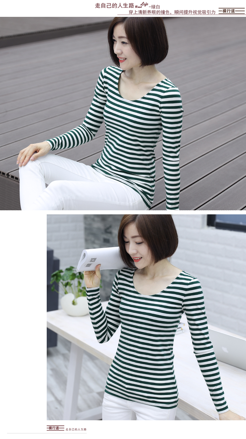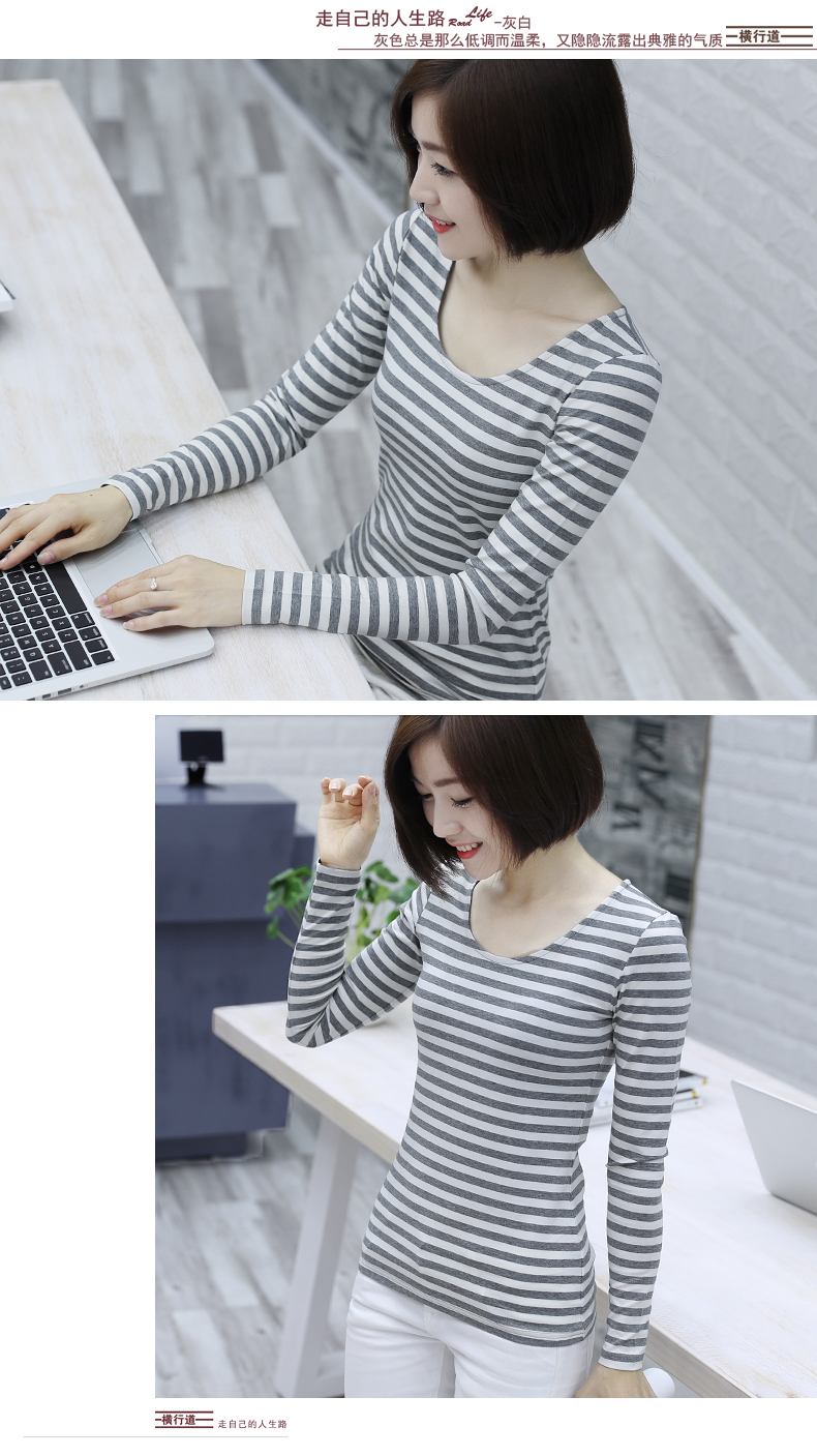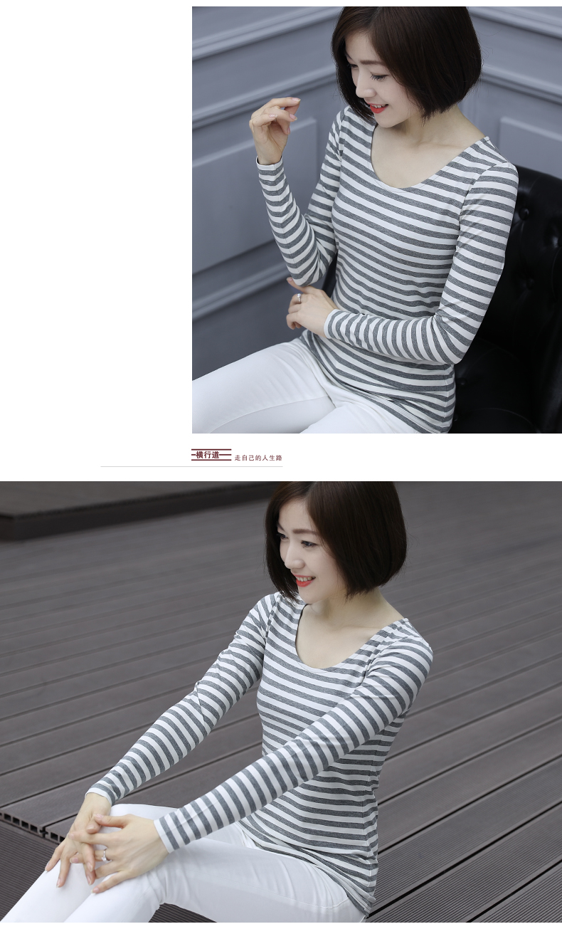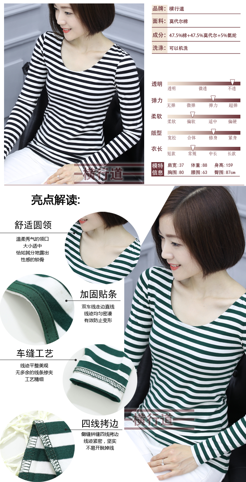 2019秋裝大碼女裝修身韓版圓領黑白條紋長袖女體恤圓領打底衫T恤1入