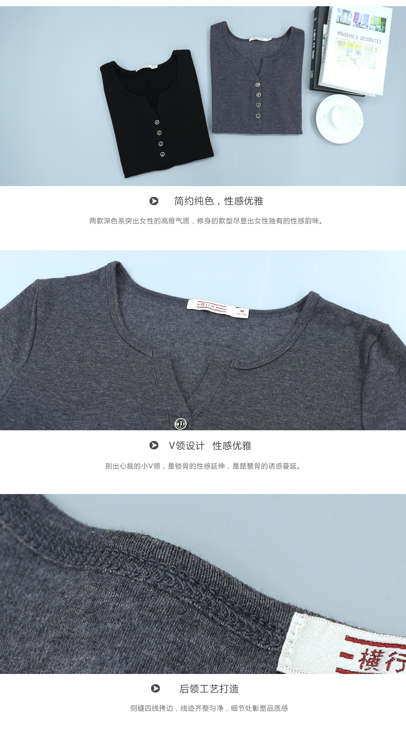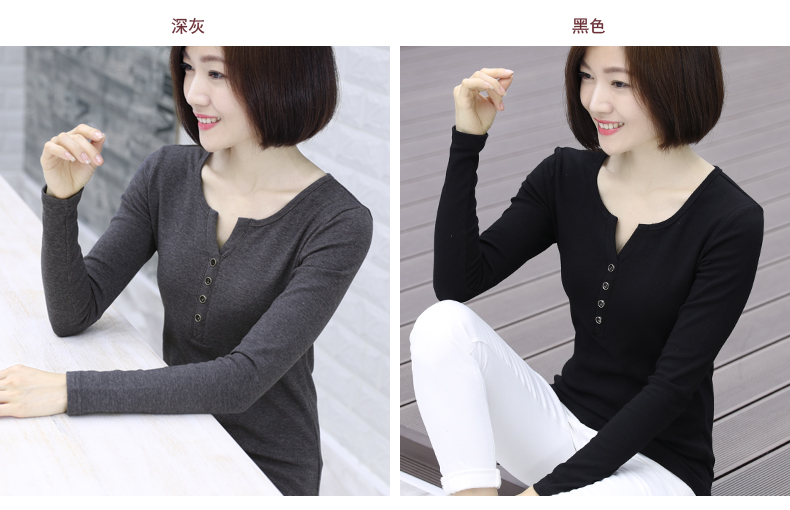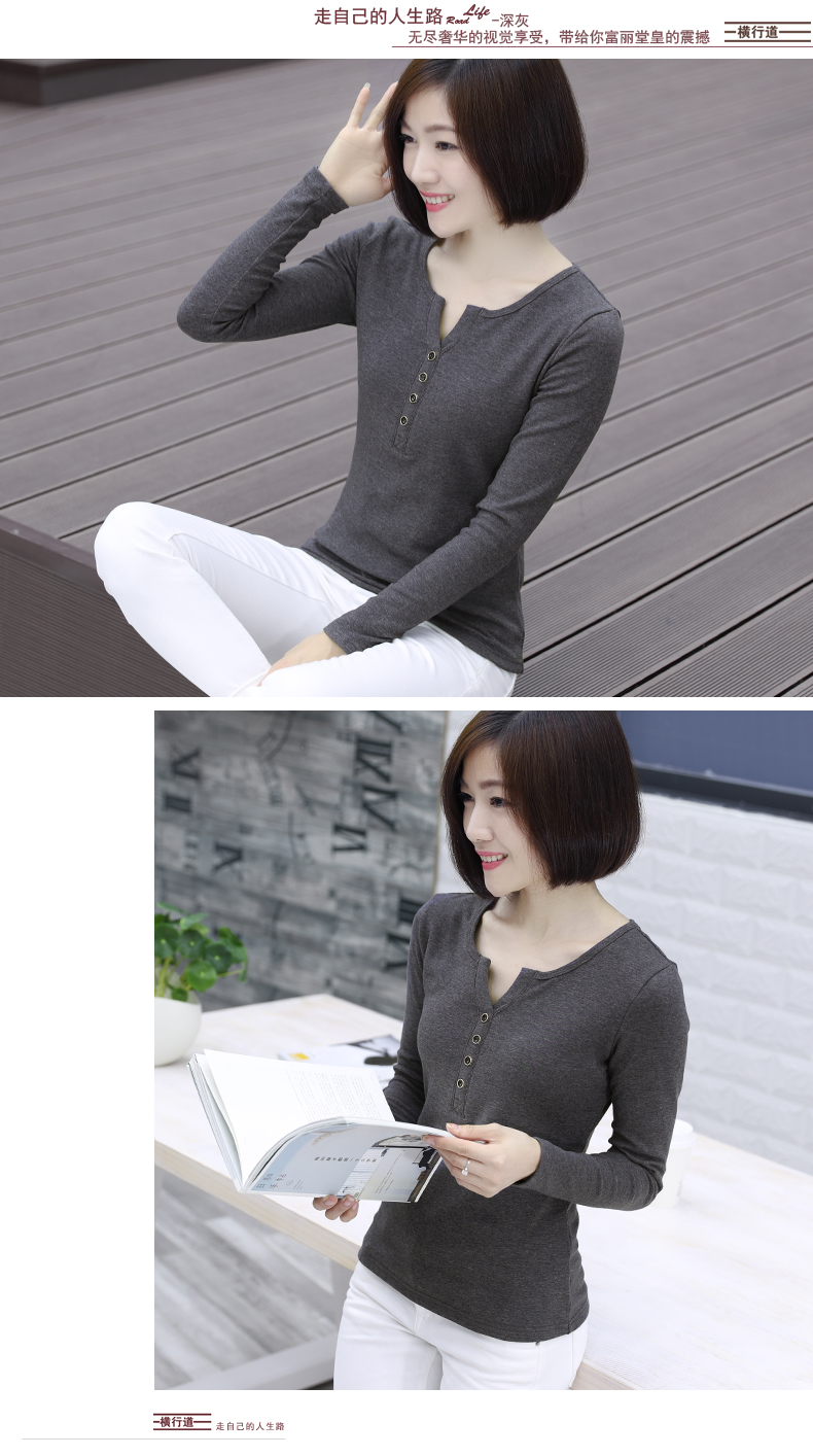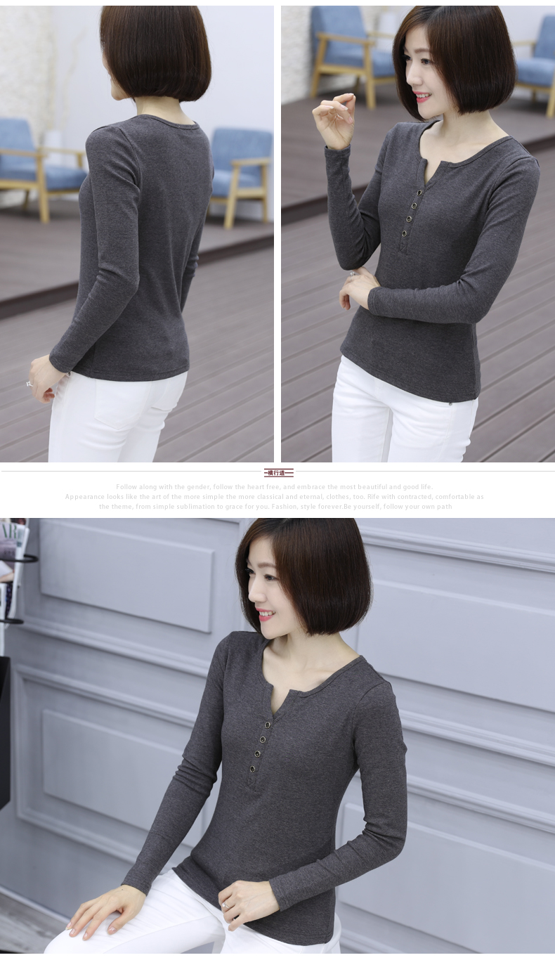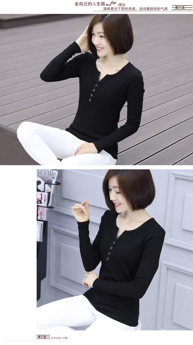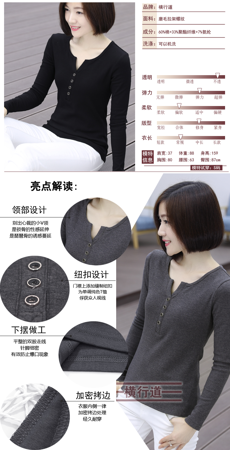 2019秋裝新款韓版女裝上衣服小衫修身純色V領長袖t恤修身打底衫秋1入