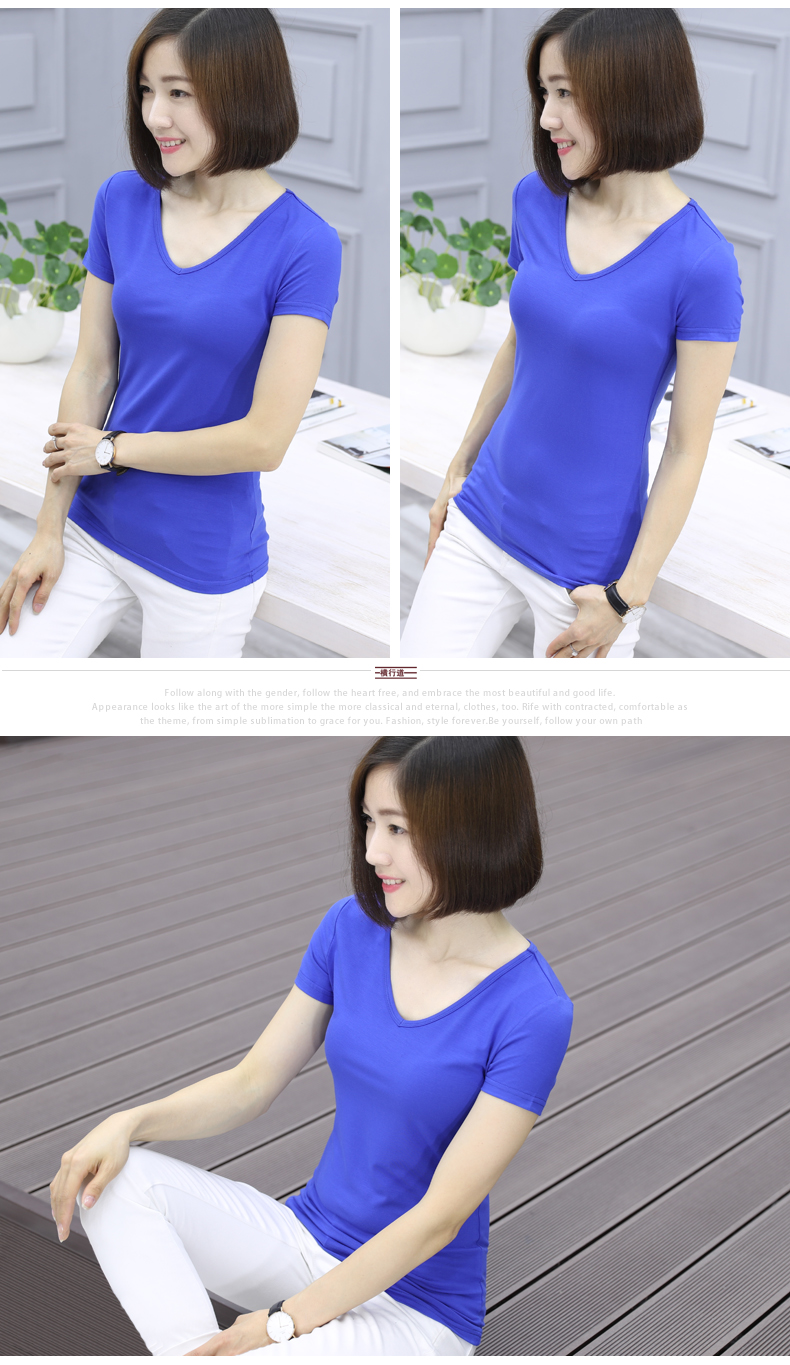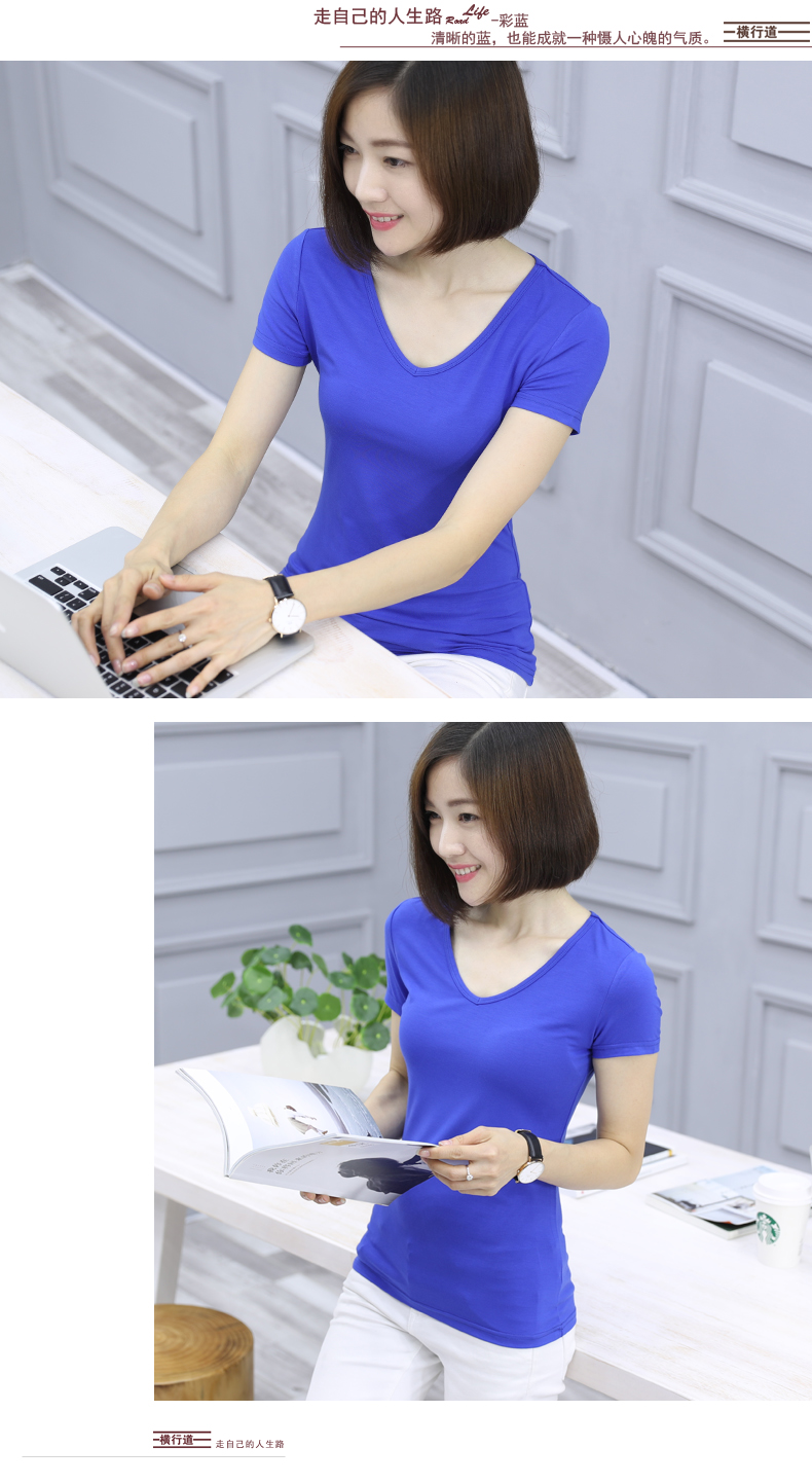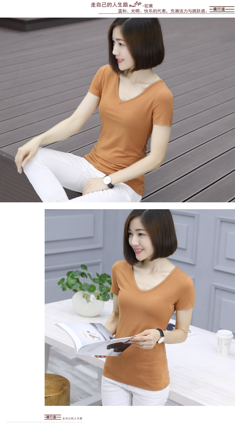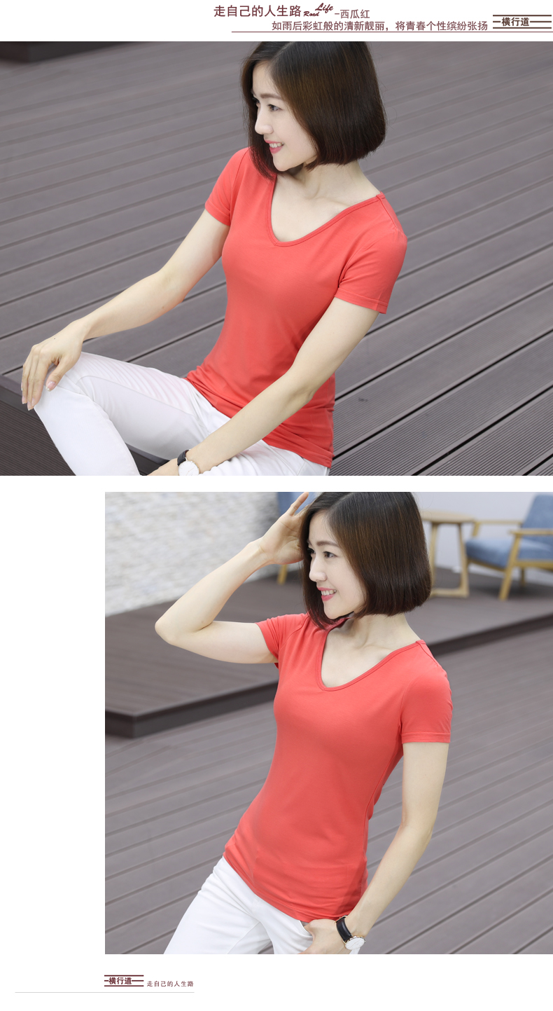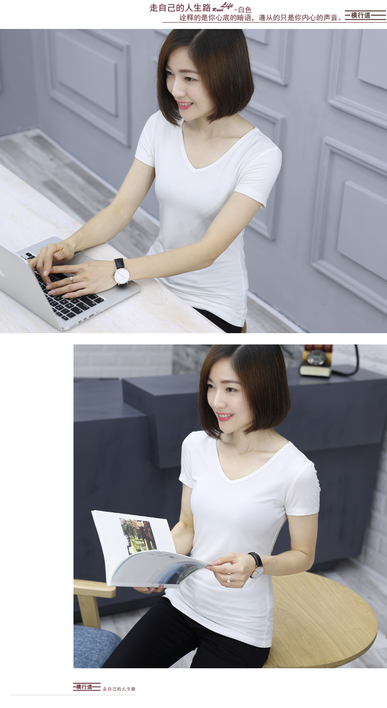 2019夏裝雞心領短袖t恤黑色莫代爾修身半袖大碼V領打底衫女士上衣1入