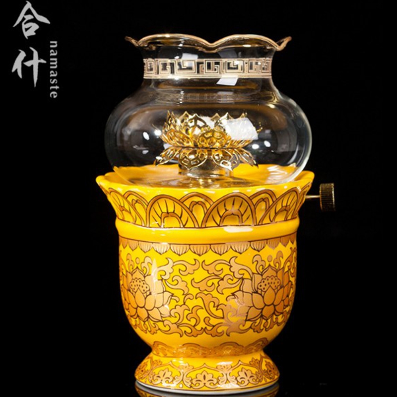 黃真金蓮花油燈廠家陶瓷廠家直銷供具佛具供燈酥油燈防風長明燈1入