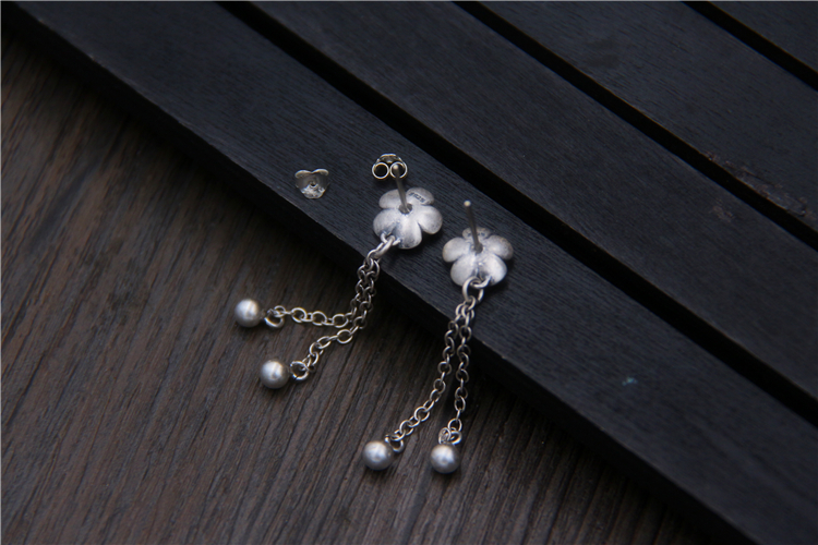 銀琪銀飾 泰銀耳飾 S925純銀小花秀氣長款流蘇做舊復古耳飾品1入