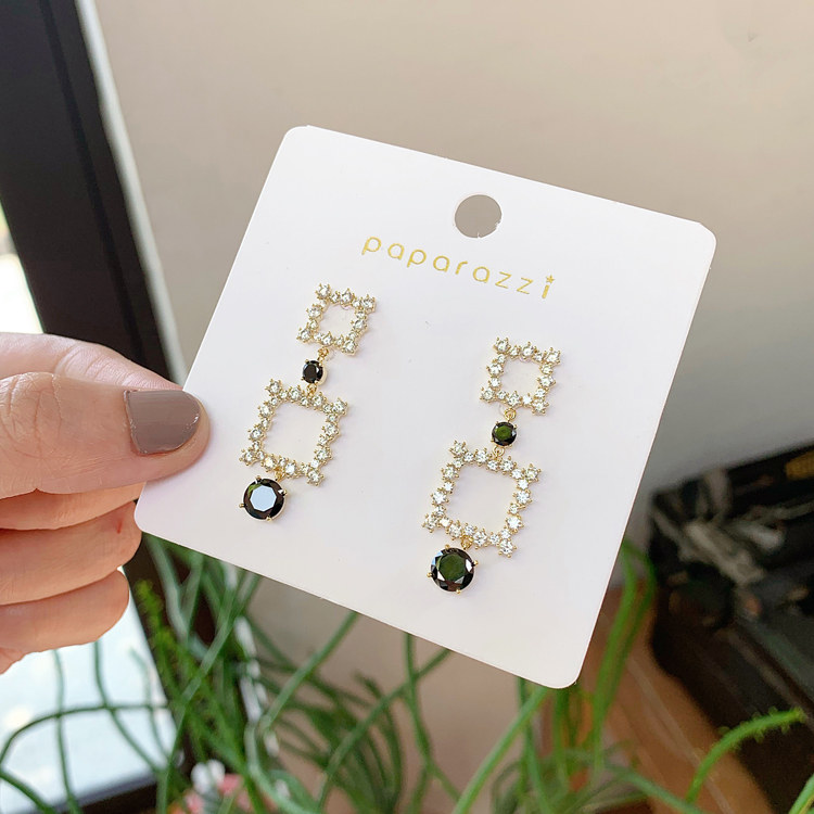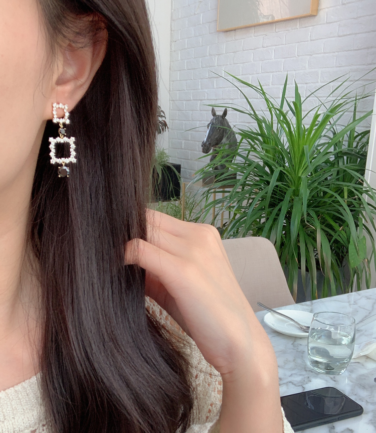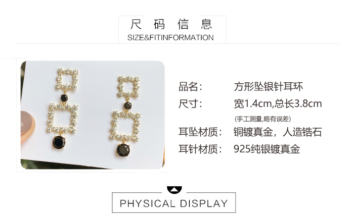 韓國東大門925銀針耳釘滿鉆個性方塊鏤空幾何長款氣質方形耳環1入