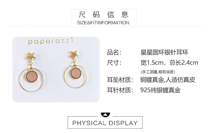 韓國東大門 五角星星925銀針皮質秋冬時尚氣質耳釘耳環女氣質耳飾1入