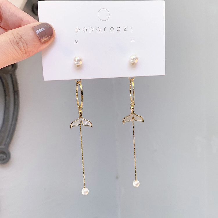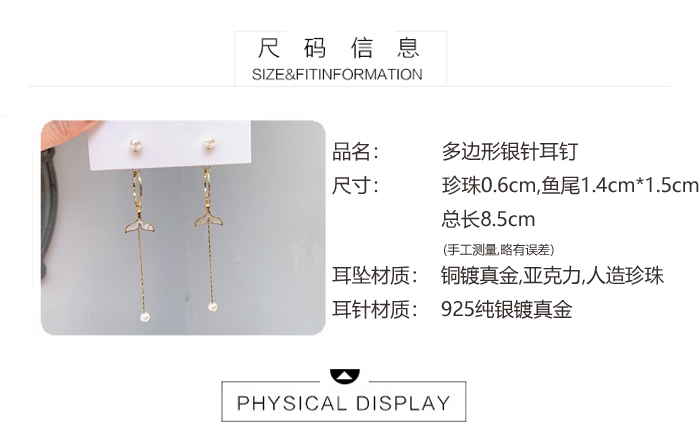 韓國東大門新款氣質珍珠魚尾耳環925銀針簡約耳墜長款顯臉瘦耳飾1入