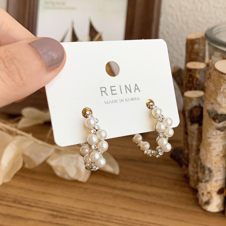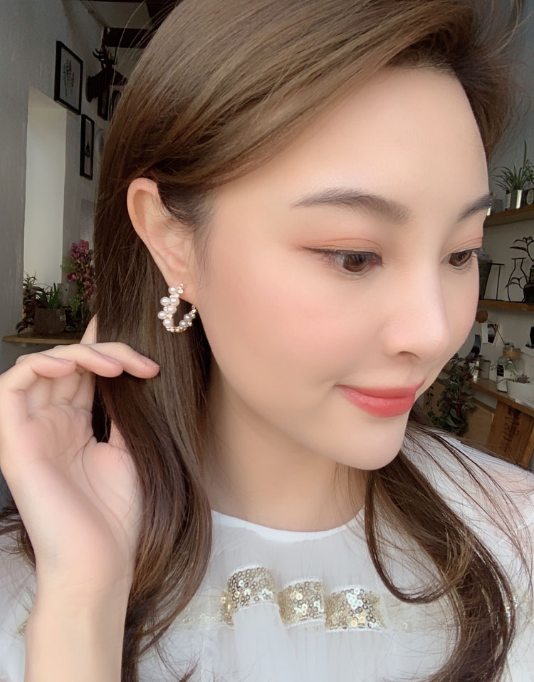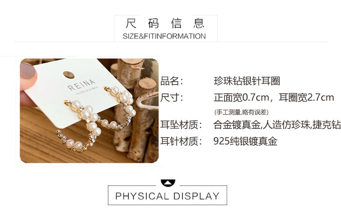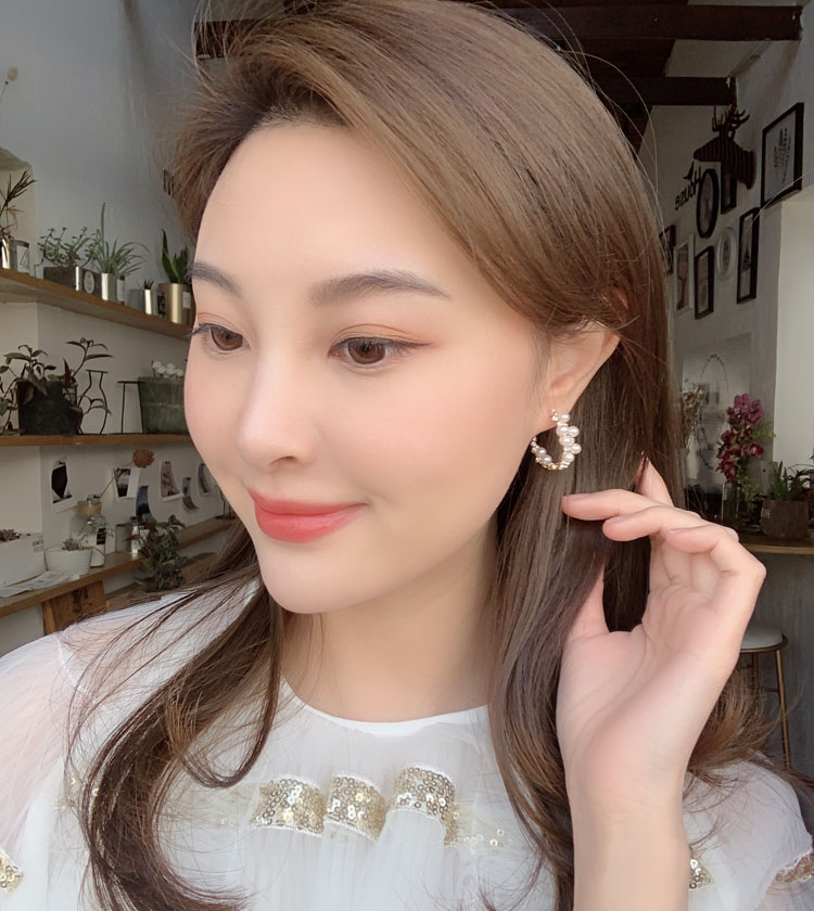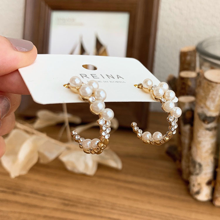 韓國 仙氣超美珍珠鑲鉆不規則半圓環925銀針耳圈耳環氣質簡約百搭1入