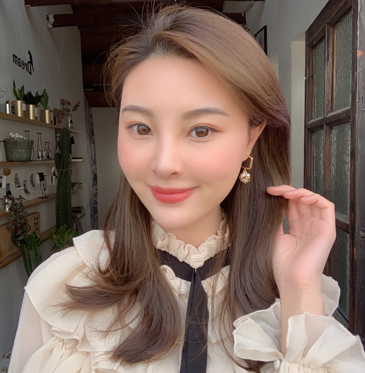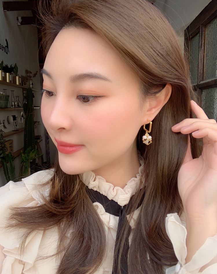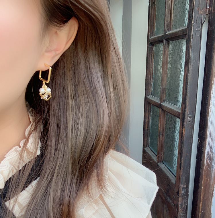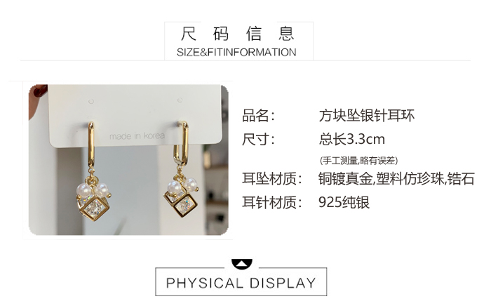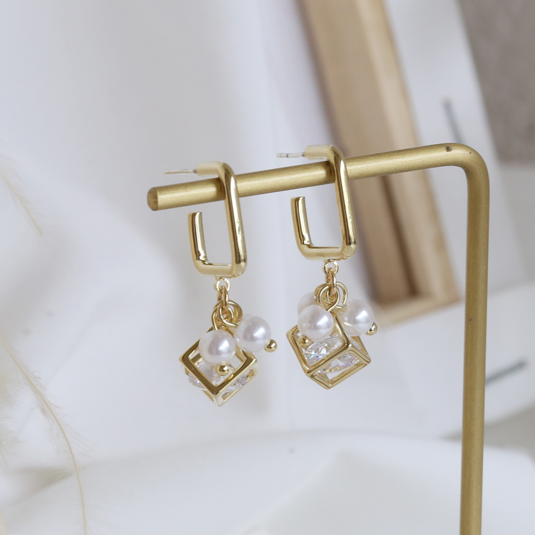 韓國東大門s925銀針耳圈耳墜金屬珍珠耳釘方形鏤空水晶耳環氣質1入