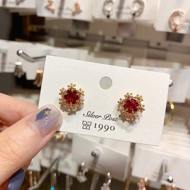 韓國東大門新款精致紅鉆雪花耳環溫婉簡約氣質925銀針耳釘耳飾品1入