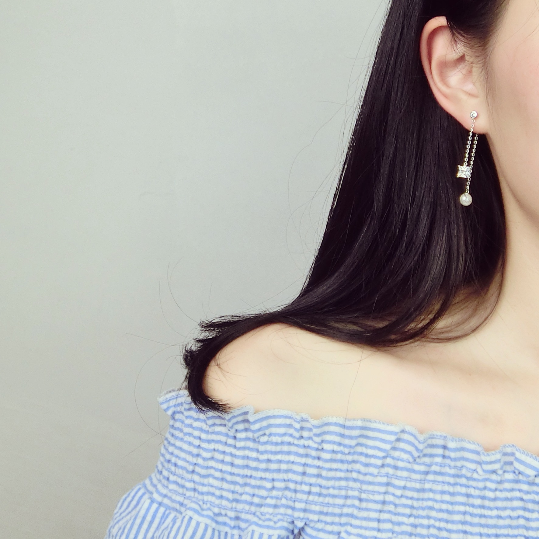 韓國氣質珍珠鋯石前后帶 925銀針耳釘耳飾品女百搭簡約個性耳環1入