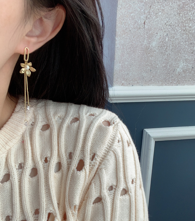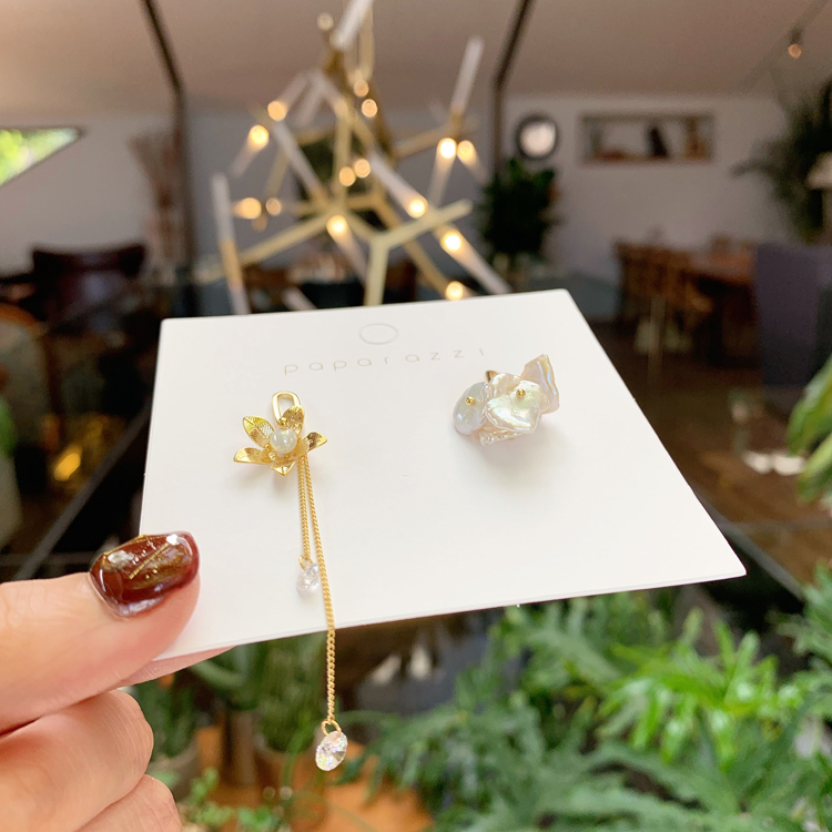韓國東大門氣質名媛超仙 長款不對稱鉆珍珠花朵銀針耳環耳釘簡約1入