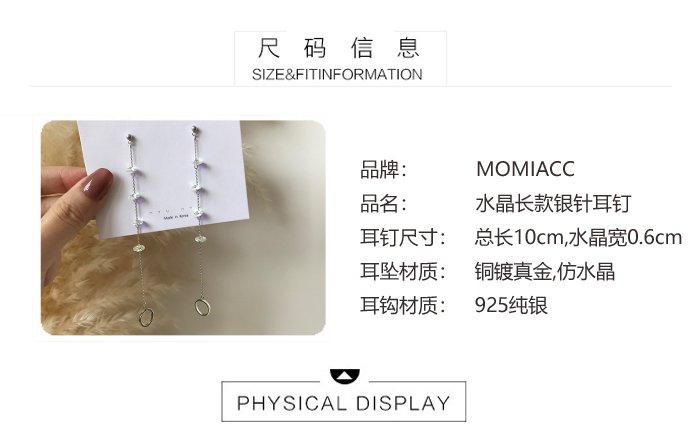 韓國新款 網紅甜美水晶925銀針耳釘精致小清新氣質百搭長款耳環女1入