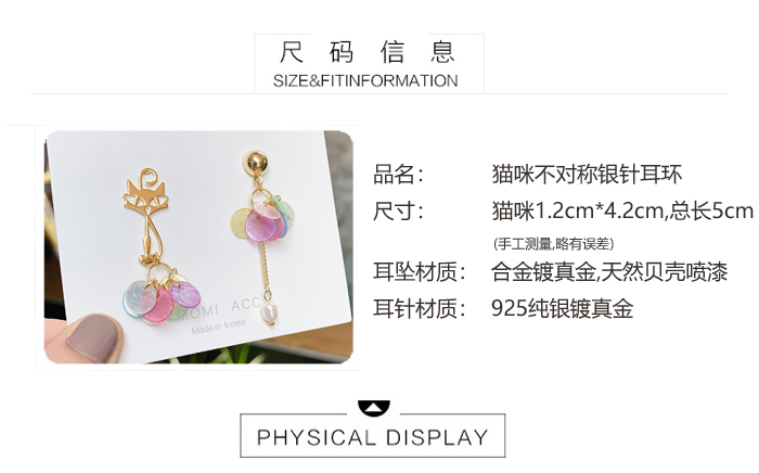 韓國東大門名媛風 925銀針耳環貝殼片小貓咪耳墜優雅修飾臉型感1入