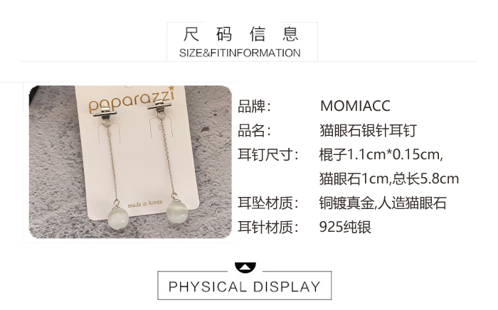 韓國新品氣質貓眼石吊墜耳環簡約百搭925耳釘女個性前后戴耳飾品1入