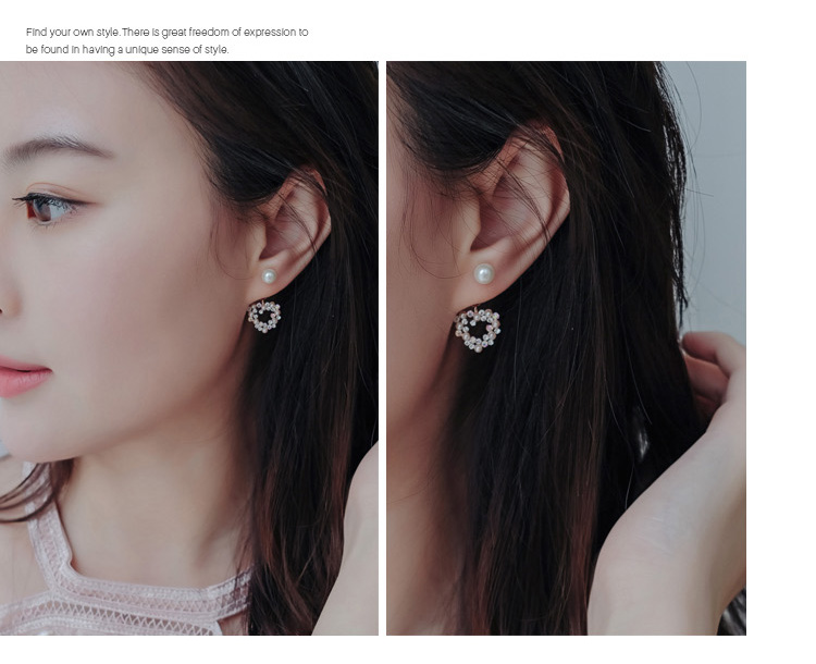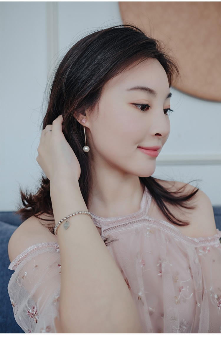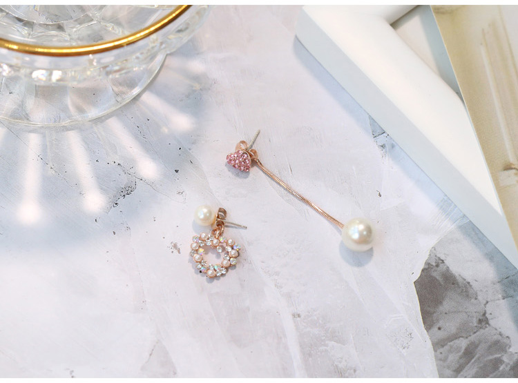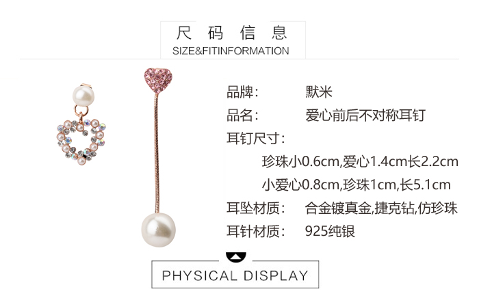韓國 東大門甜美粉色愛心925純銀針耳釘不對稱少女感閃鉆珍珠耳環1入
