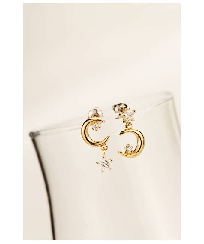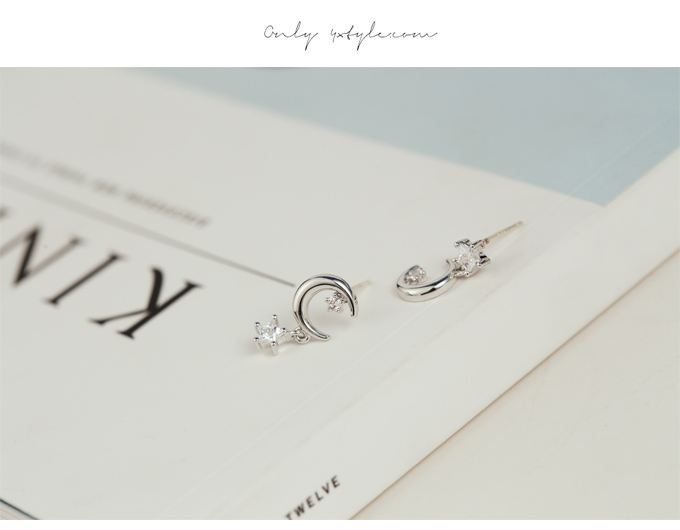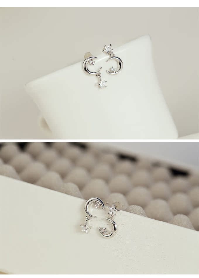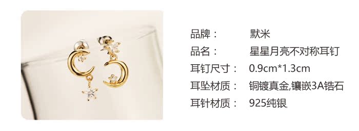 韓國版不對稱星星月亮S925純銀針耳釘耳飾防過敏女氣質簡約1入