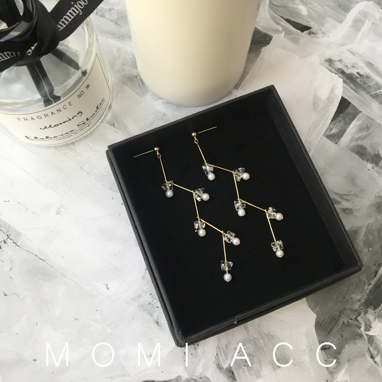 韓國 甜美仙氣玻璃水晶珍珠枝丫錯落耳環925銀針耳釘長款簡約氣質1入