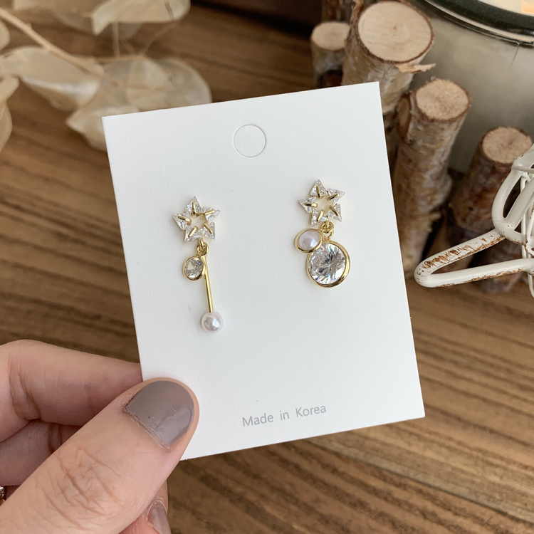 韓國東大門925銀針不對稱五角星耳環女氣質珍珠圓圈閃鉆耳墜耳釘1入
