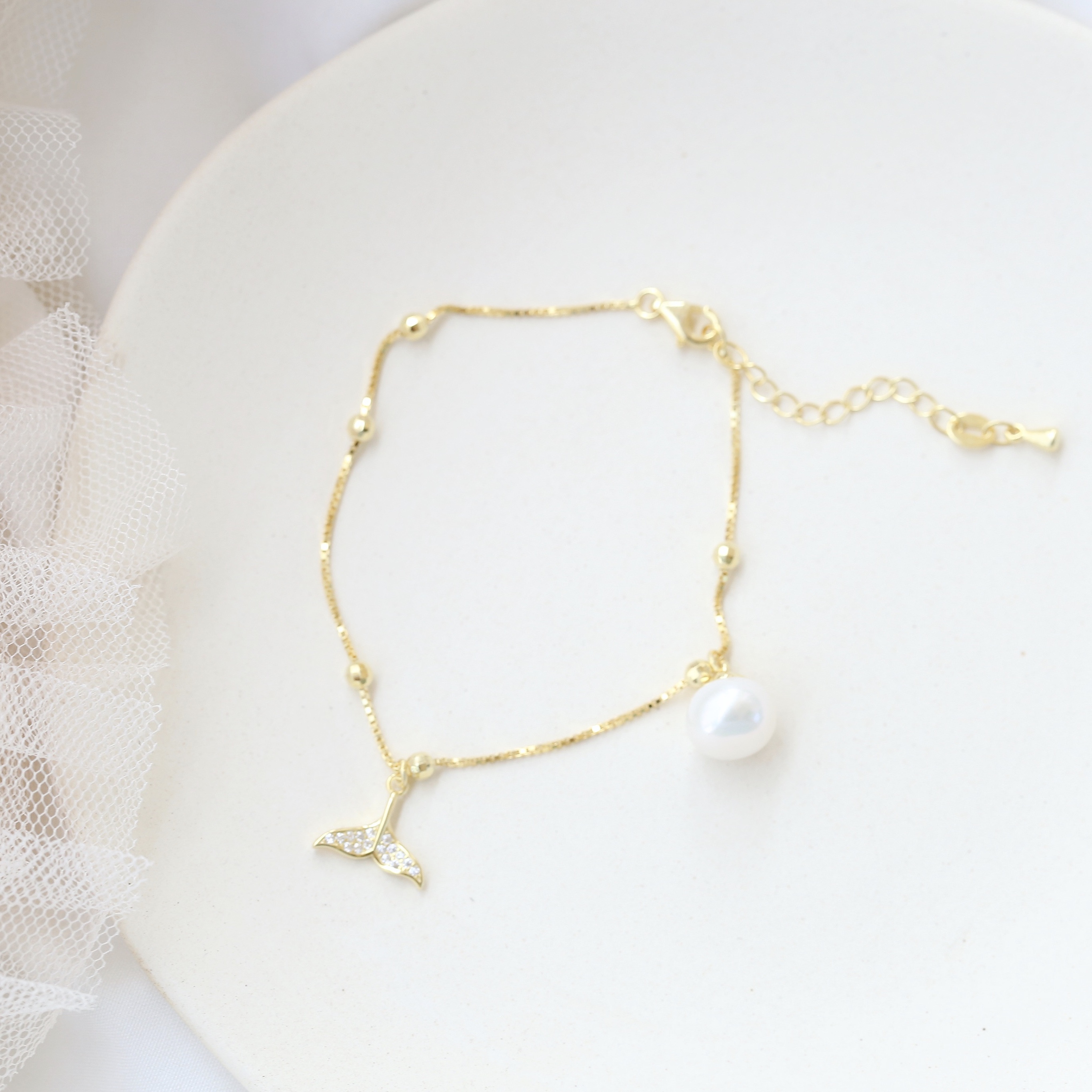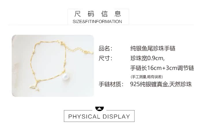 韓國s925通體純銀魚尾天然珍珠手鏈可調節女生精致手環1入