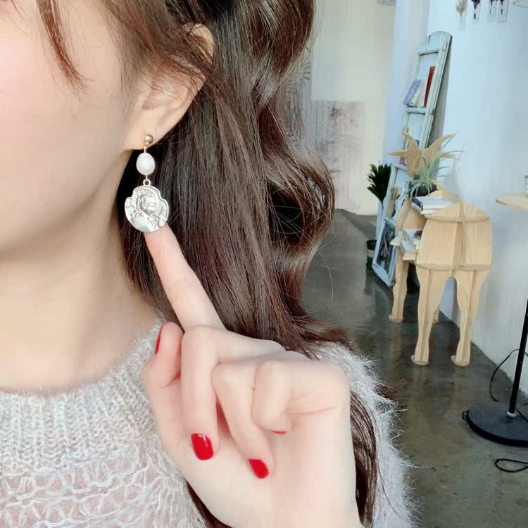 韓國時髦個性網紅潮流騎士頭像吊墜金屬珍珠耳環925銀針耳釘女1入