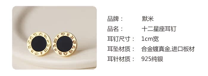 韓國新款十二星座s925純銀耳針耳釘簡約氣質日韓女時尚極簡圓形1入