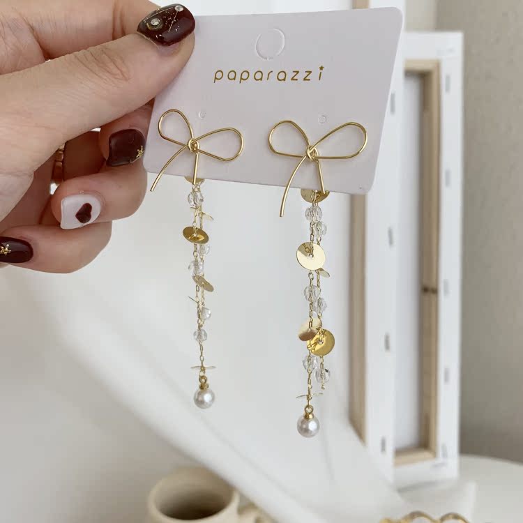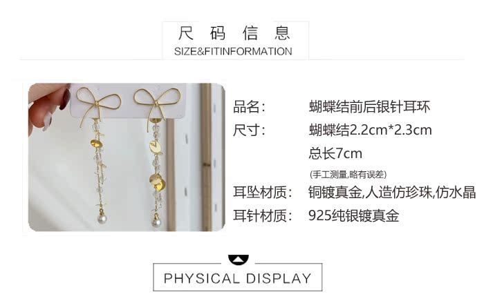 韓國韓范甜美設計感別致前后水晶流蘇蝴蝶結長款耳線銀針耳環女1入