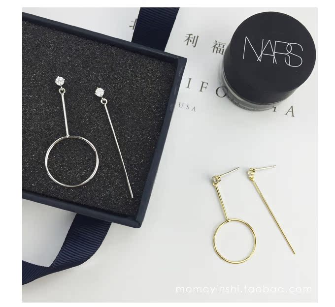 韓國個性 925純銀耳釘極簡女金屬風幾何不對稱圓形長款耳環耳飾品1入