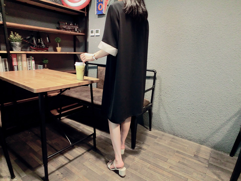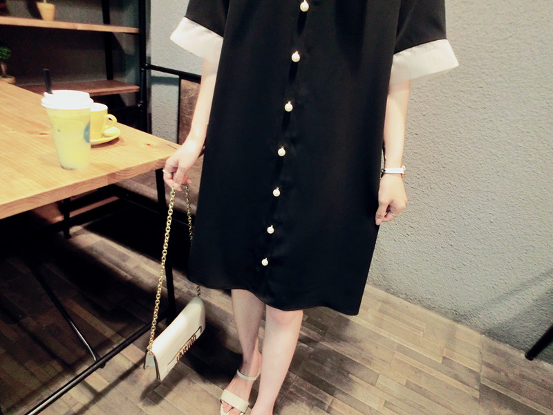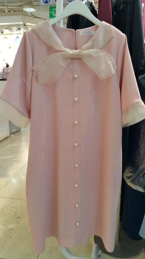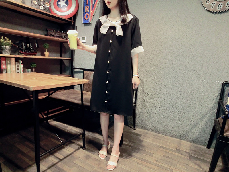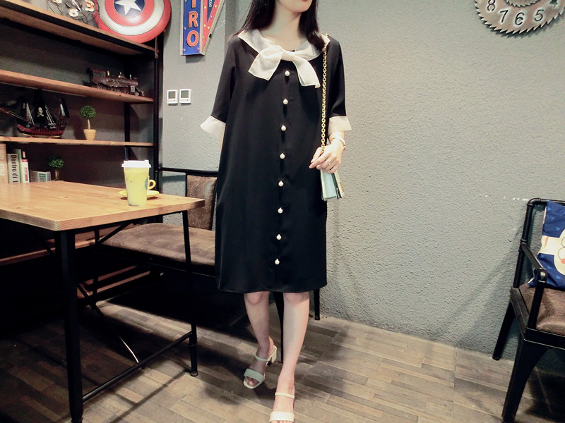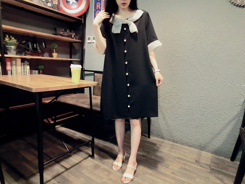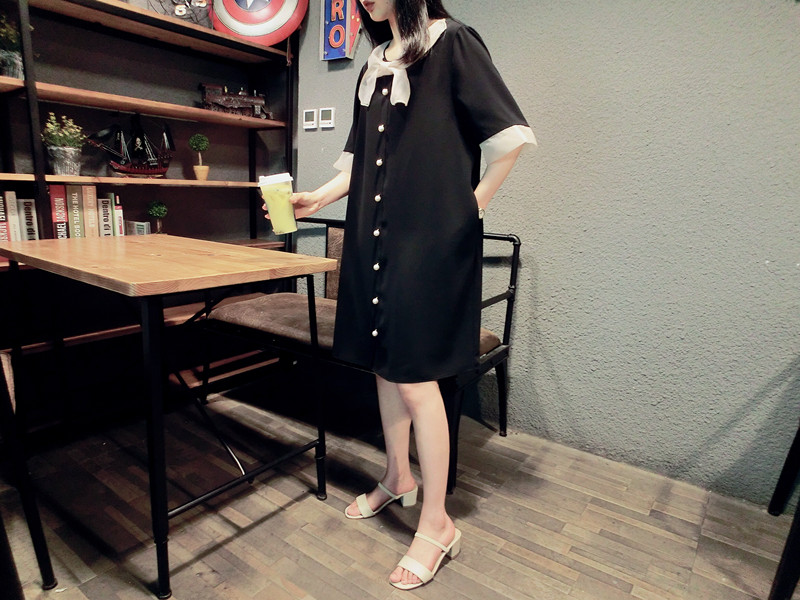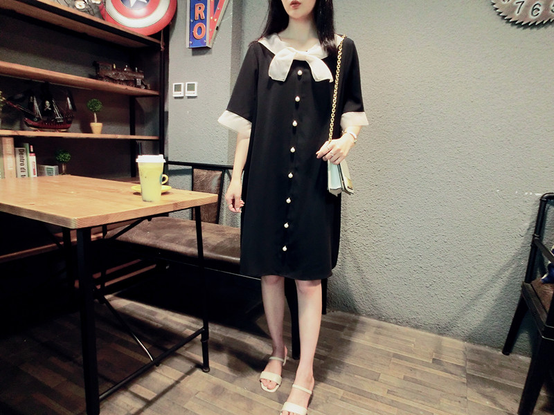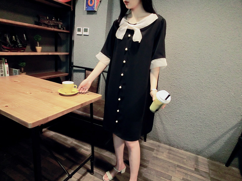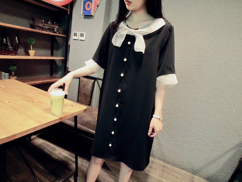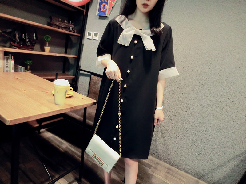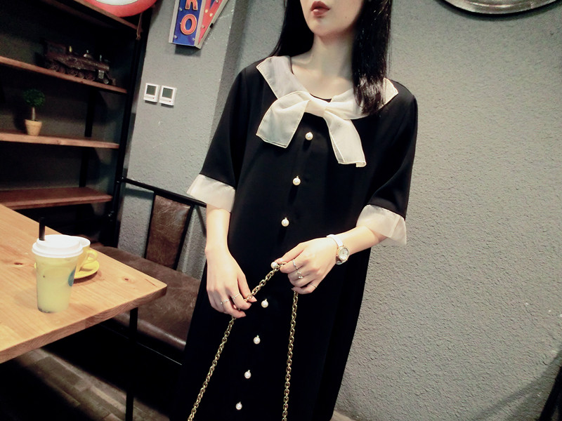 韓版19夏新品女寬松歐根紗拼接釘珠蝴蝶結短袖中長款雪紡連衣裙1入