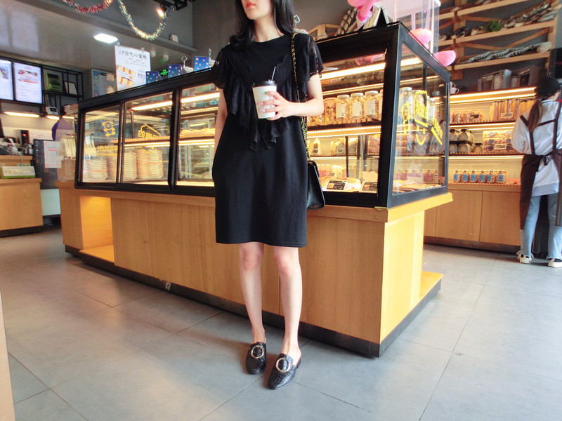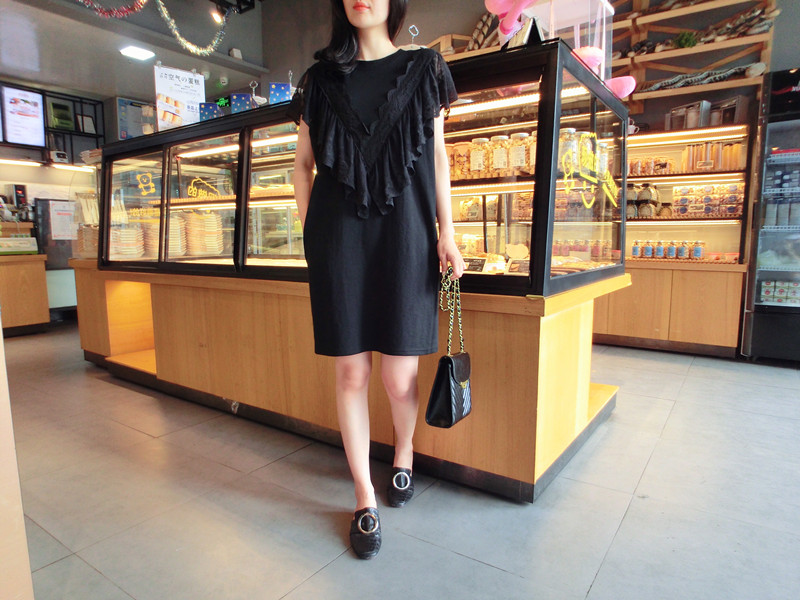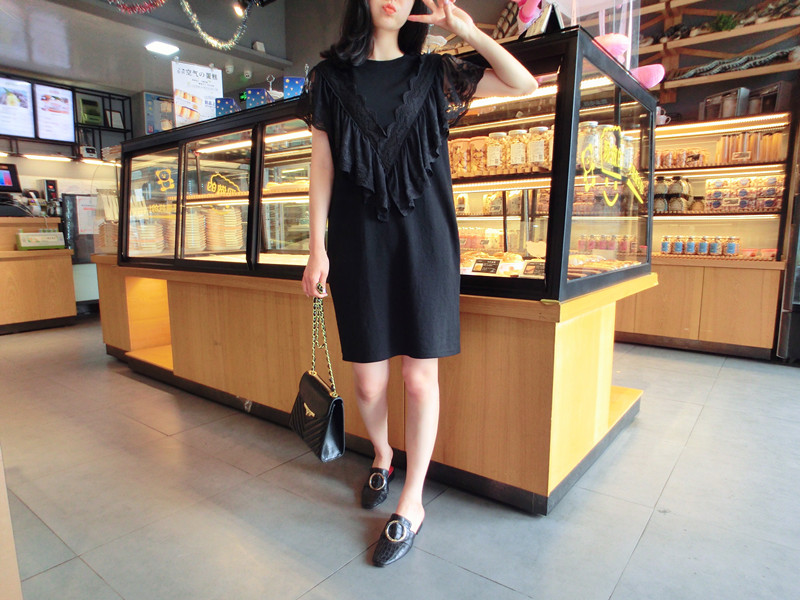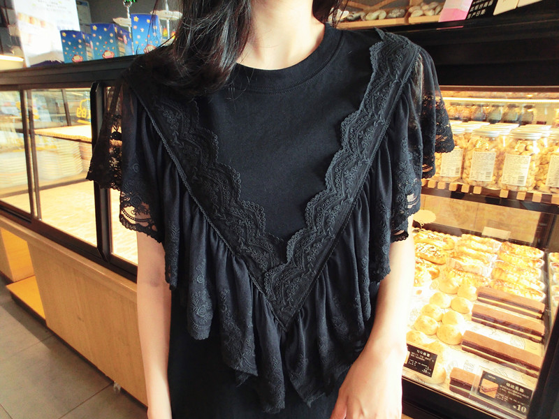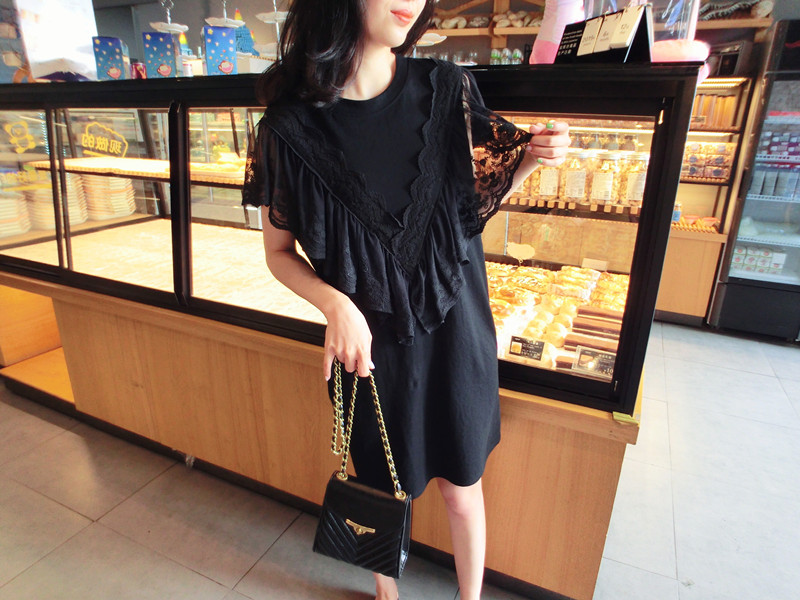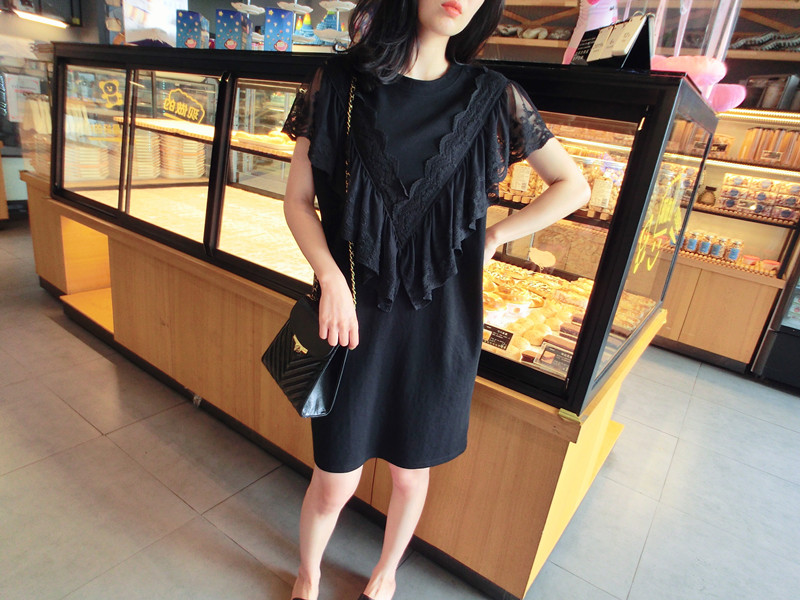 韓國東大門2019夏季新款女裝中長款甜美減齡蕾絲荷葉邊T恤 連衣裙1入