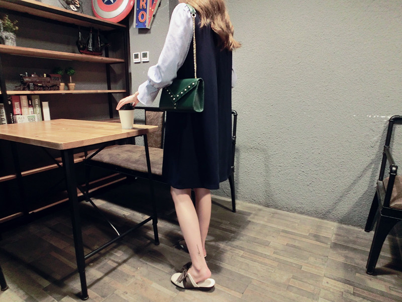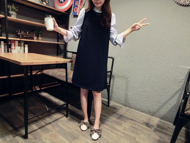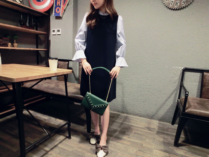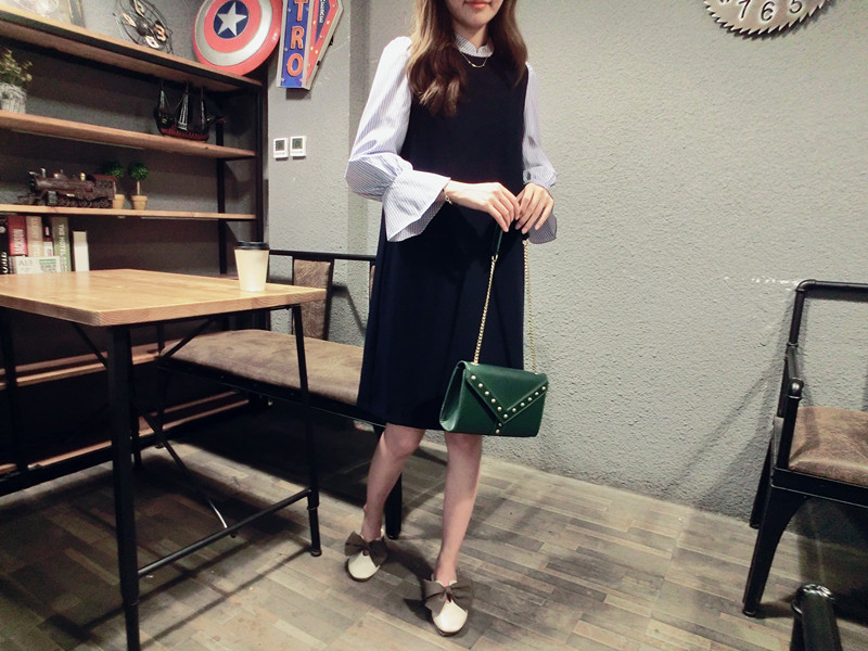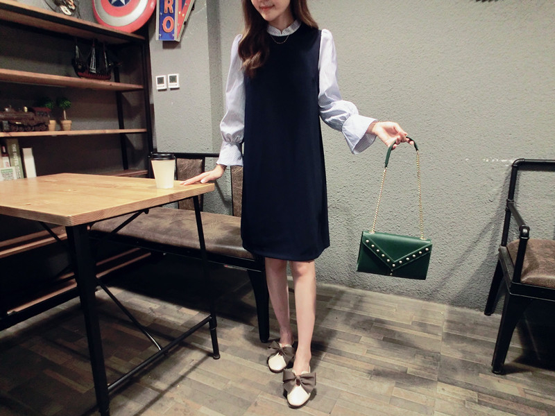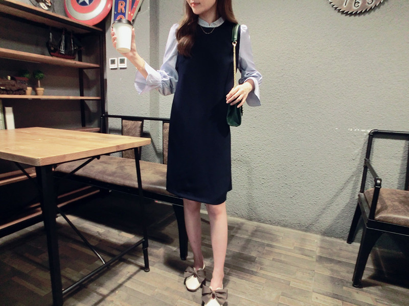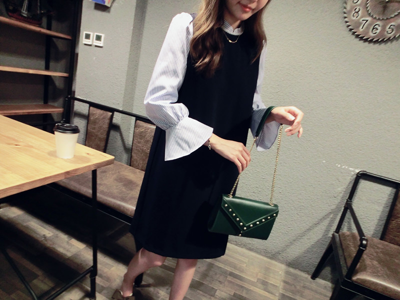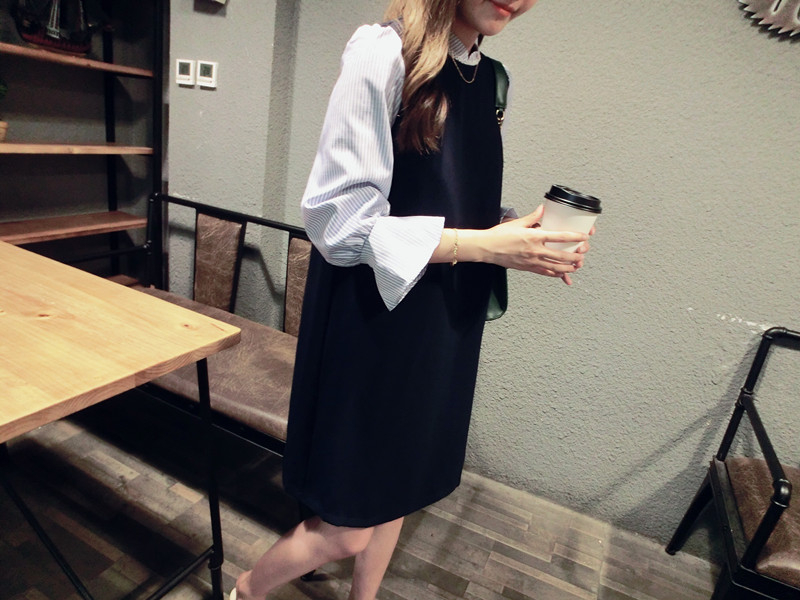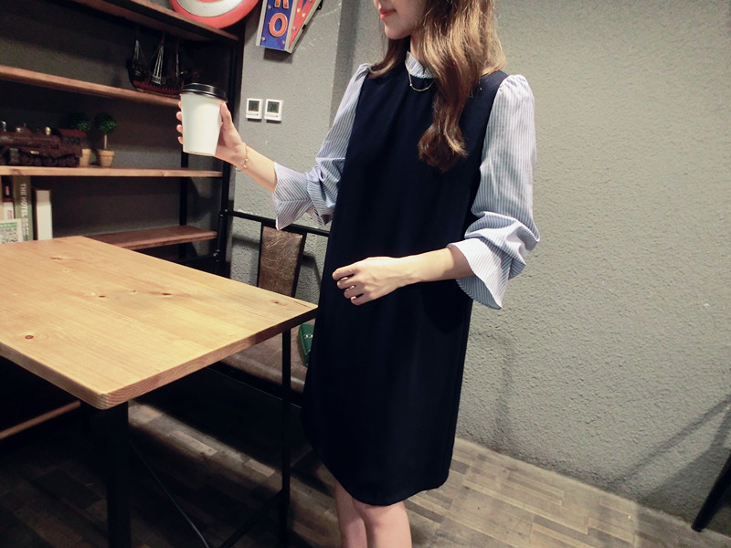 2019秋季時尚新款氣質韓版顯瘦立領喇叭袖韓版休閑中長款連衣裙潮1入