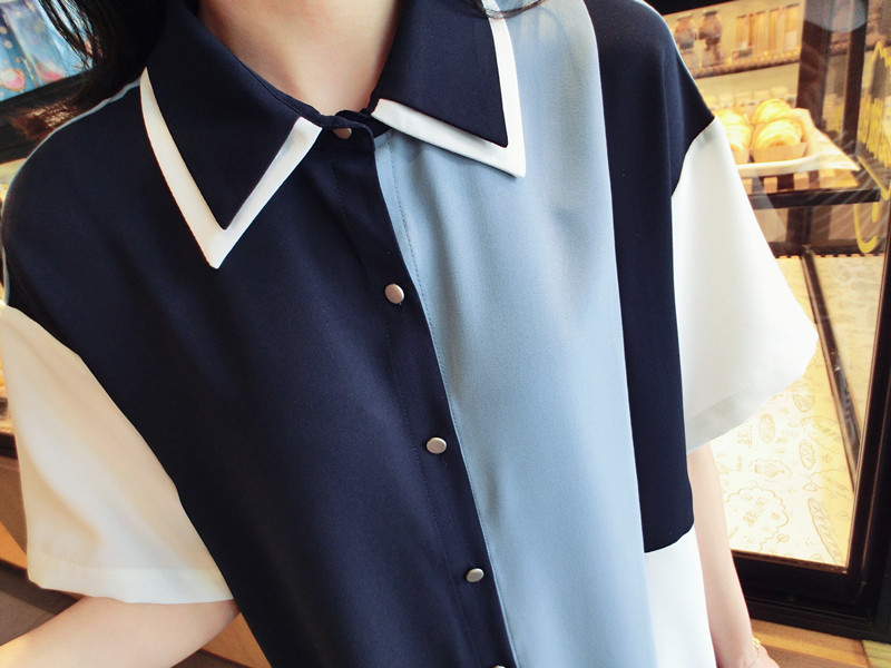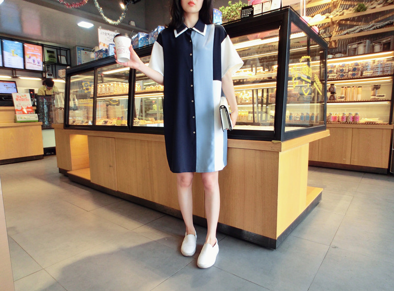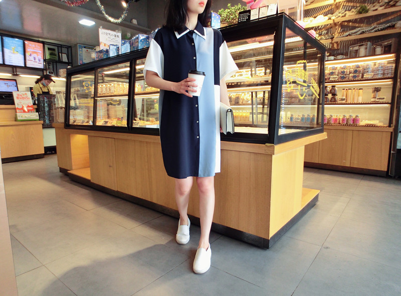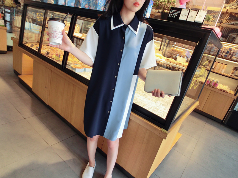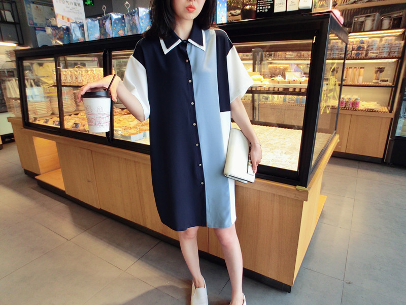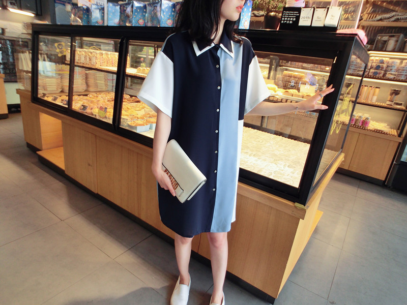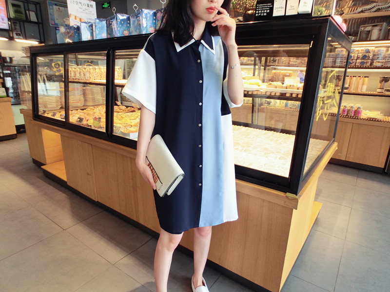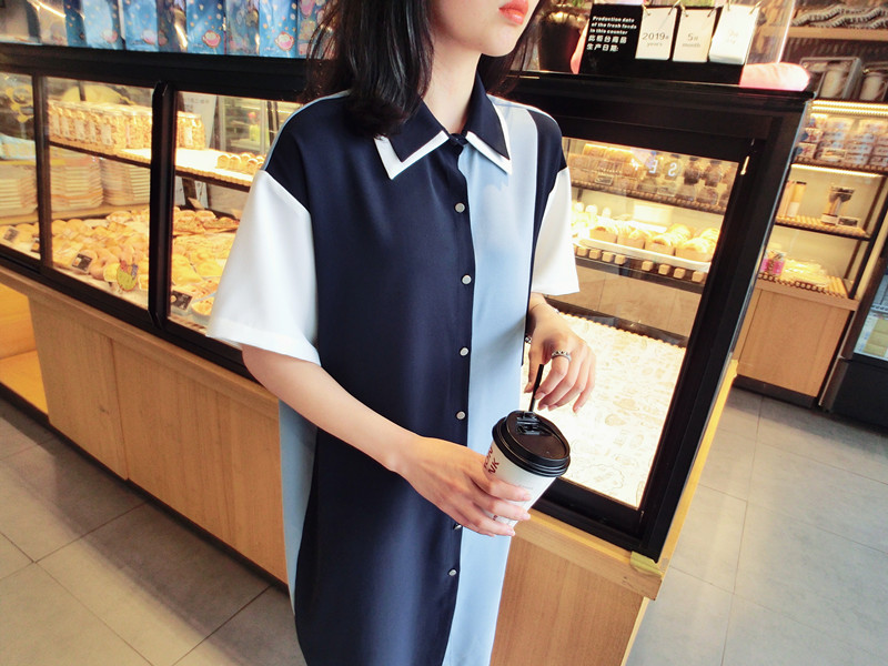雪紡連衣裙女2019夏裝新款韓版女裝小眾設計感拼色中長款襯衫裙1入