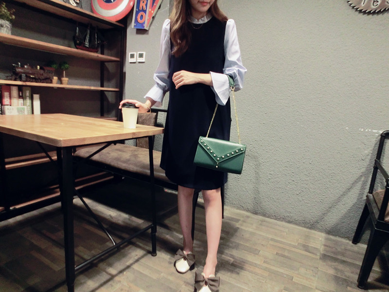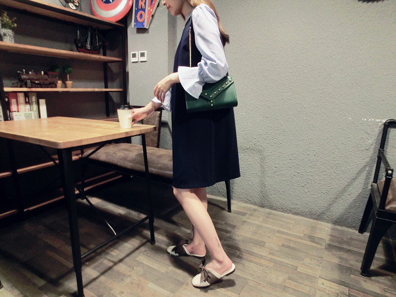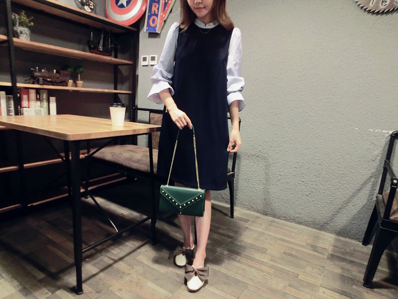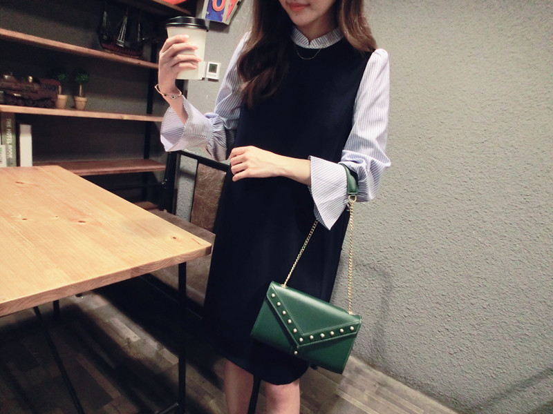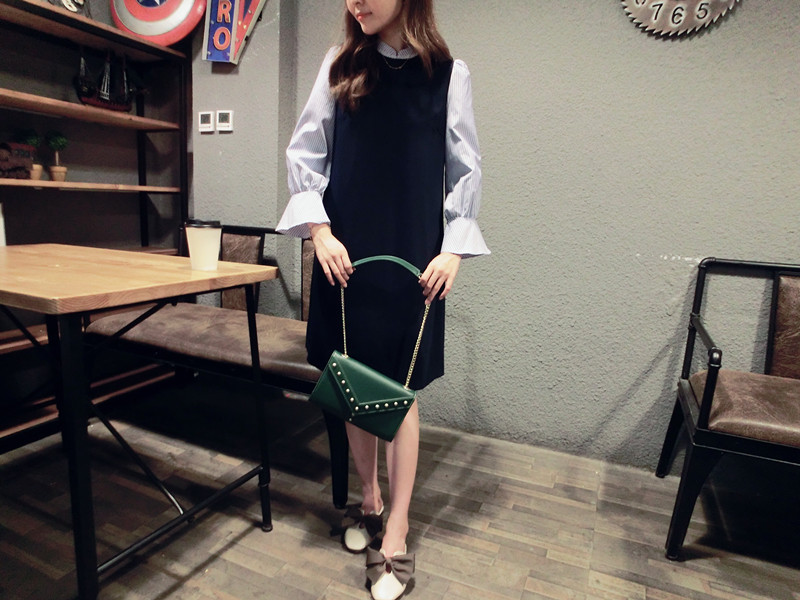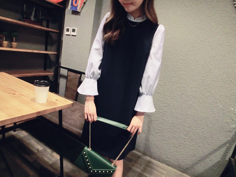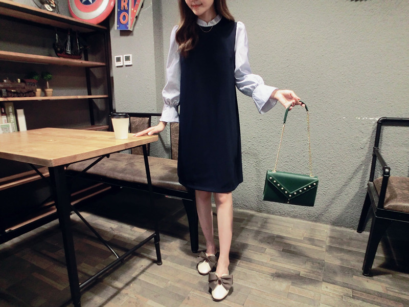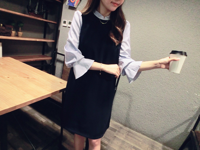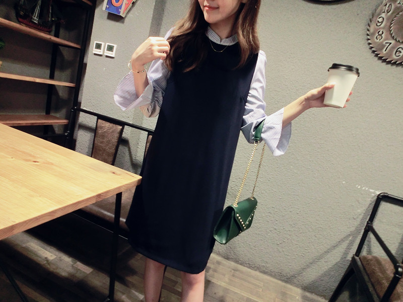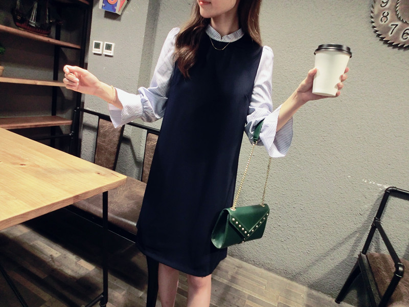 2019春季時尚新款氣質韓版顯瘦立領喇叭袖韓版休閑中長款連衣裙潮1入