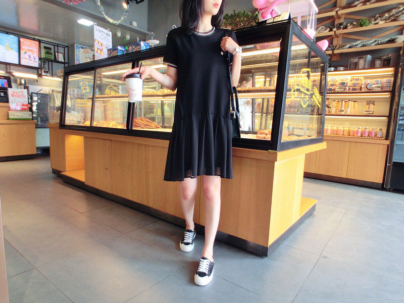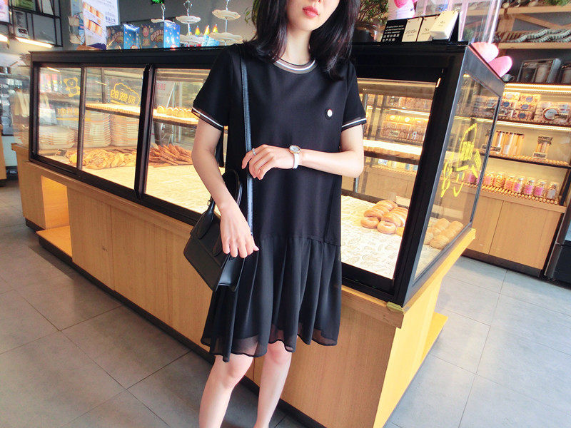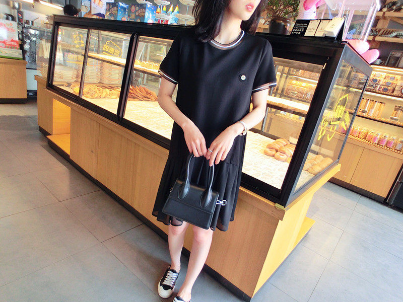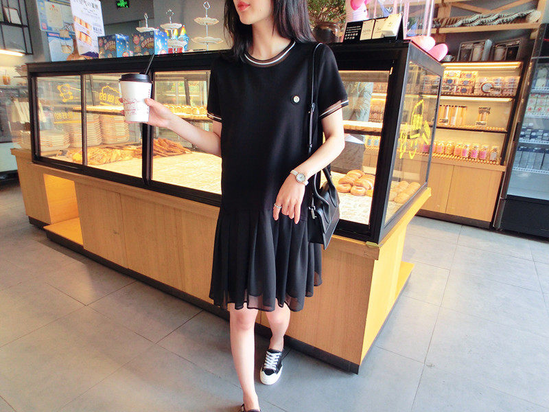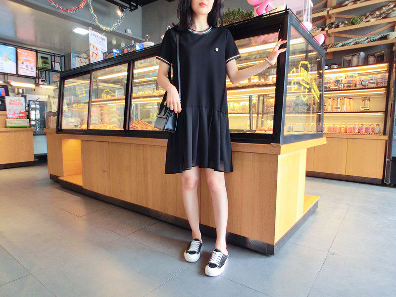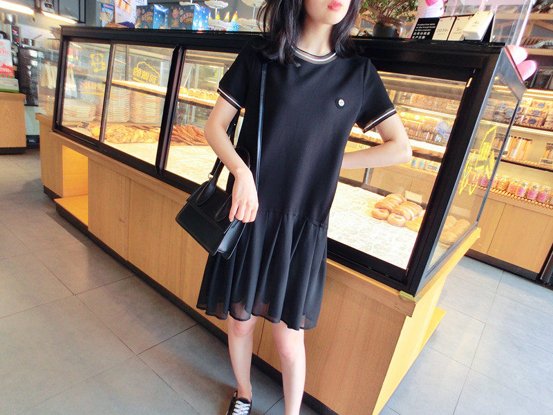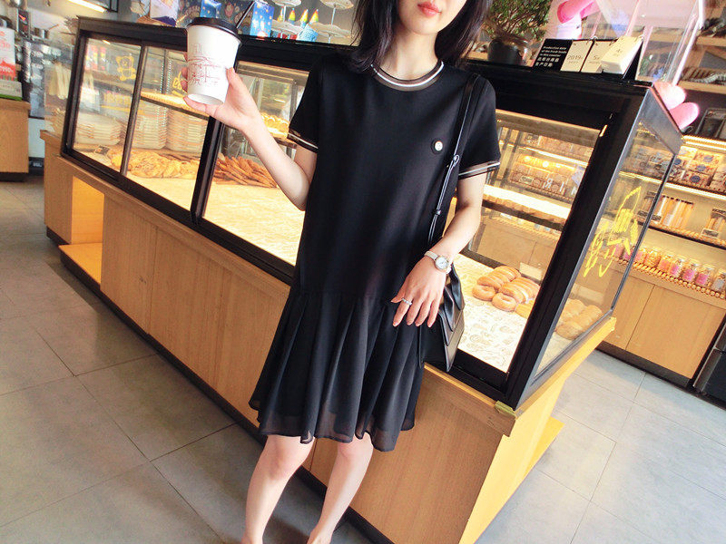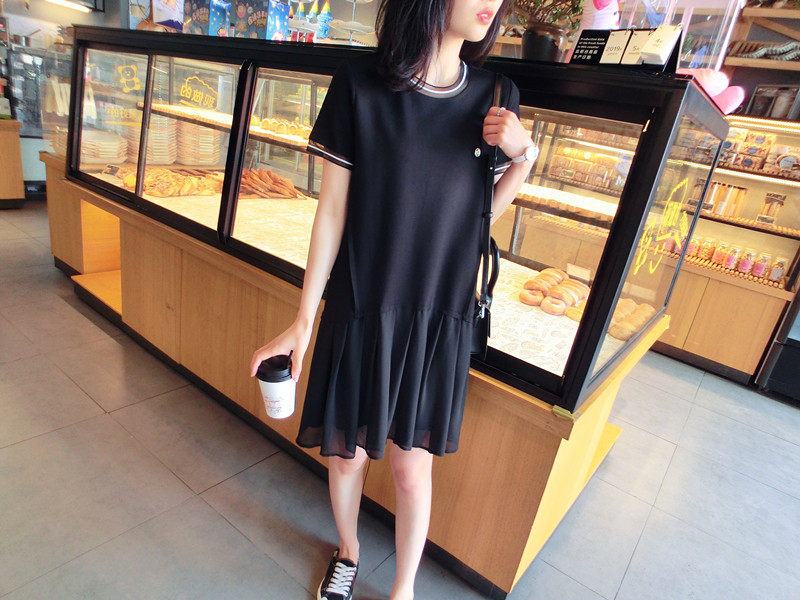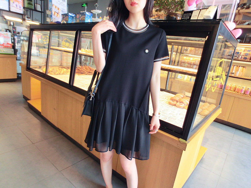 歐洲站2019夏季新款韓版 圓領拼色下擺拼接短袖連衣裙百褶裙A版1入