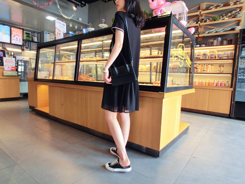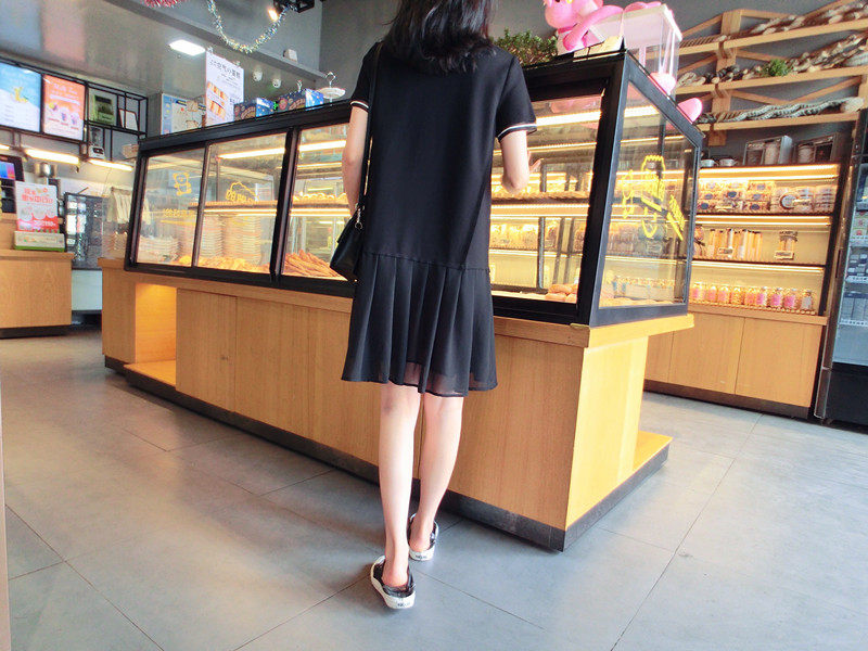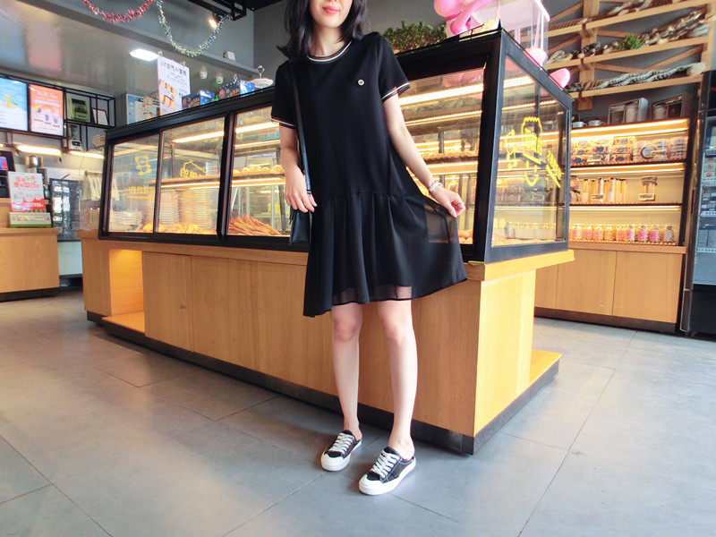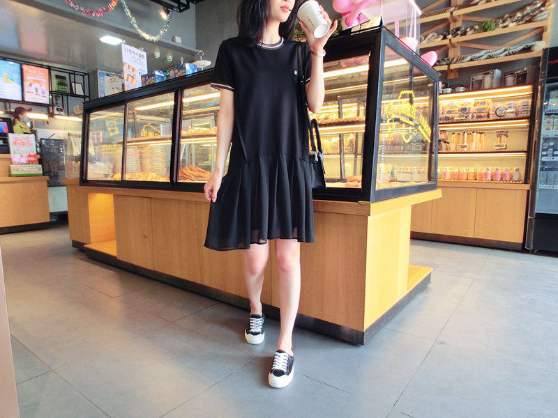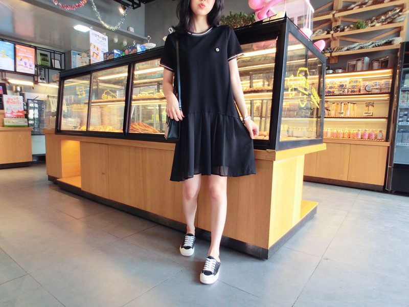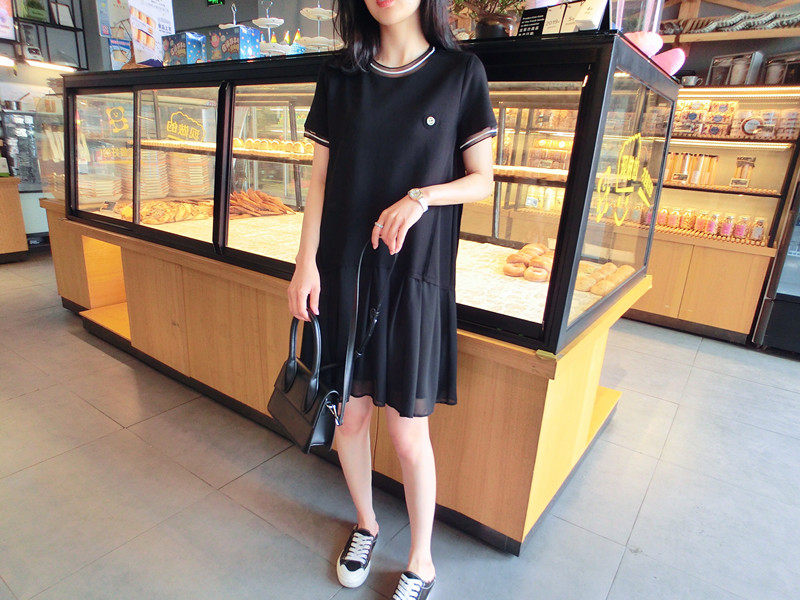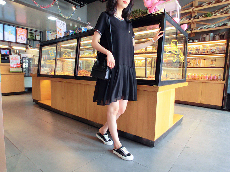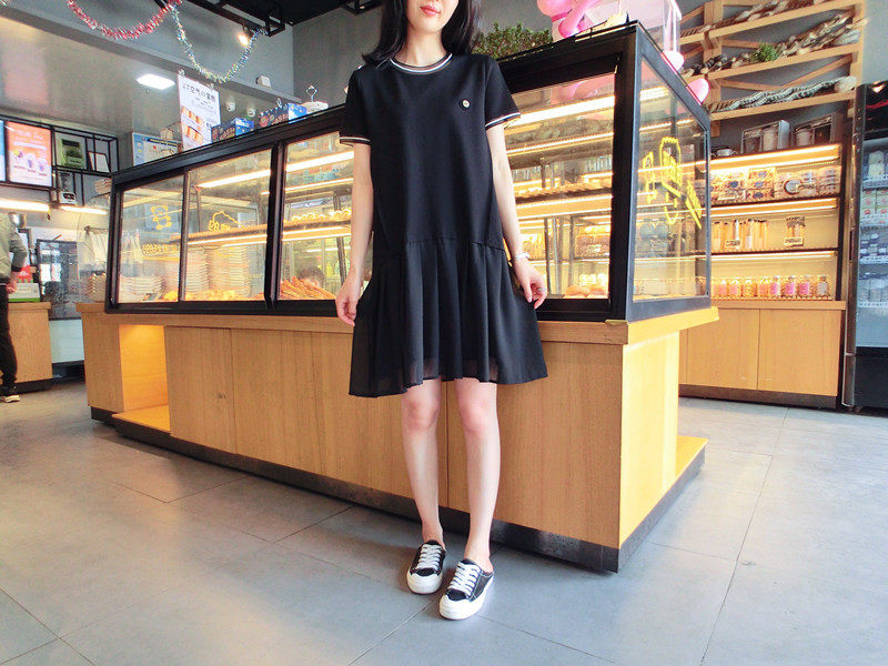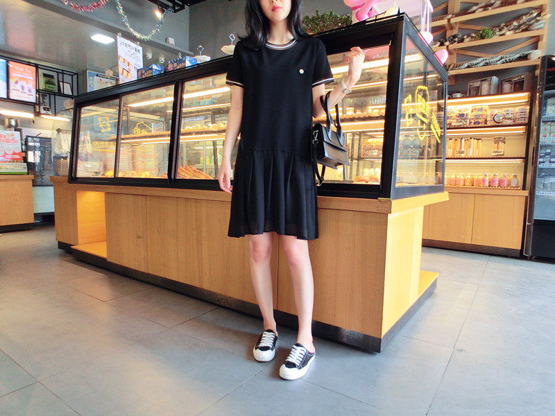 歐洲站2019夏季新款韓版 圓領拼色下擺拼接短袖連衣裙百褶裙A版1入