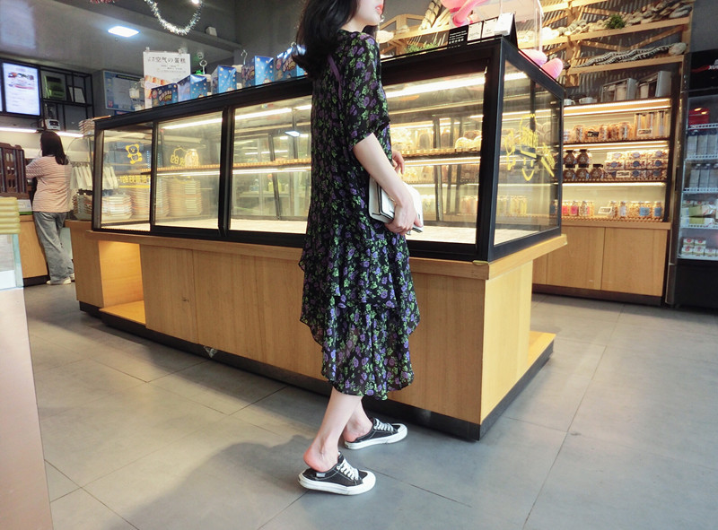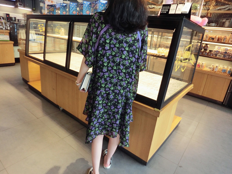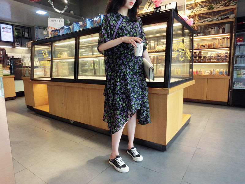 2019夏季新款女裝顯瘦大碼飄逸中長款不規則碎花雪紡連衣裙百搭裙1入