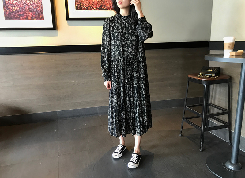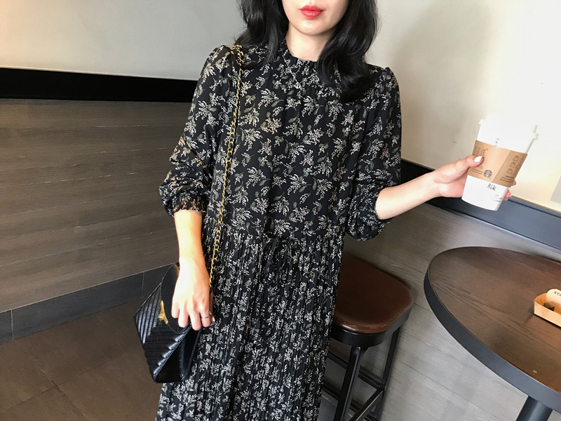 19秋冬新款時尚氣質碎花連衣裙復古慵懶風中長款過膝打底長裙女潮1入