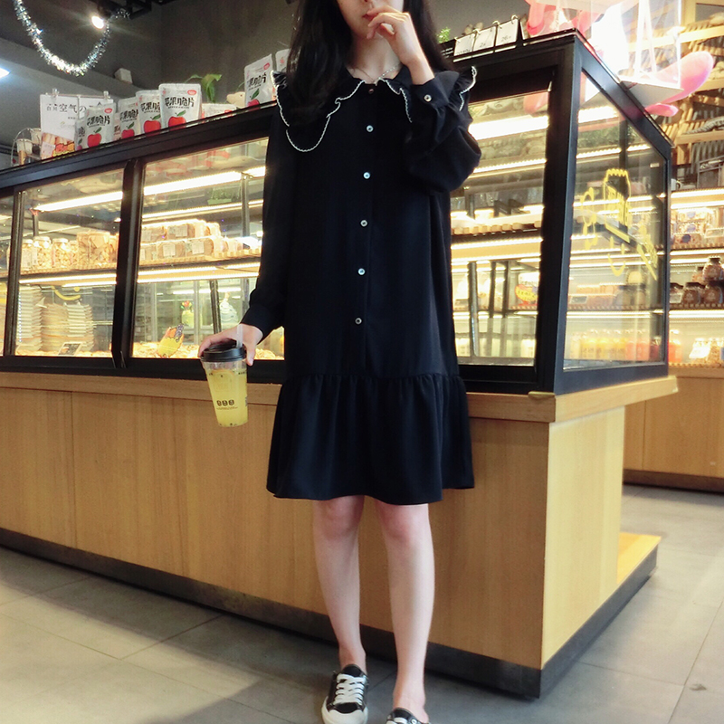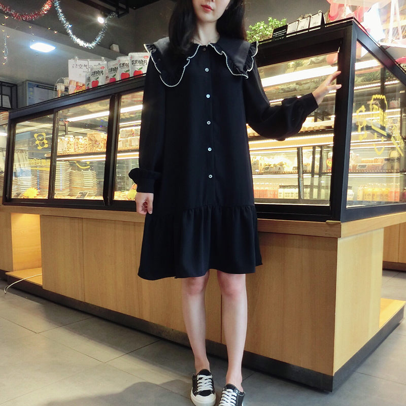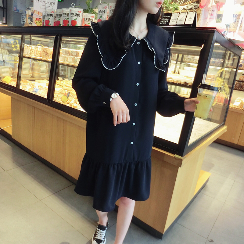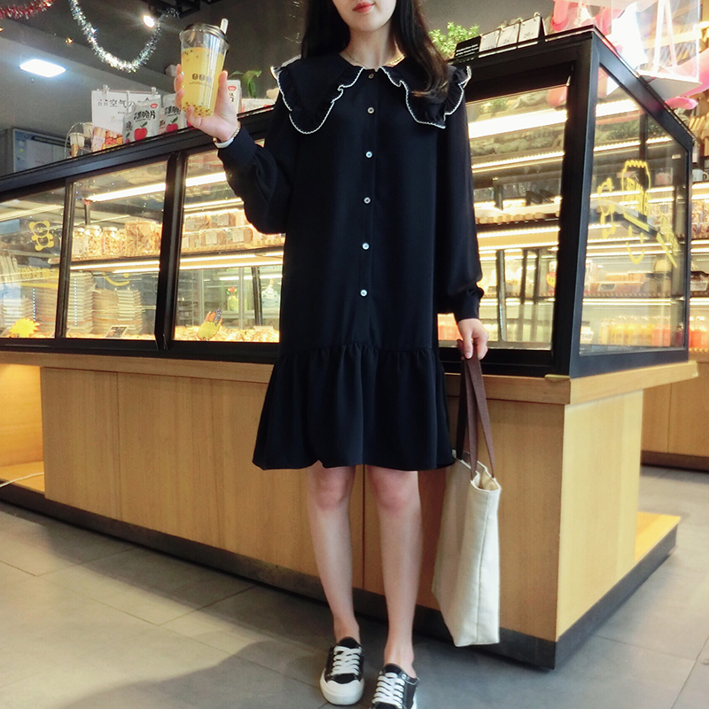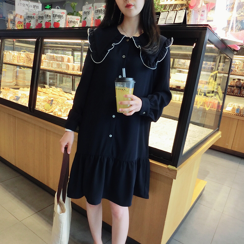 韓版2019春新款連衣裙女娃娃領木耳邊單排扣寬松顯瘦中長款學院風1入