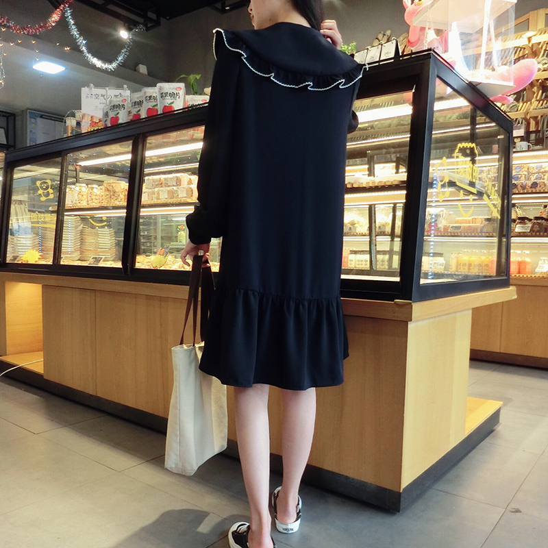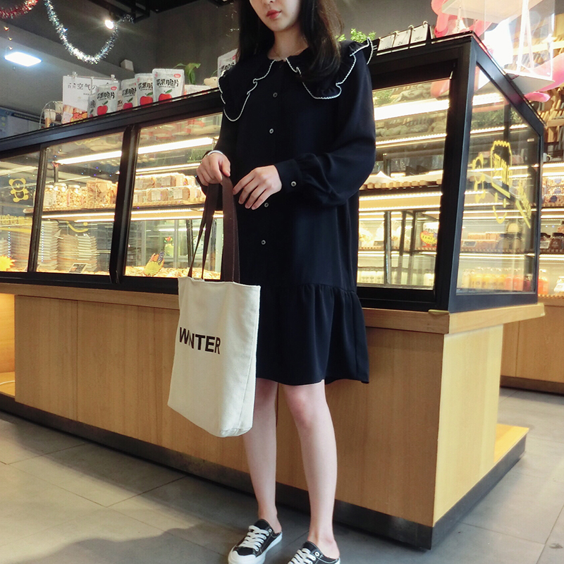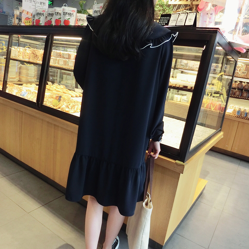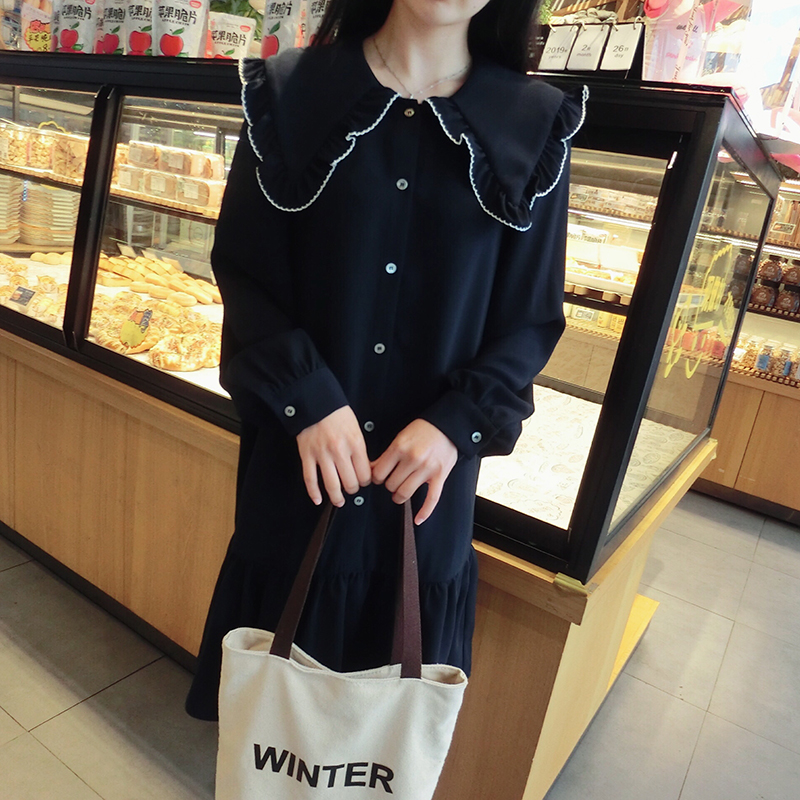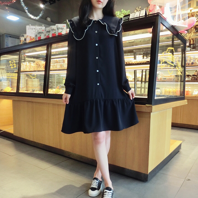 韓版2019春新款連衣裙女娃娃領木耳邊單排扣寬松顯瘦中長款學院風1入