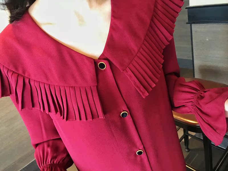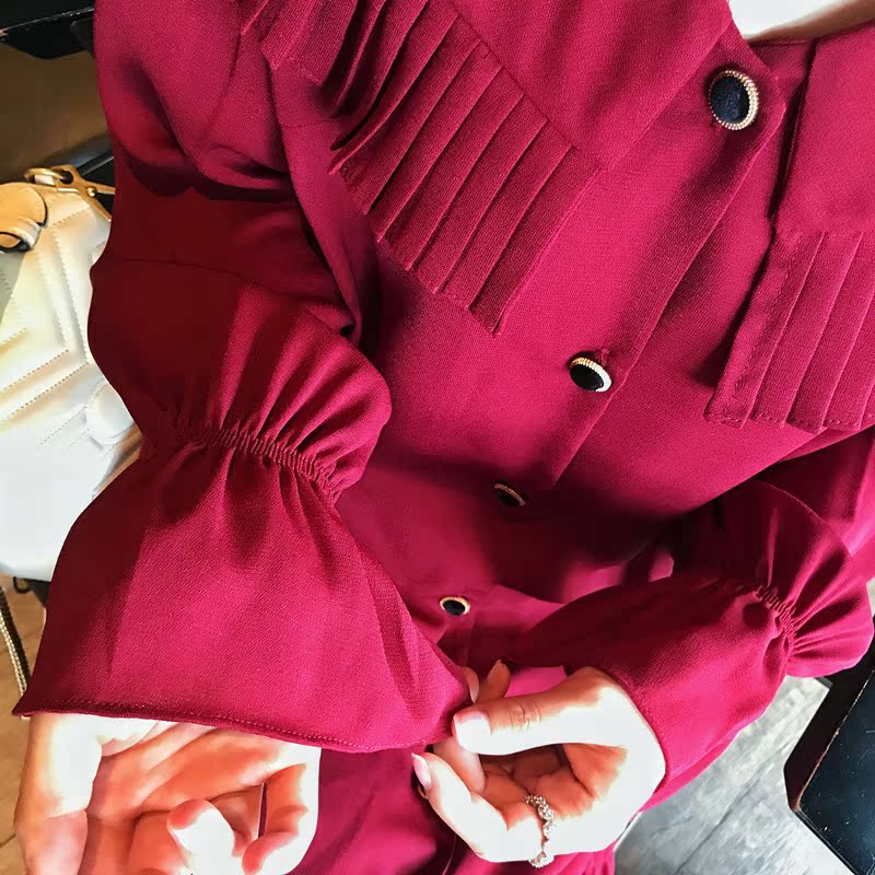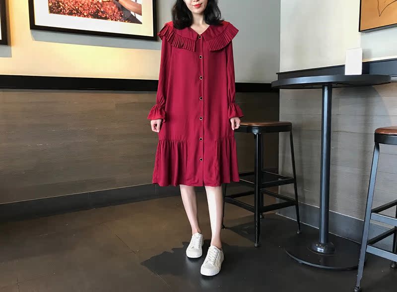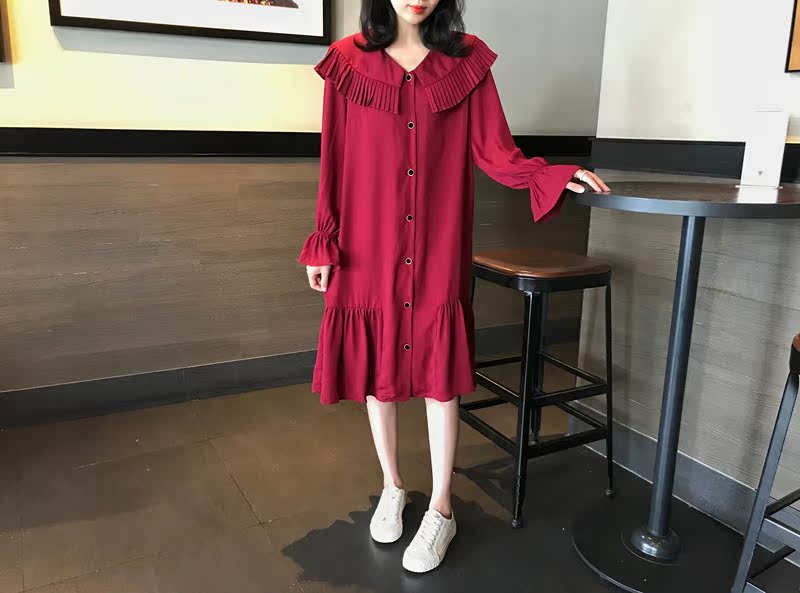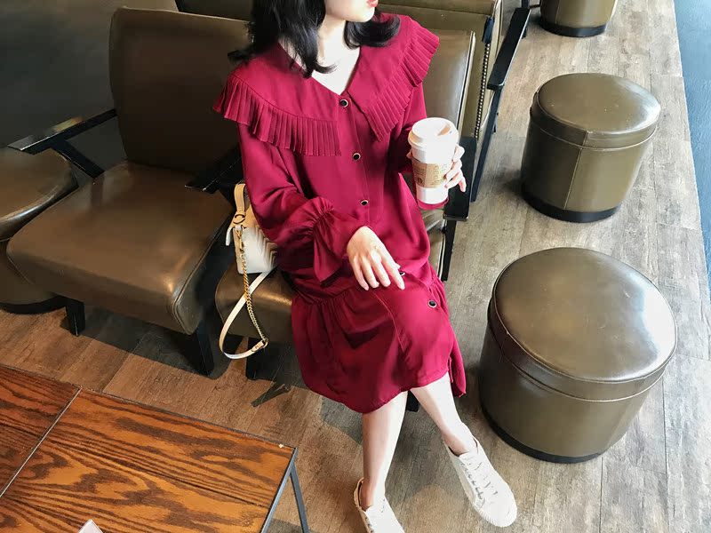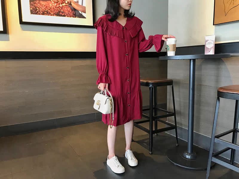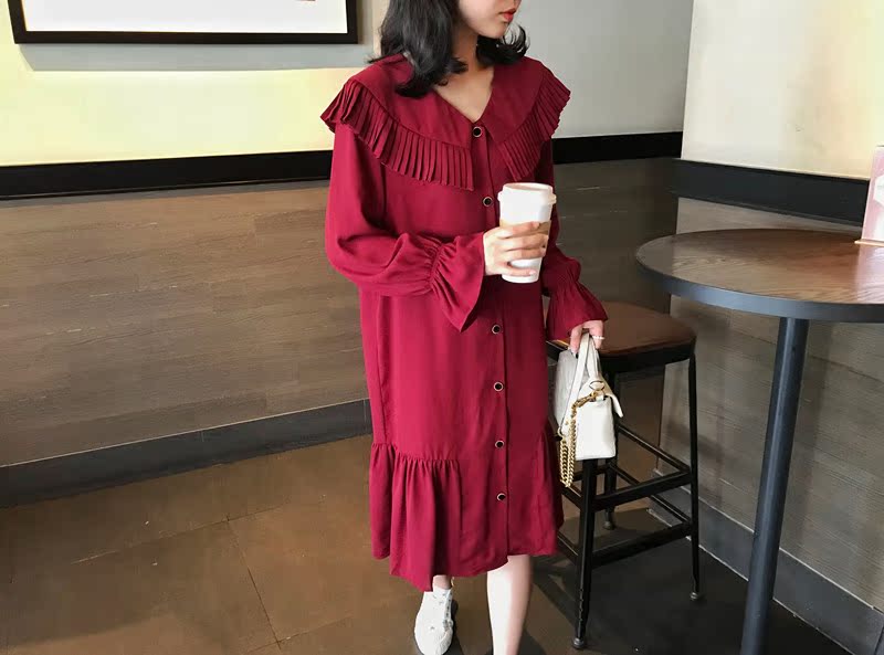 韓國東大門19秋季新款減齡法式小清新娃娃領長袖喇叭袖氣質連衣裙1入