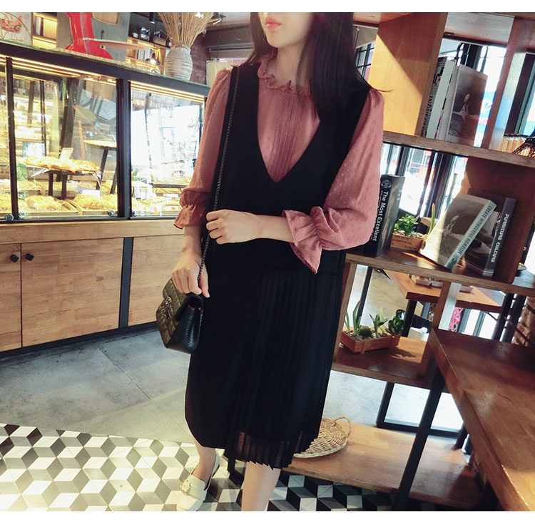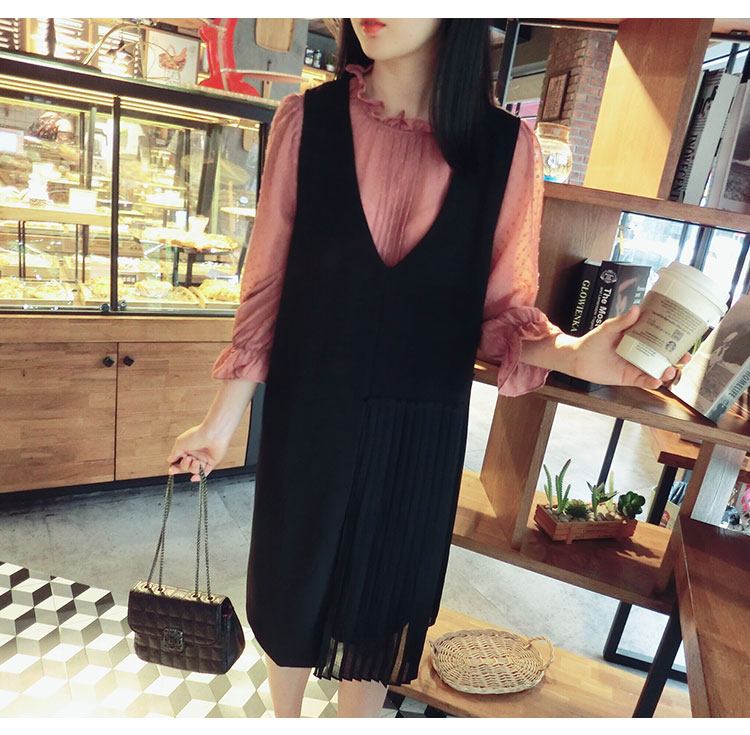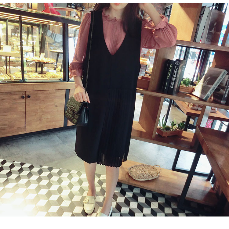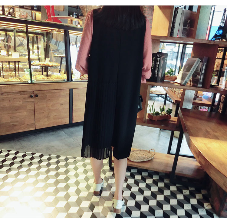 中長款2019秋季新款女裝韓版寬松百褶擺雪紡大碼背心連衣裙1入